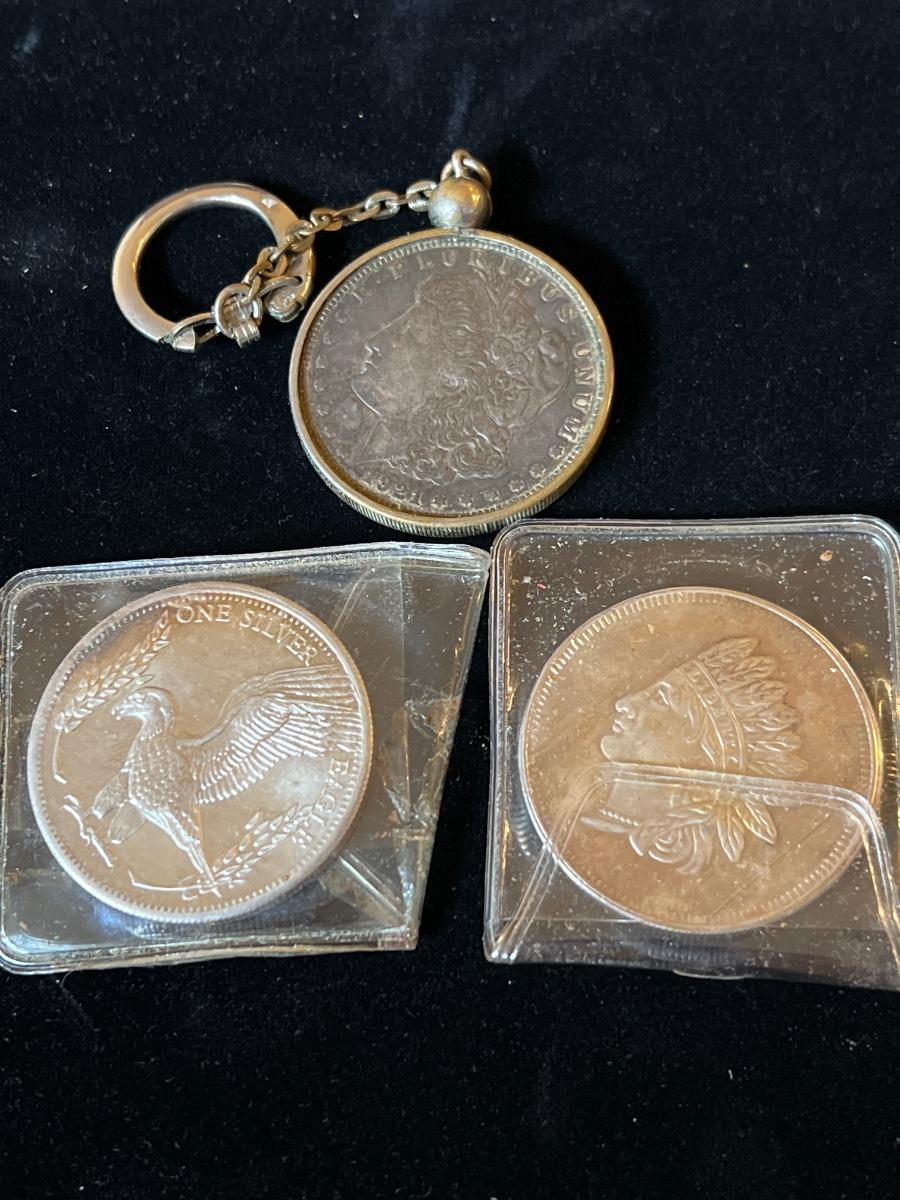 1922 silver dollar on a key chain., Indian head one Troy ounce, Silver Eagle 1 ounce.