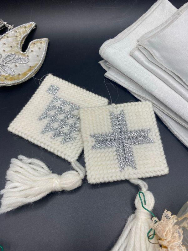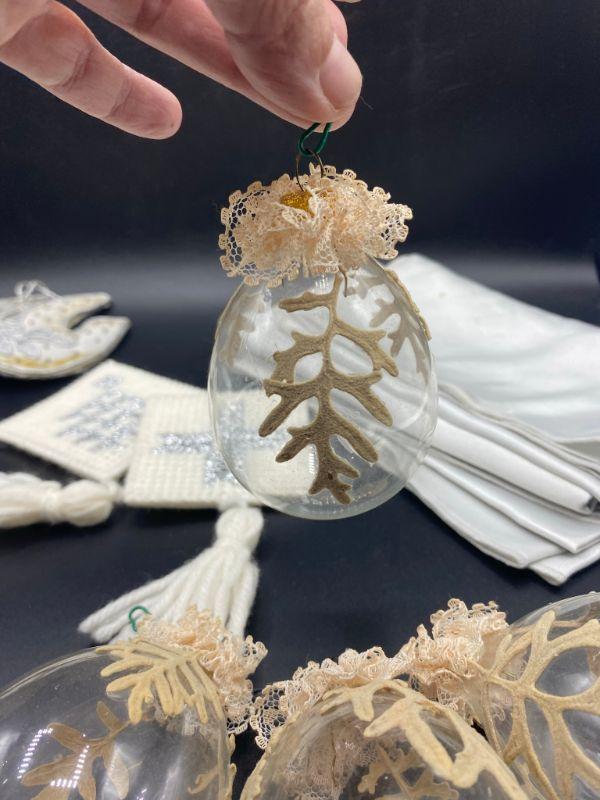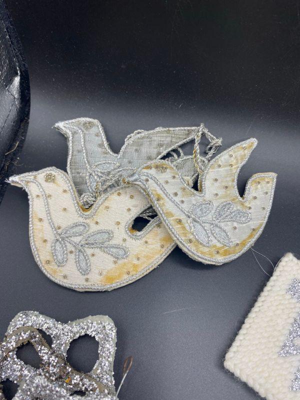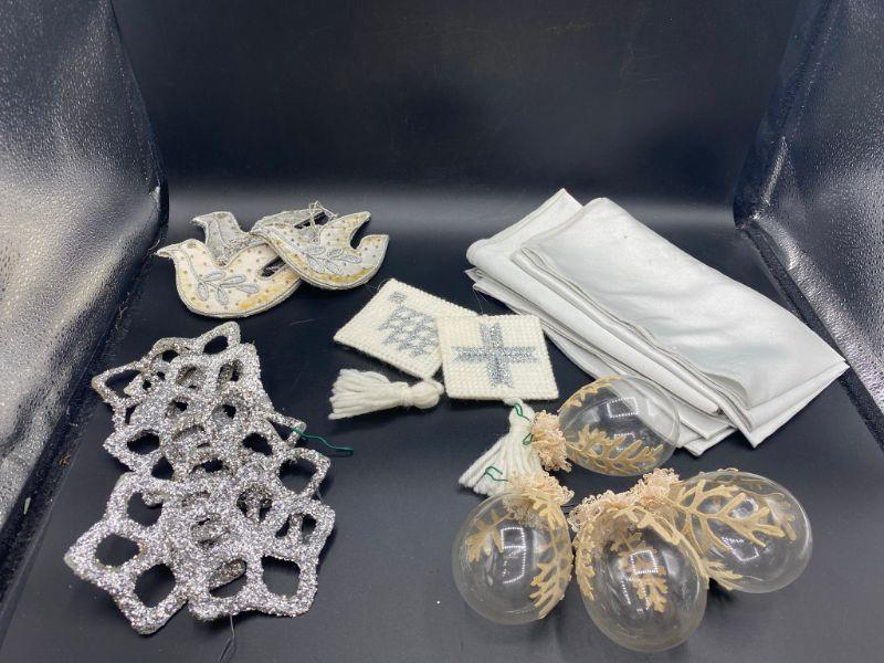 Lot of silver holiday decor. Cloth napkins, felt birds, and homemade decorations. There is some discoloration the the birds and napkin edge.