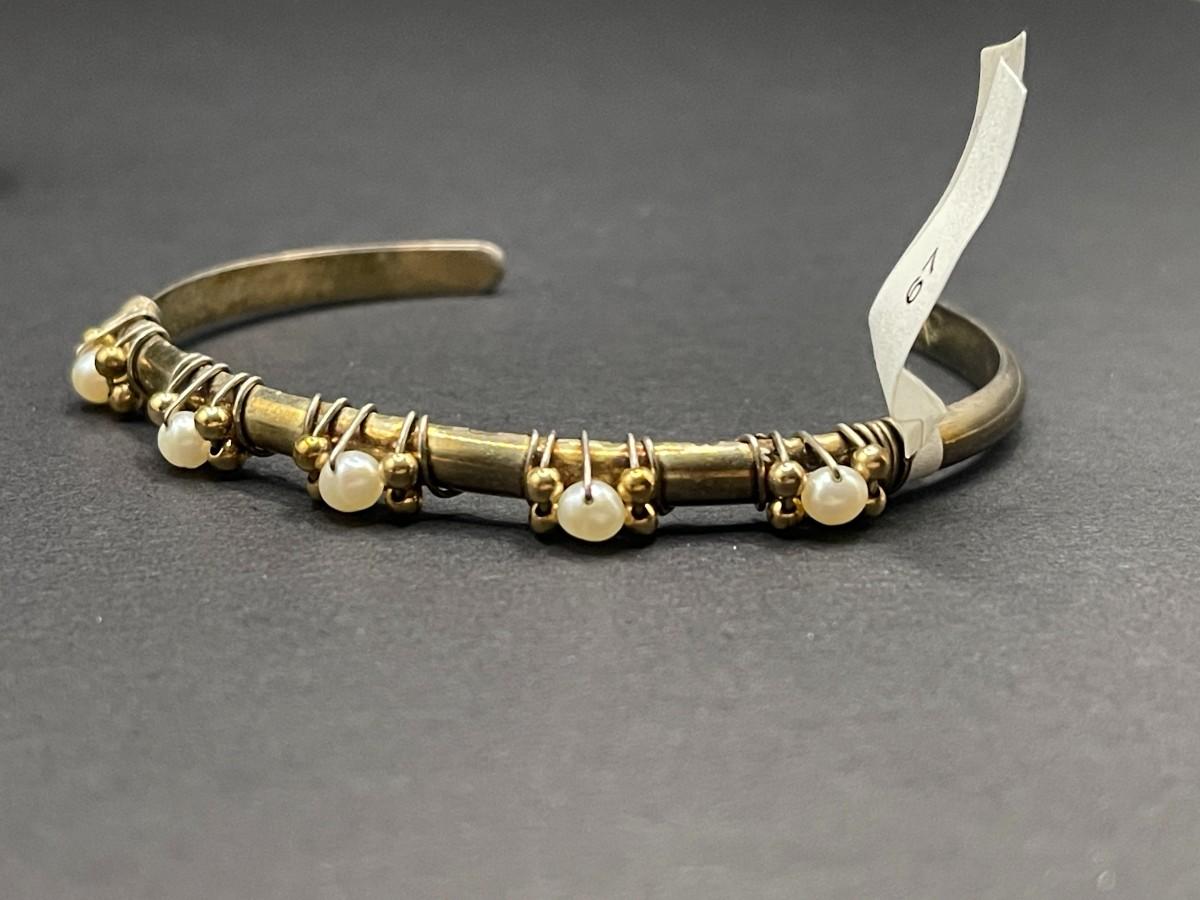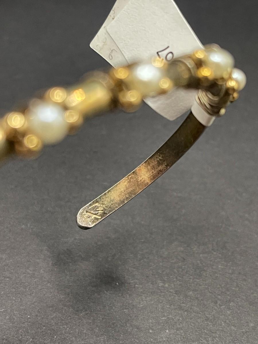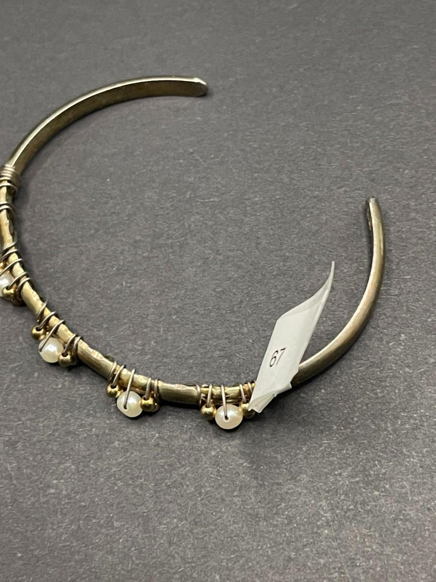 Silver cuff bracelet with wire wrapped pearls and gold tone beads. .36 ozt. 7 1/2". Fair condition