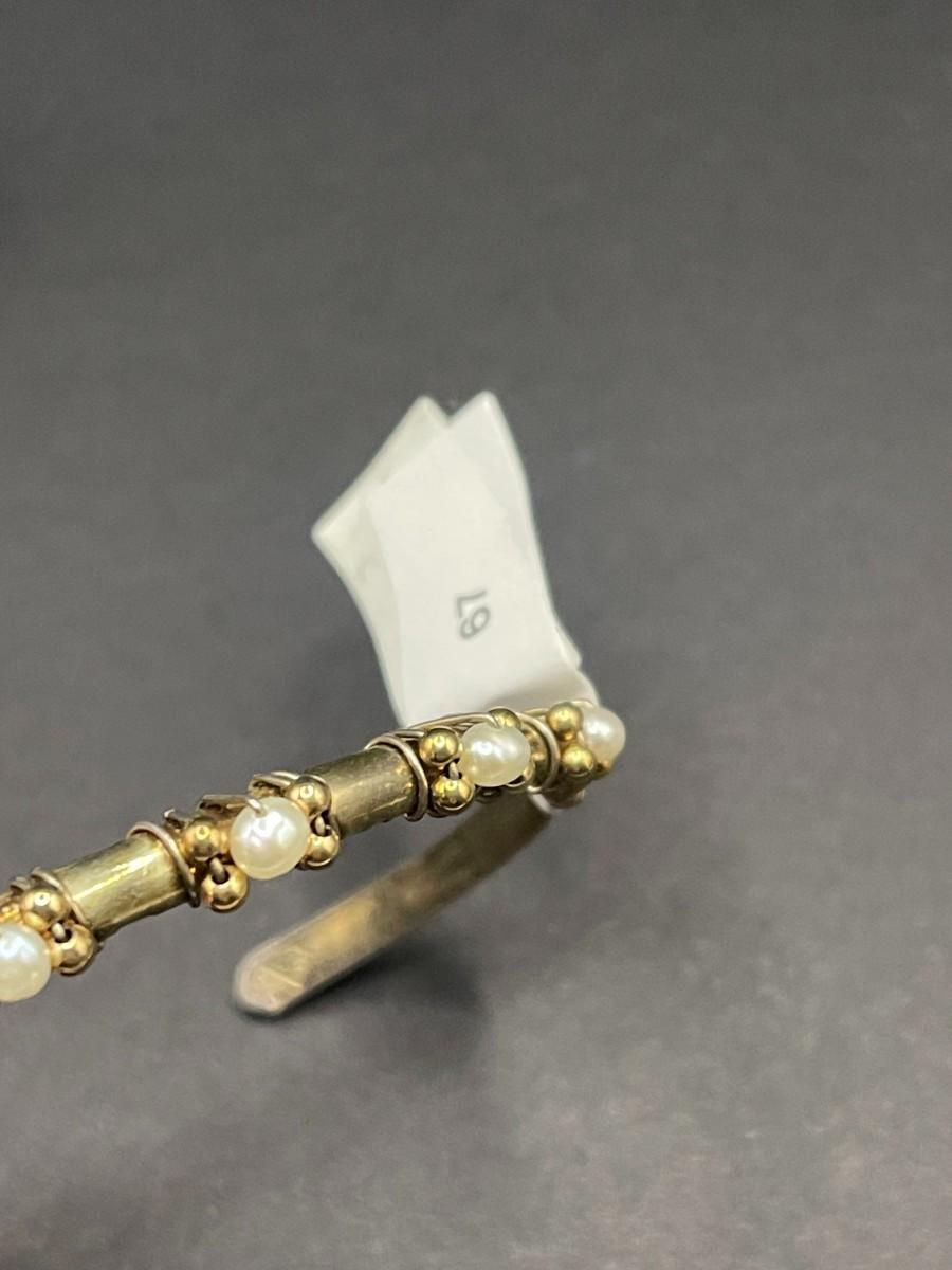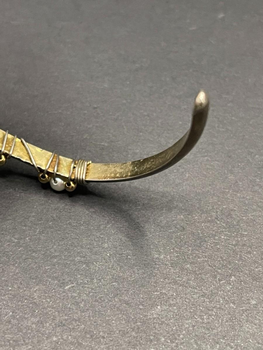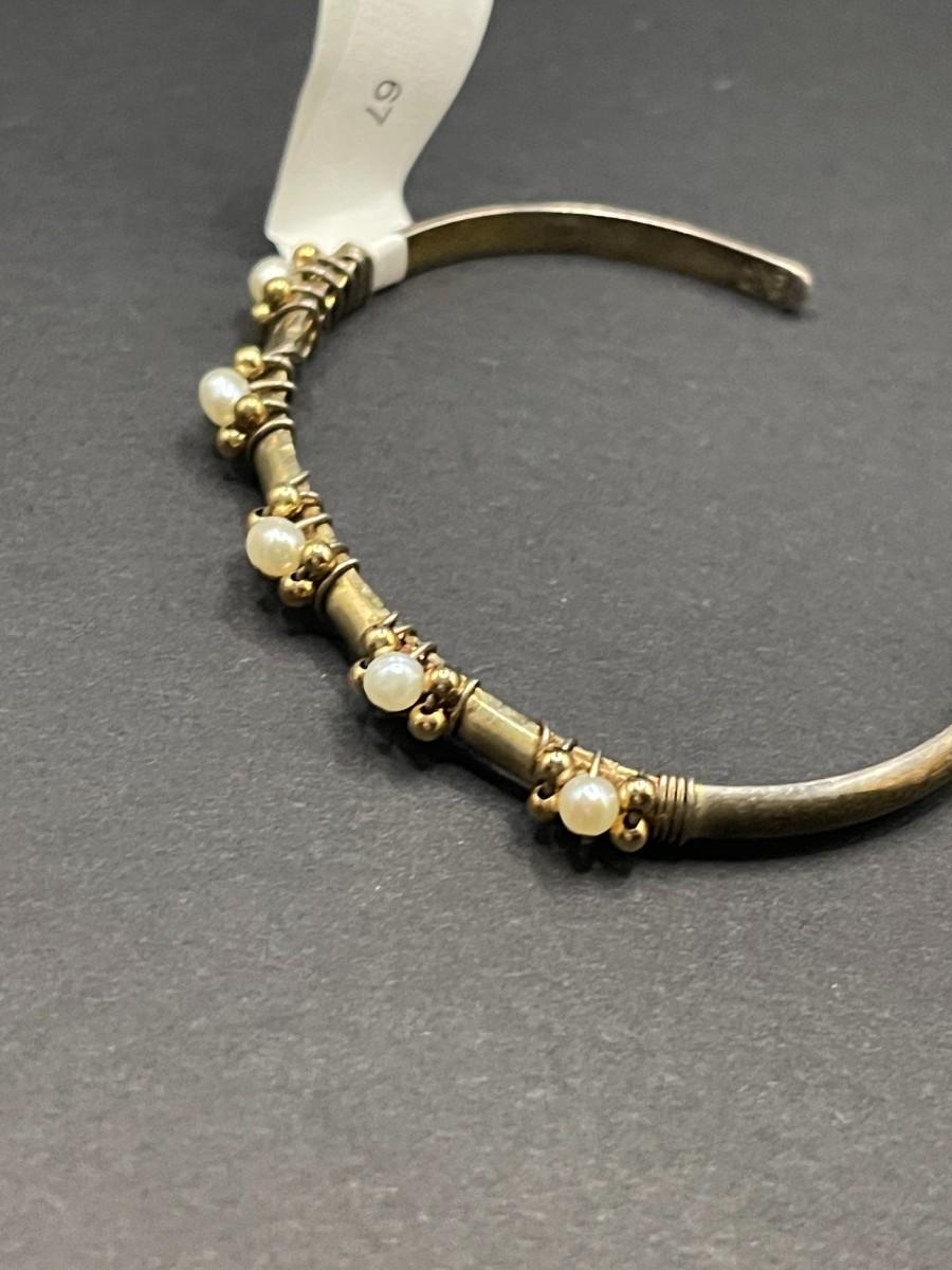 Silver cuff bracelet with wire wrapped pearls and gold tone beads. .36 ozt. 7 1/2". Fair condition