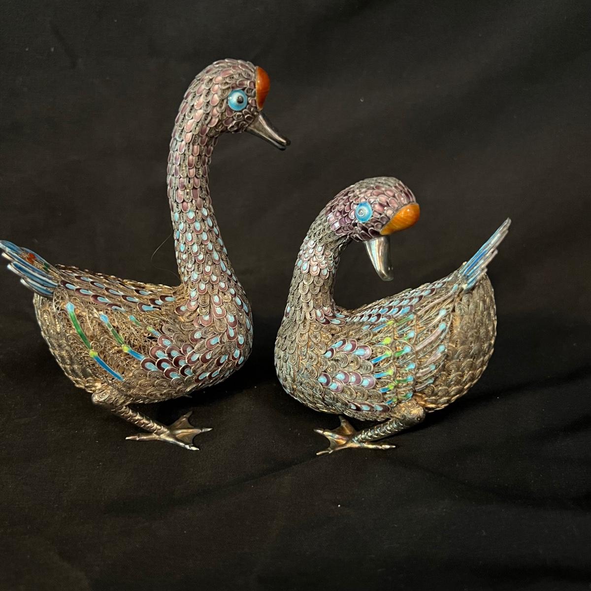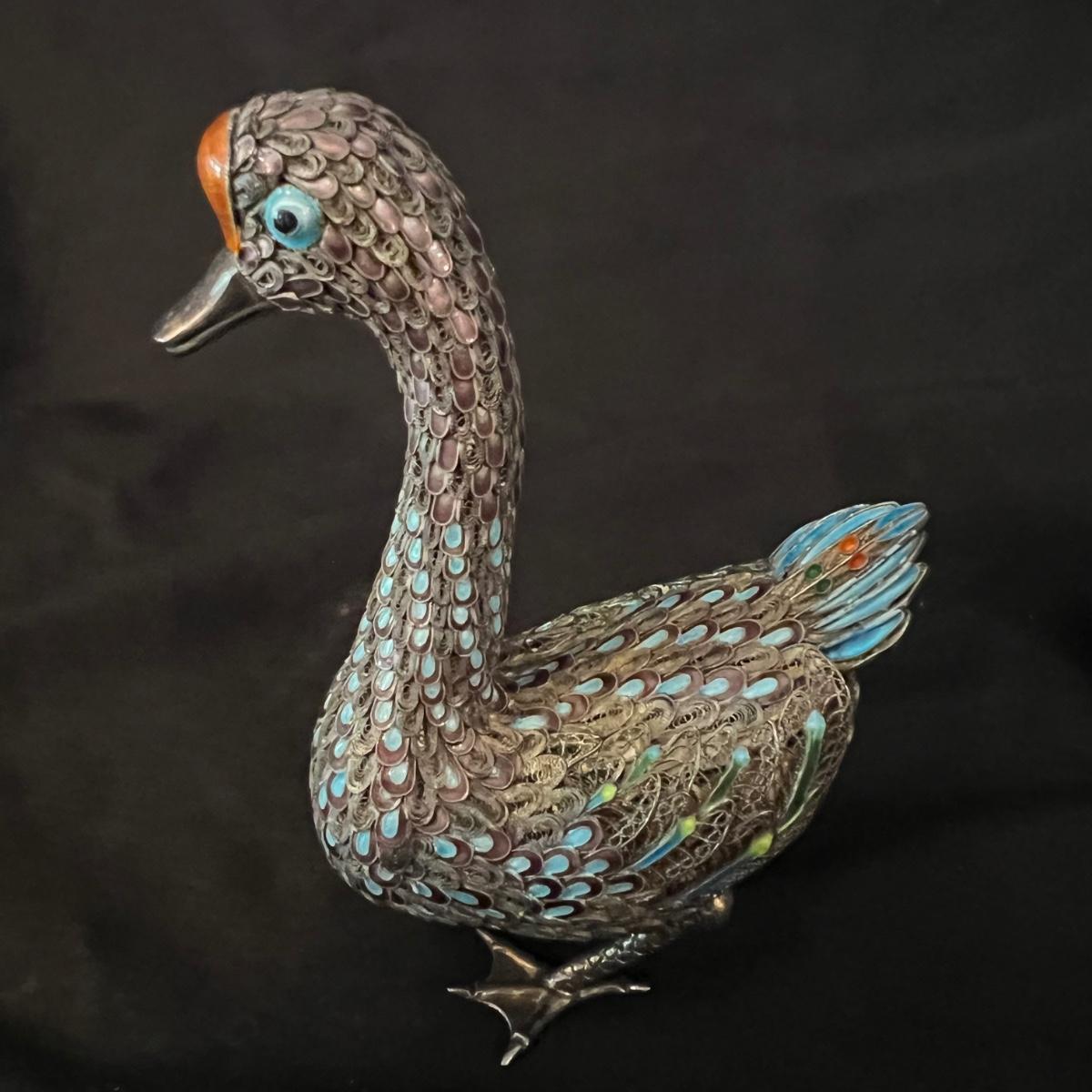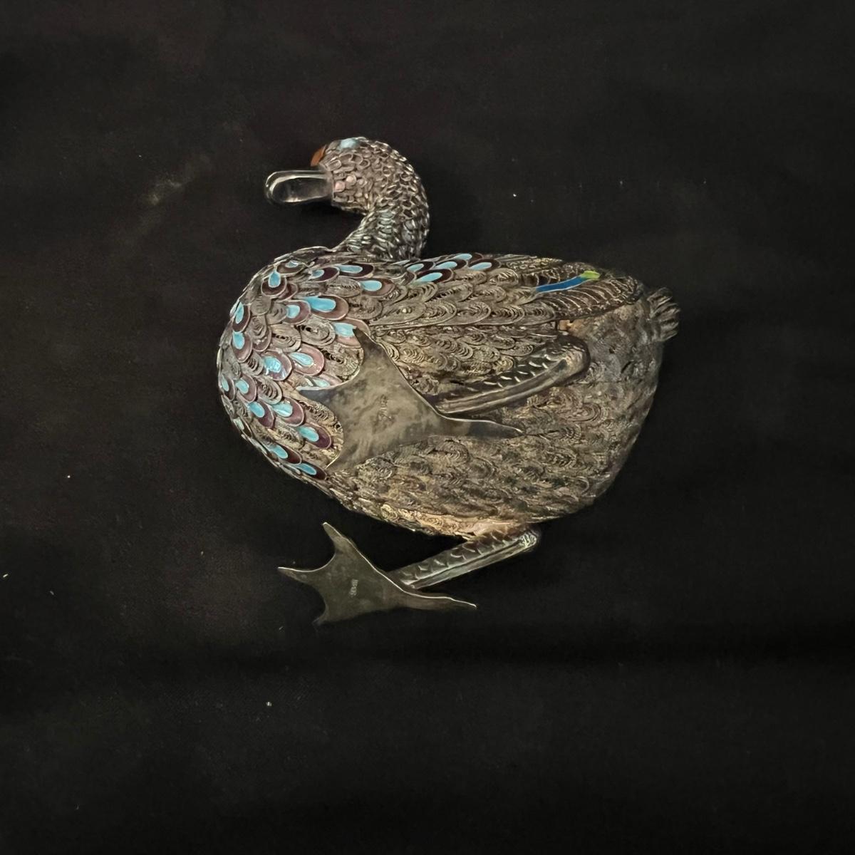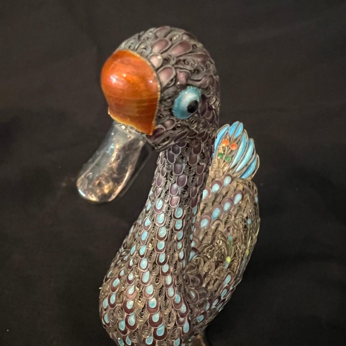 Two very detailed duck figurines. Each with extensive detail and ornamentation in silver and what appears to be cloisonné.. The standing upright duck measures 3.5" X 2"" X 7.5"H.