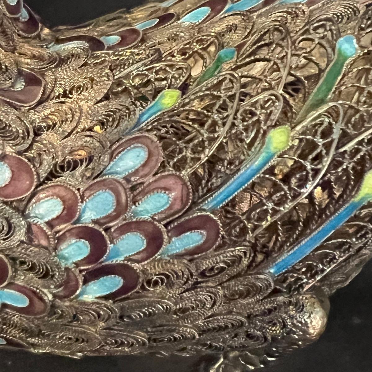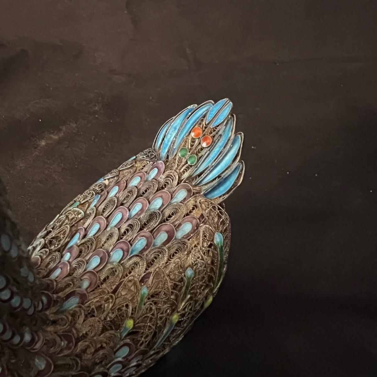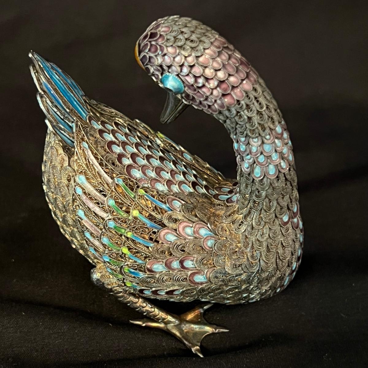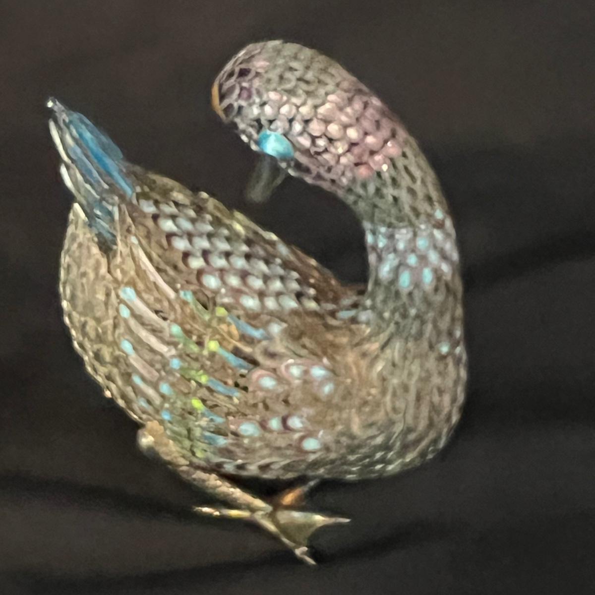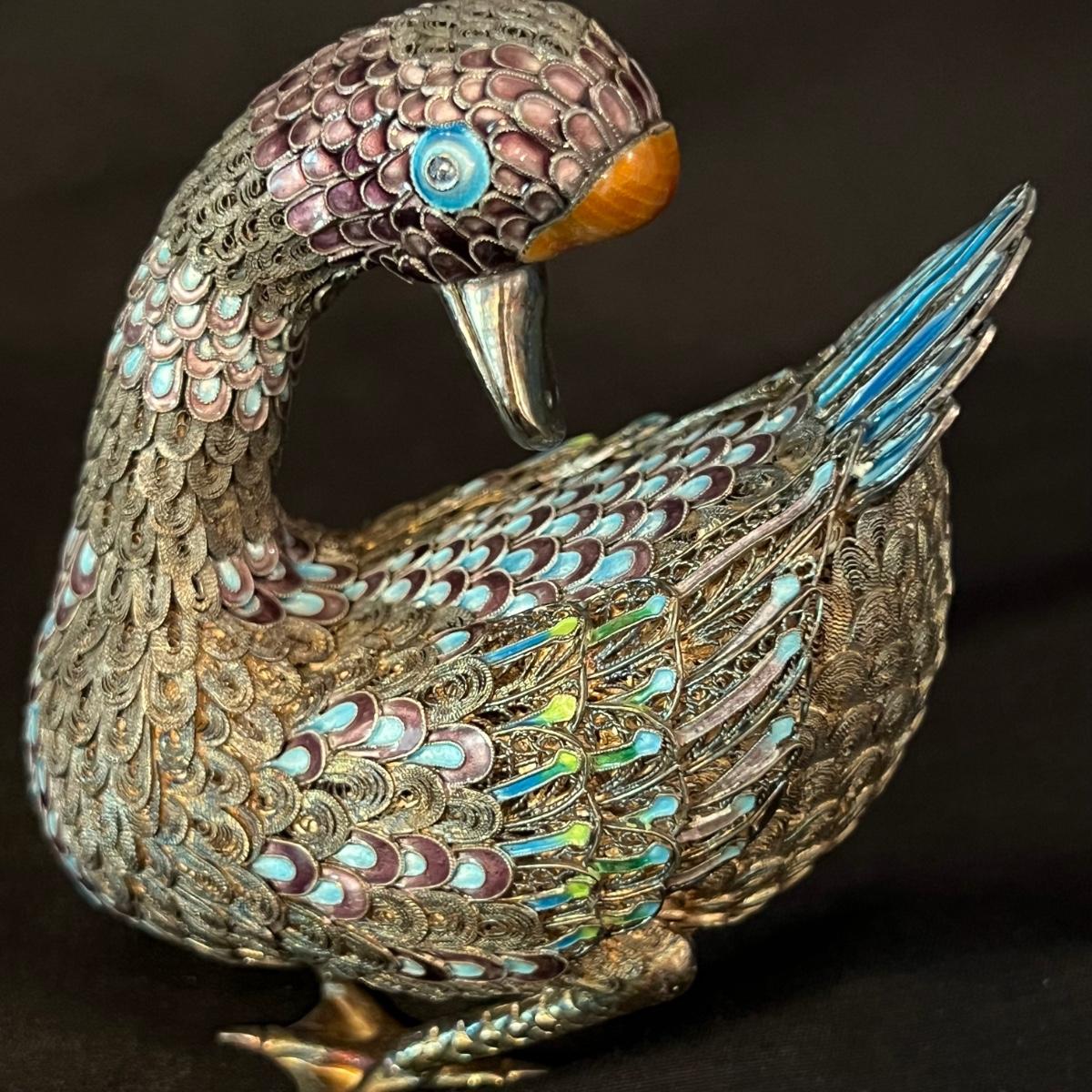 Two very detailed duck figurines. Each with extensive detail and ornamentation in silver and what appears to be cloisonné.. The standing upright duck measures 3.5" X 2"" X 7.5"H.