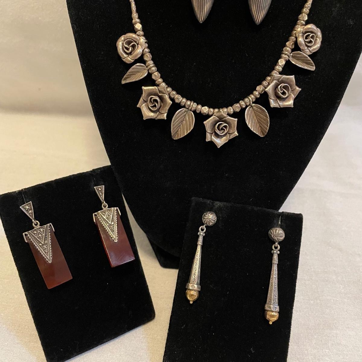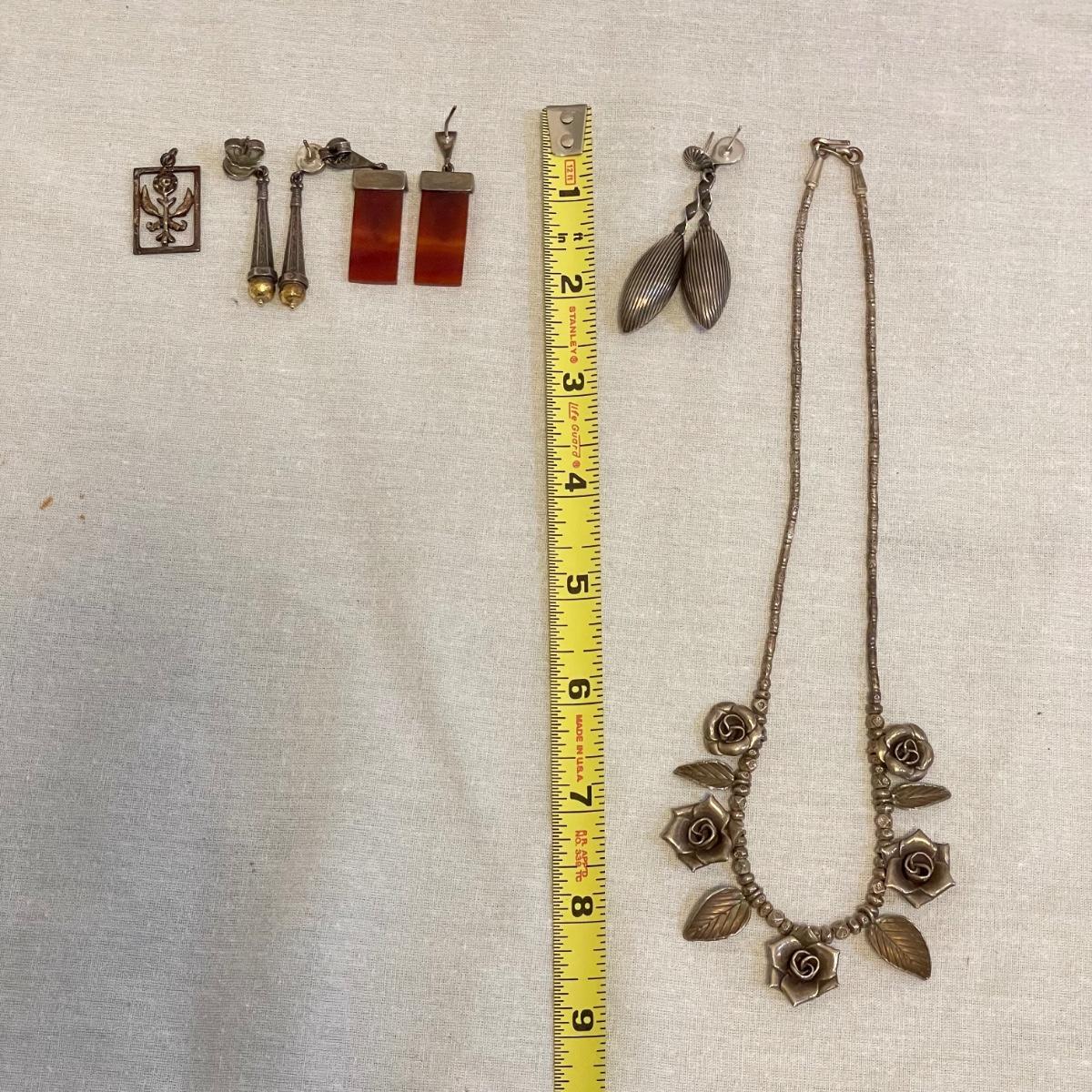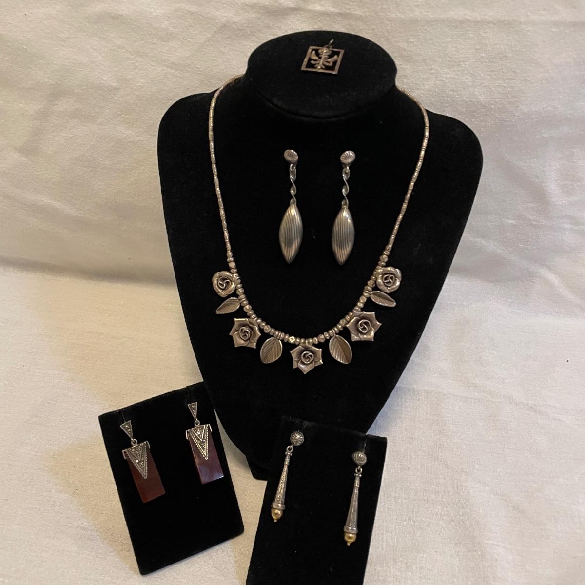 Three pairs of long silver dangle earrings for pierced ears, a rose necklace and petite pendant. Most items have a look of sterling, but the only known sterling marking is on the two-toned gold/silver colored pair. Earrings have two backs included. See photos for measurements. Shipping available. All sales are final. No returns or refunds. Please bid accordingly.