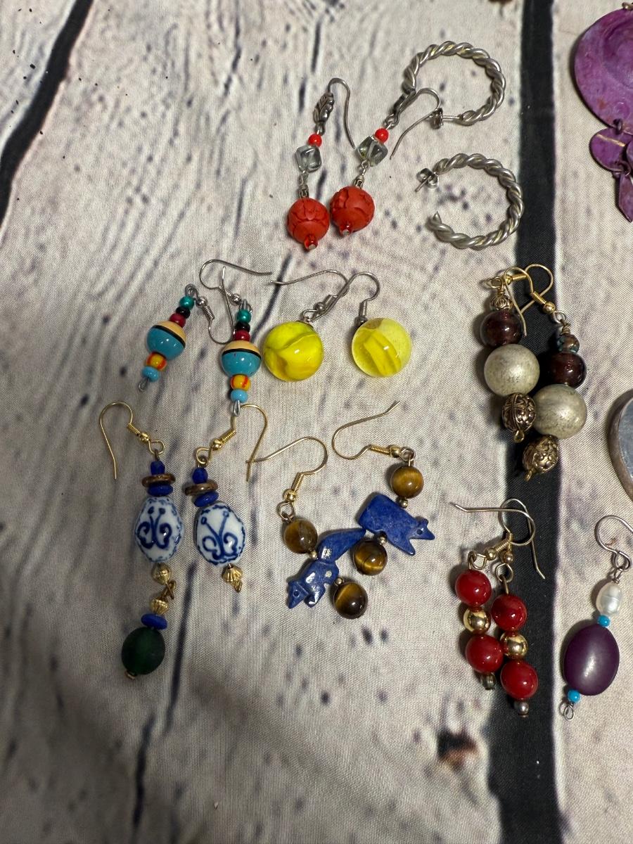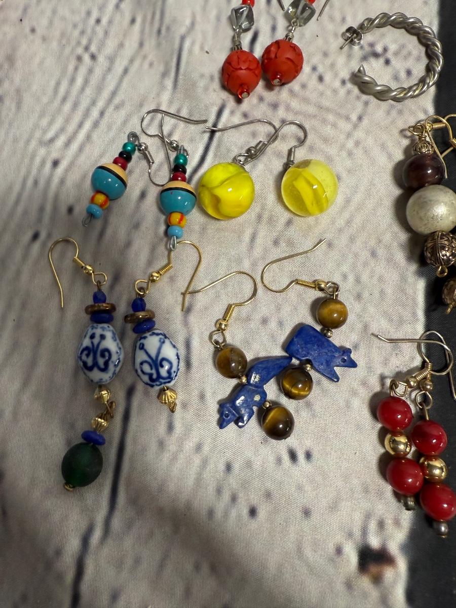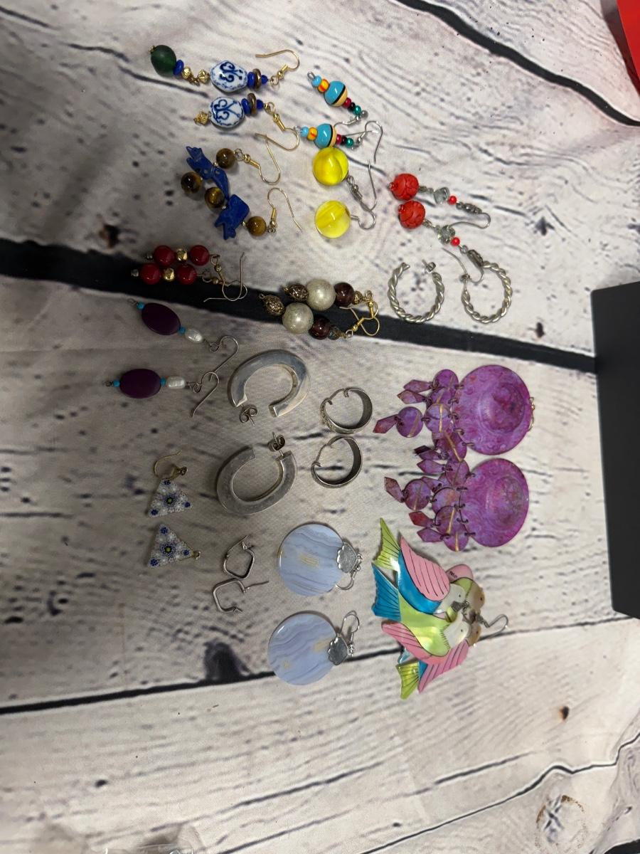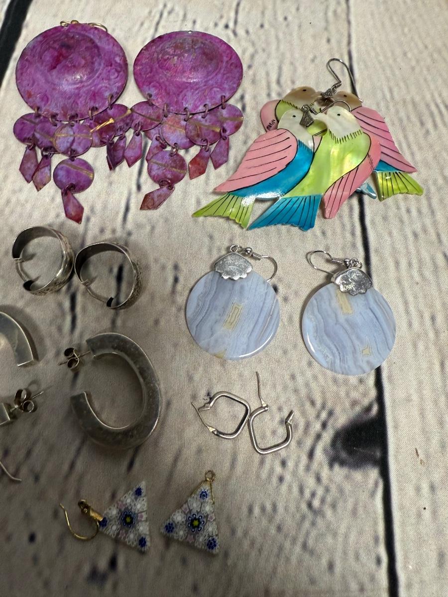 This is a great lot of earrings. As you can see in the pictures there is silver chunky earrings and there’s other silver. earrings. I’m not sure if they are complete silver or sterling because they’re not marked there’s marble earrings which I think are very cool. I like the bird earrings And some beaded silver earrings and more.! New pics will be added as my client needed one pair in the pic.