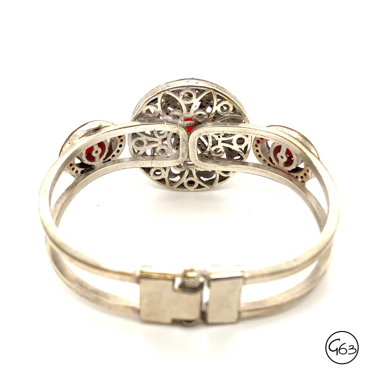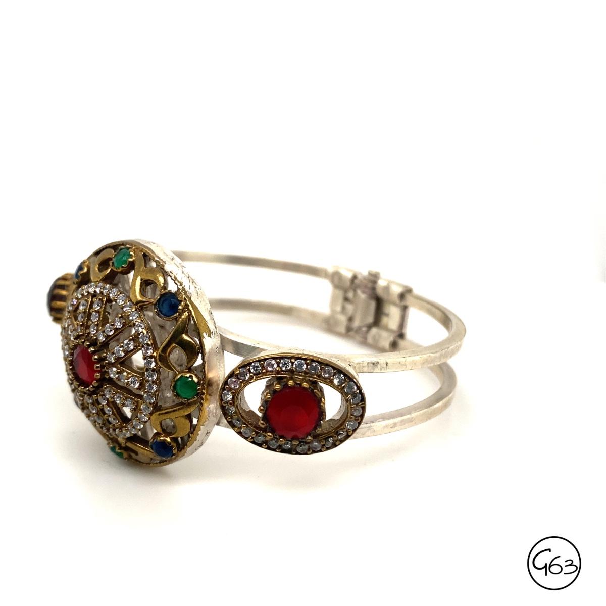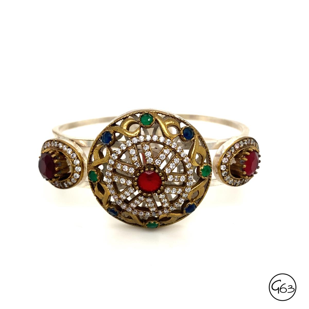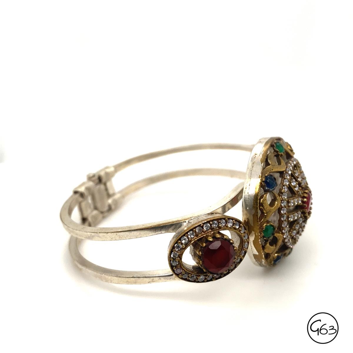 Unsure of the metal used. Gemstones testing as glass. Measures approx. 2 1/4" inner diameter.