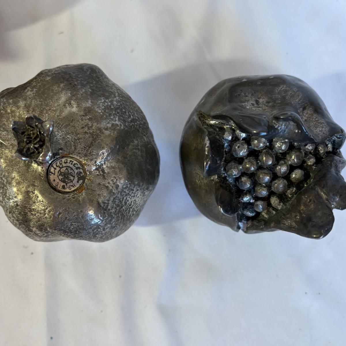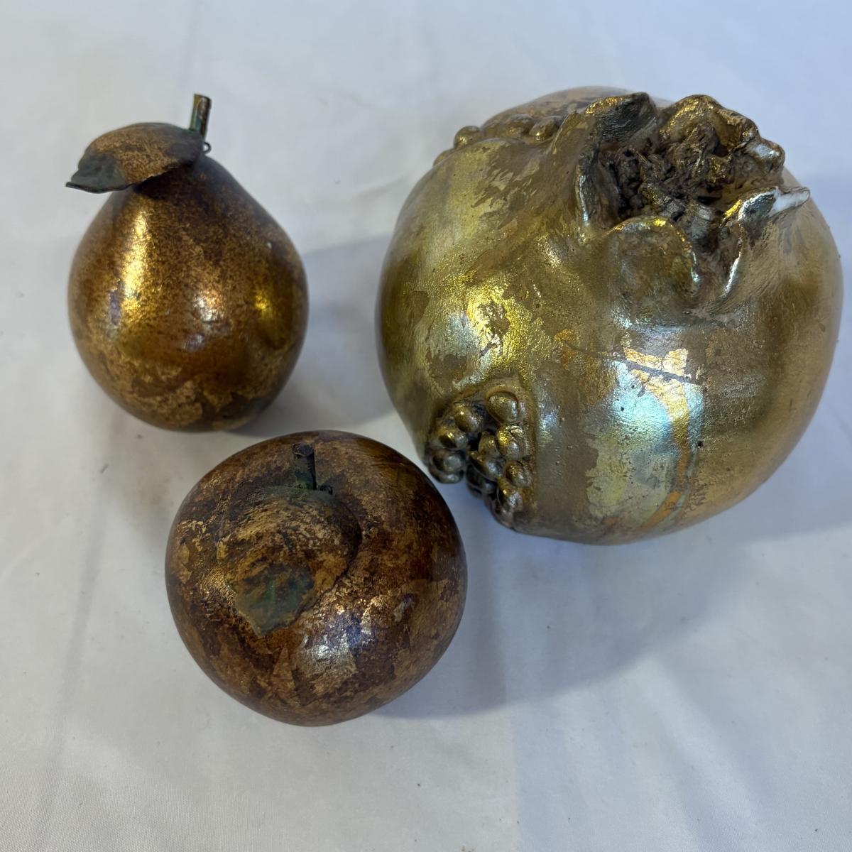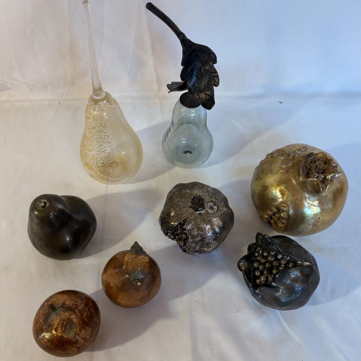 Mix of materials including silver and glass, and what appears to be wood and/or plaster. Clear/gold glass pear is 9.75”H. Gold painted pomegranate is approximately 4.5” at widest and 4.5”H. Shipping available.