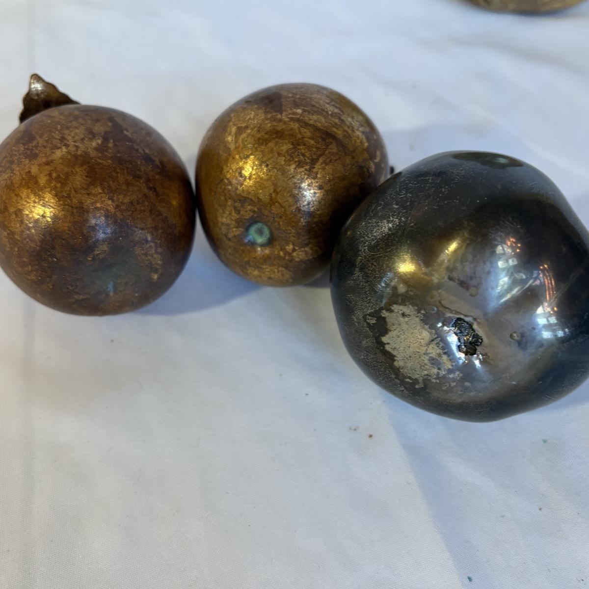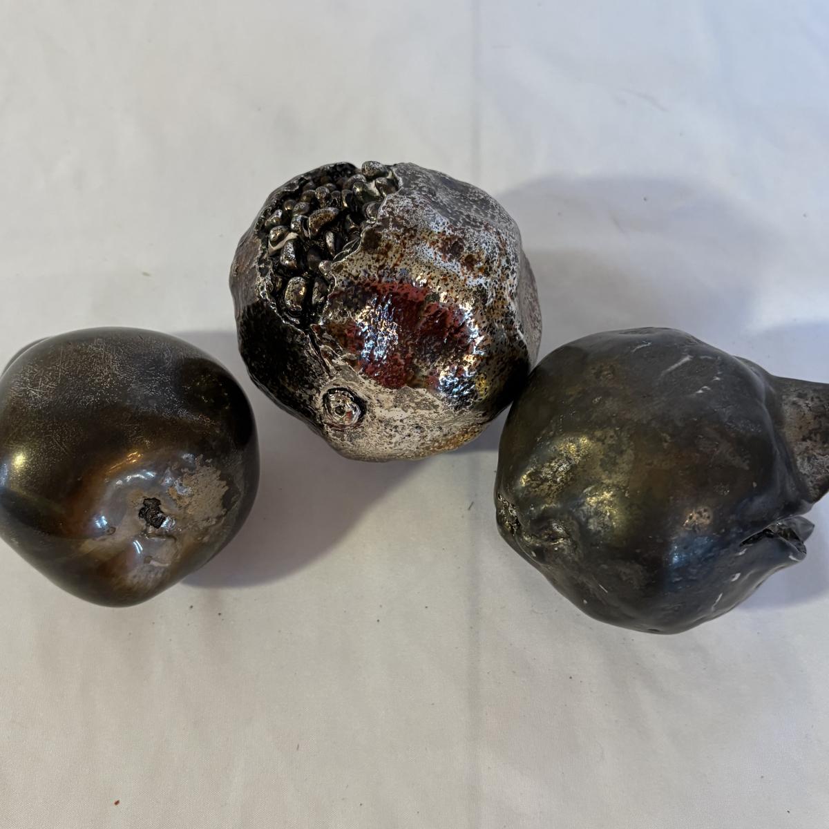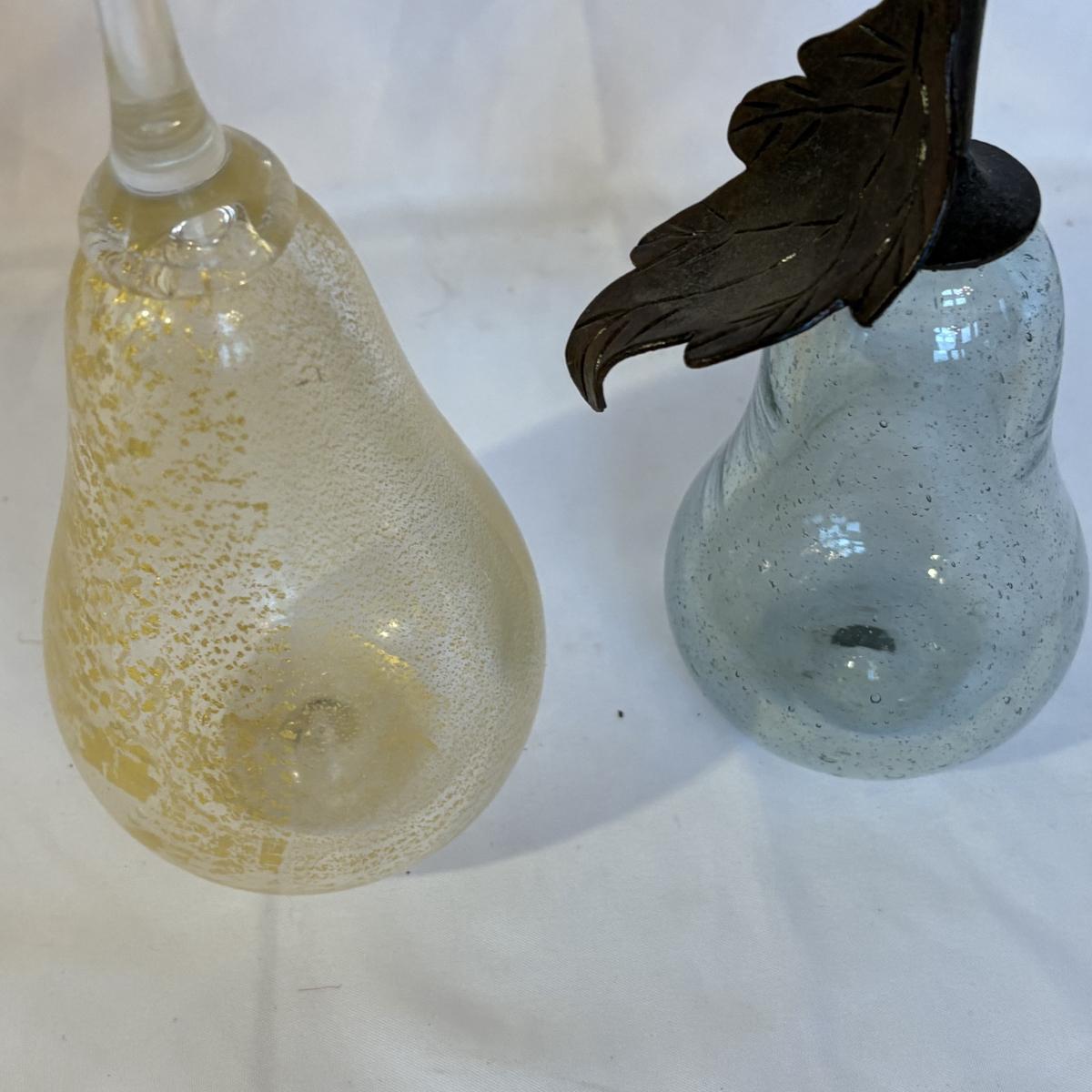 Mix of materials including silver and glass, and what appears to be wood and/or plaster. Clear/gold glass pear is 9.75”H. Gold painted pomegranate is approximately 4.5” at widest and 4.5”H. Shipping available.