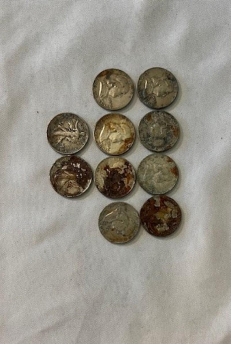**WIRE TRANSFER IS REQUIRED IF SHIPPED.** Includes two Walking Liberty halves, and eight Franklin halves. All have some degree of staining. Total of 10 pieces. Silver content if 90%.
