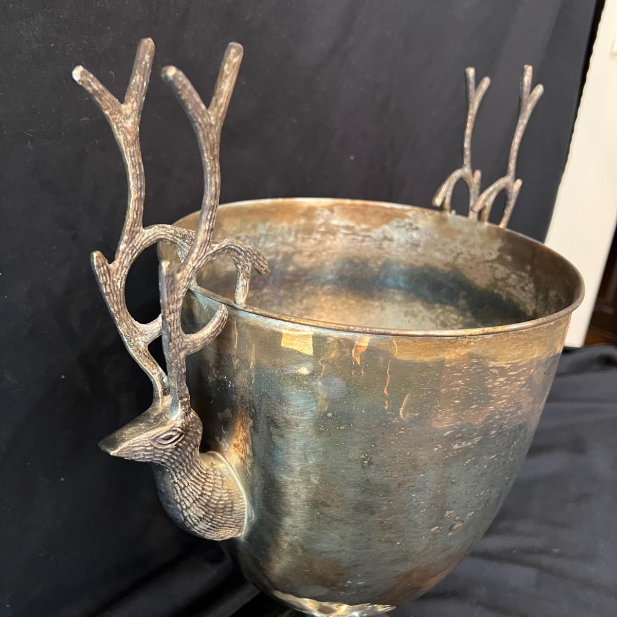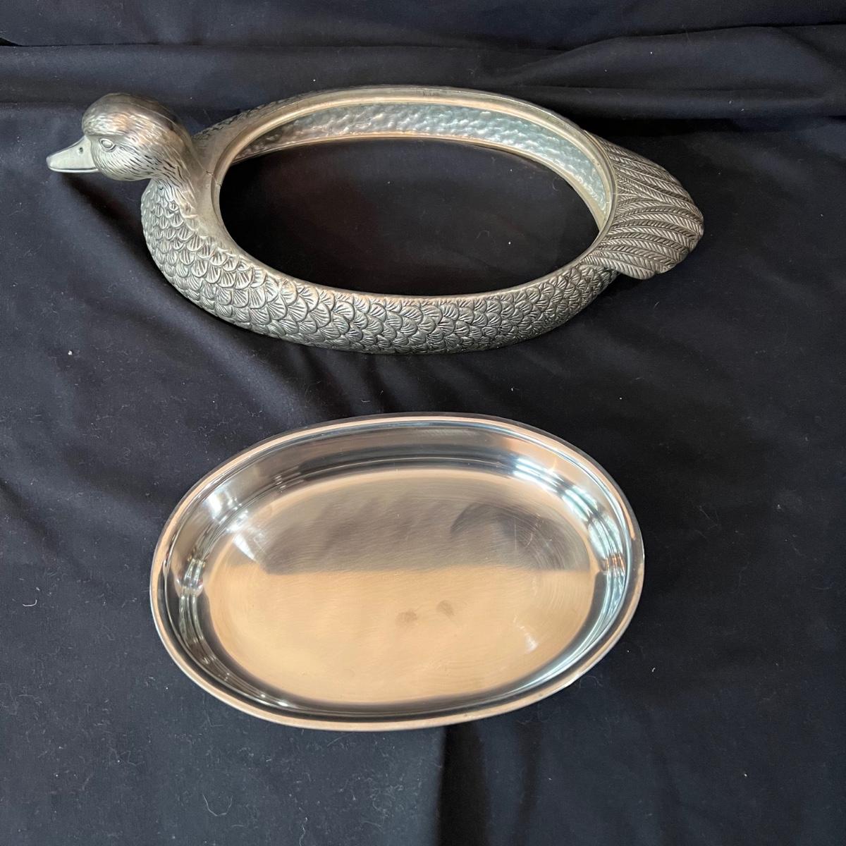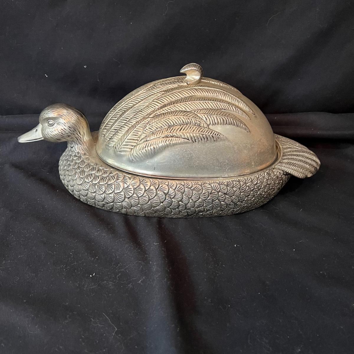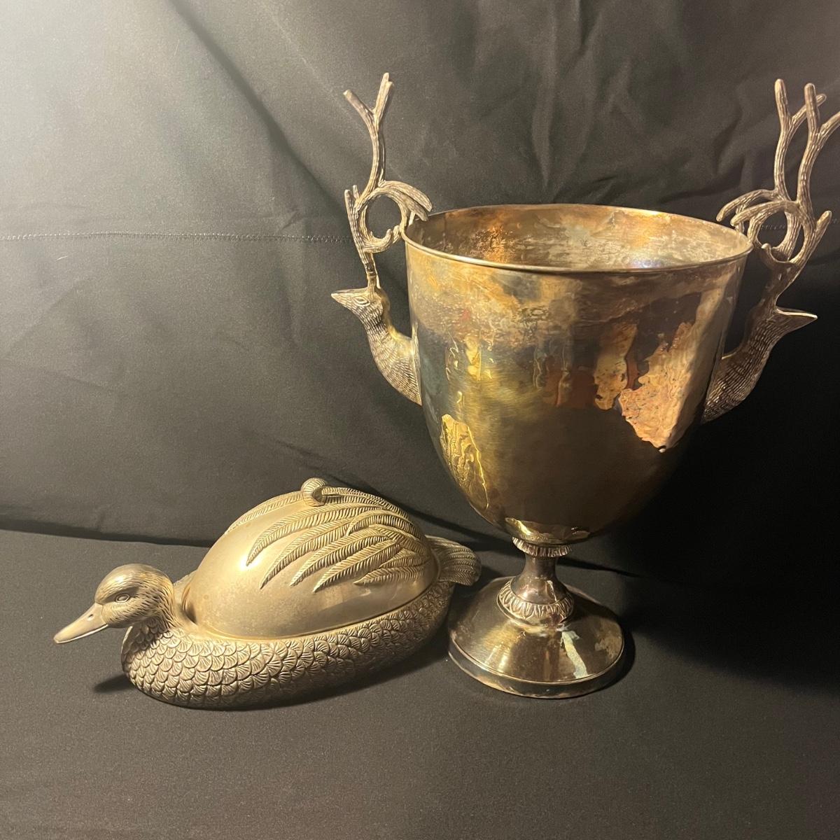 Metal ice bucket with deer antler busts as handles. This appears to be silver plated but cannot confirm. The bowl is pounded metal / a distressed look. It measures 13” x 9” X 18”H. The Silea brand covered duck tureen appears to be cast metal with a removable stainless steel serving bowl. It measures 15” x 6.5” x 7”H.