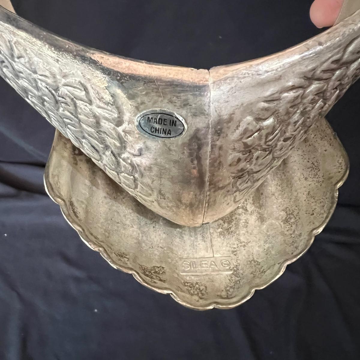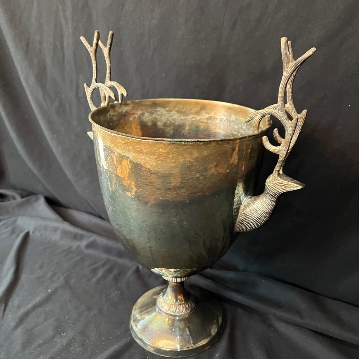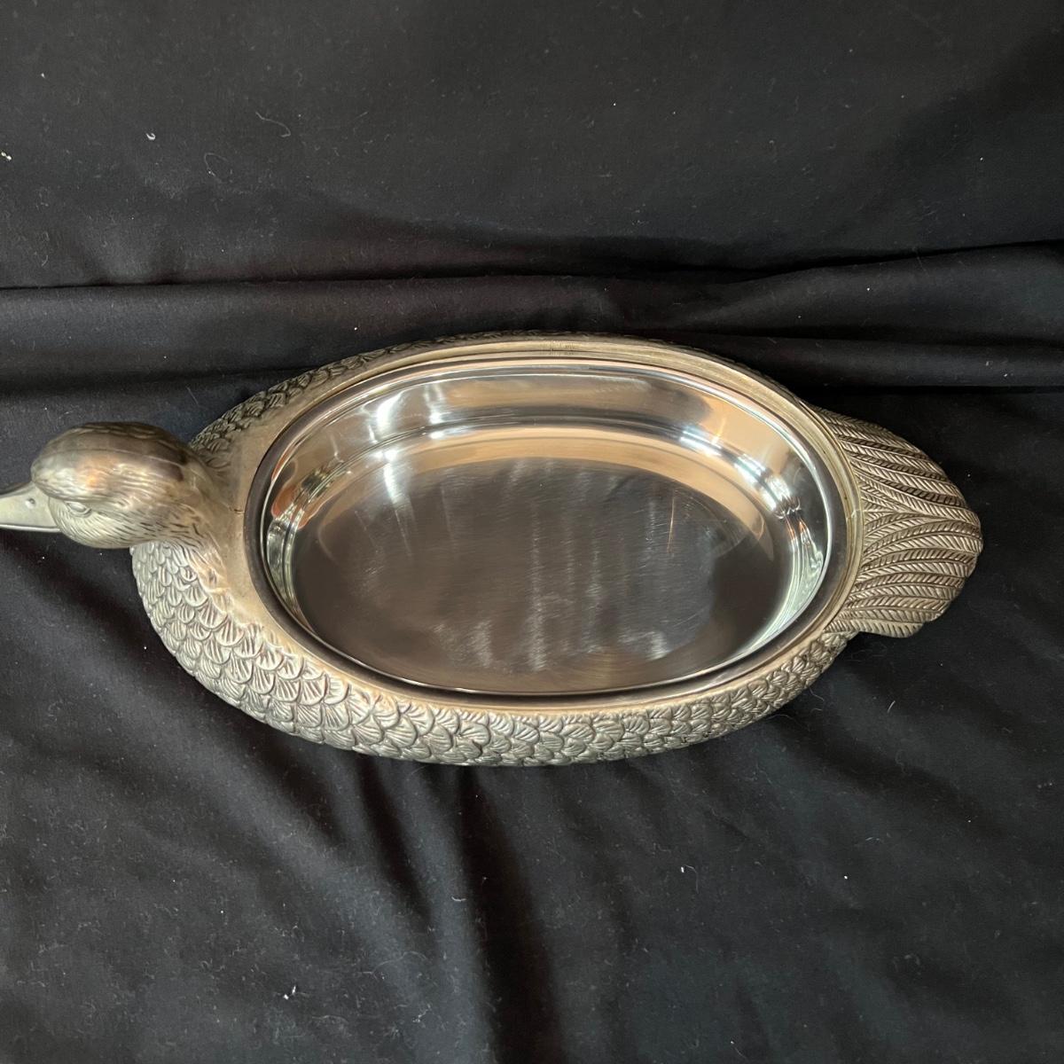 Metal ice bucket with deer antler busts as handles. This appears to be silver plated but cannot confirm. The bowl is pounded metal / a distressed look. It measures 13” x 9” X 18”H. The Silea brand covered duck tureen appears to be cast metal with a removable stainless steel serving bowl. It measures 15” x 6.5” x 7”H.