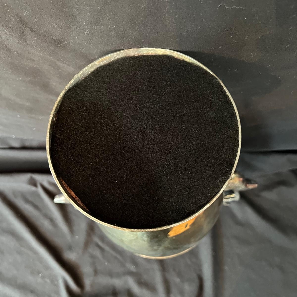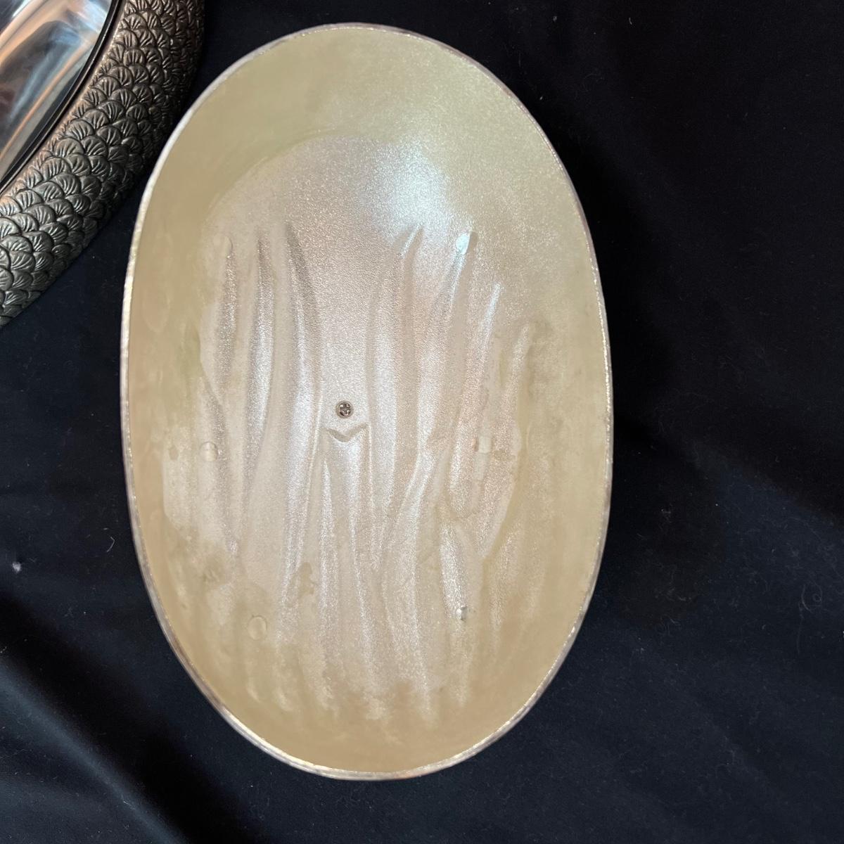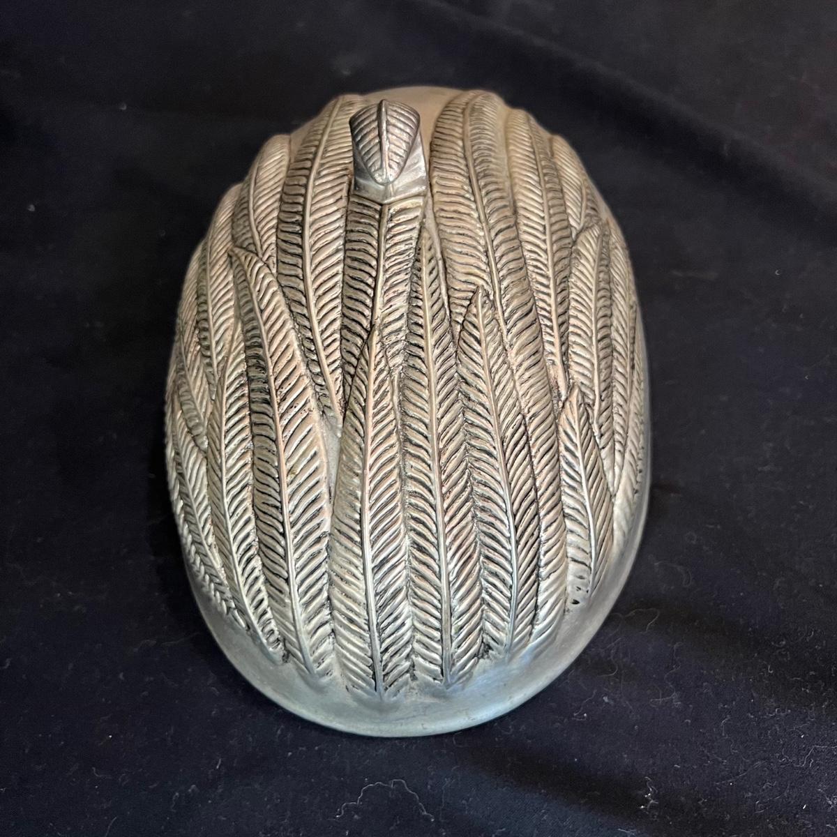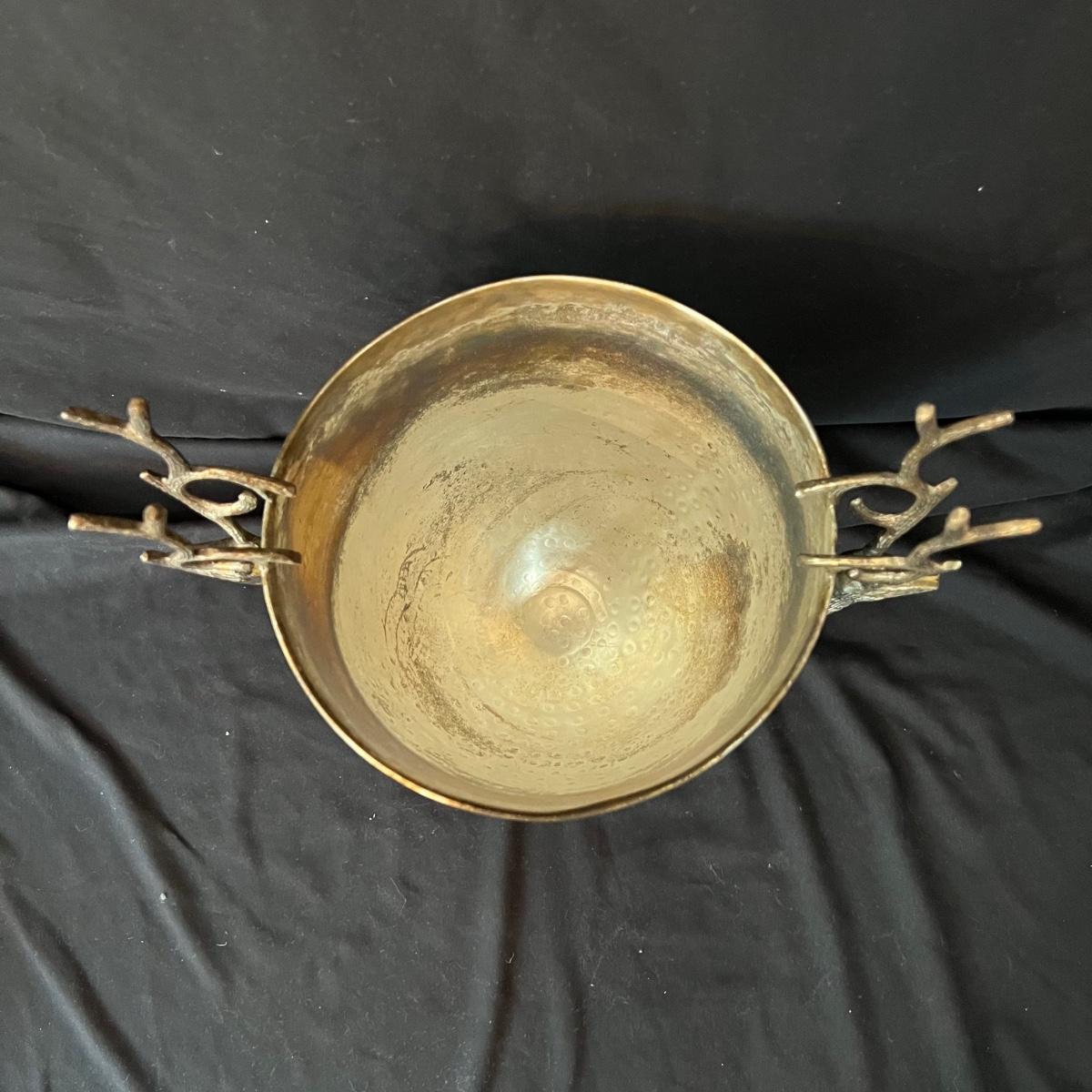 Metal ice bucket with deer antler busts as handles. This appears to be silver plated but cannot confirm. The bowl is pounded metal / a distressed look. It measures 13” x 9” X 18”H. The Silea brand covered duck tureen appears to be cast metal with a removable stainless steel serving bowl. It measures 15” x 6.5” x 7”H.