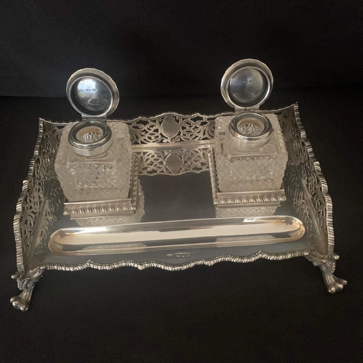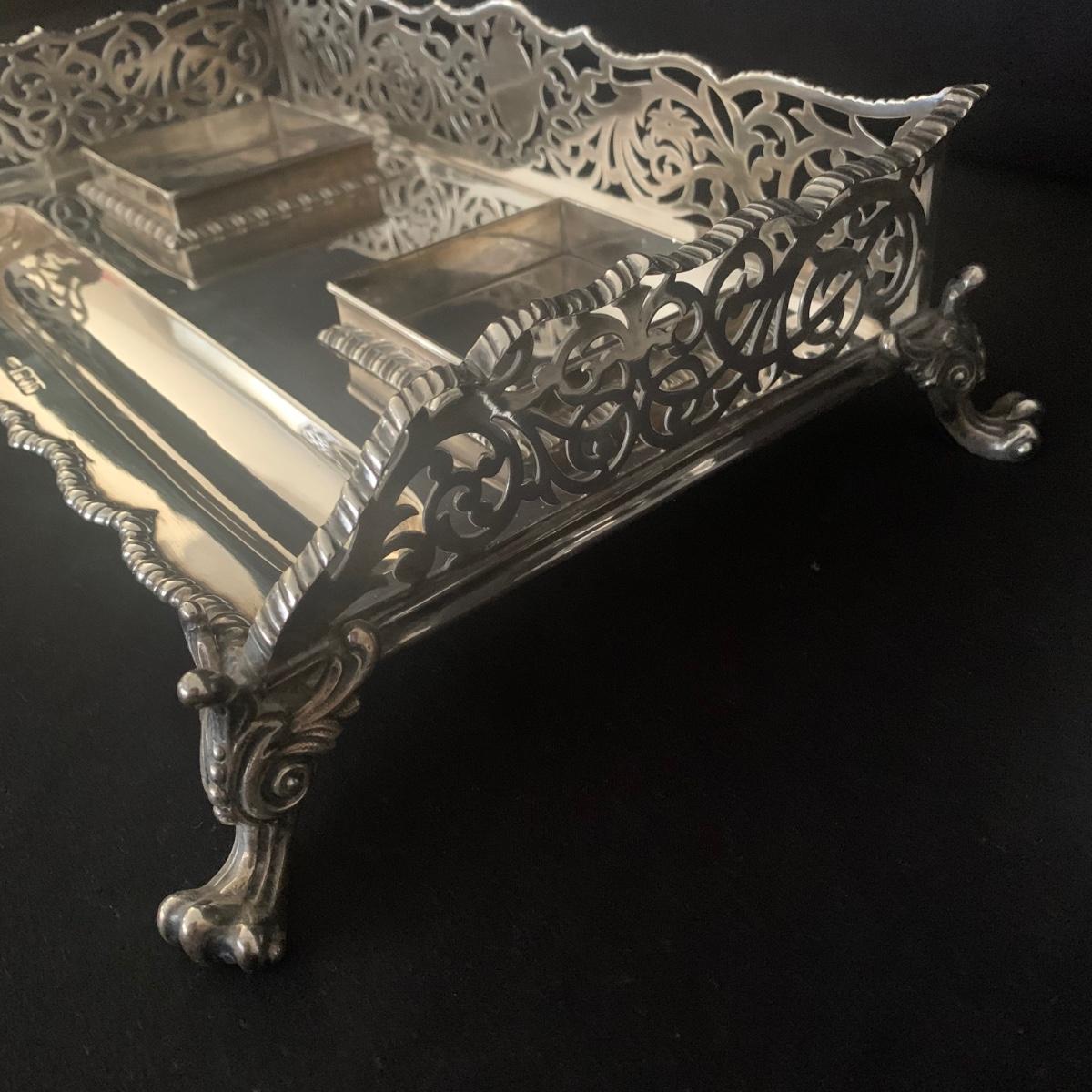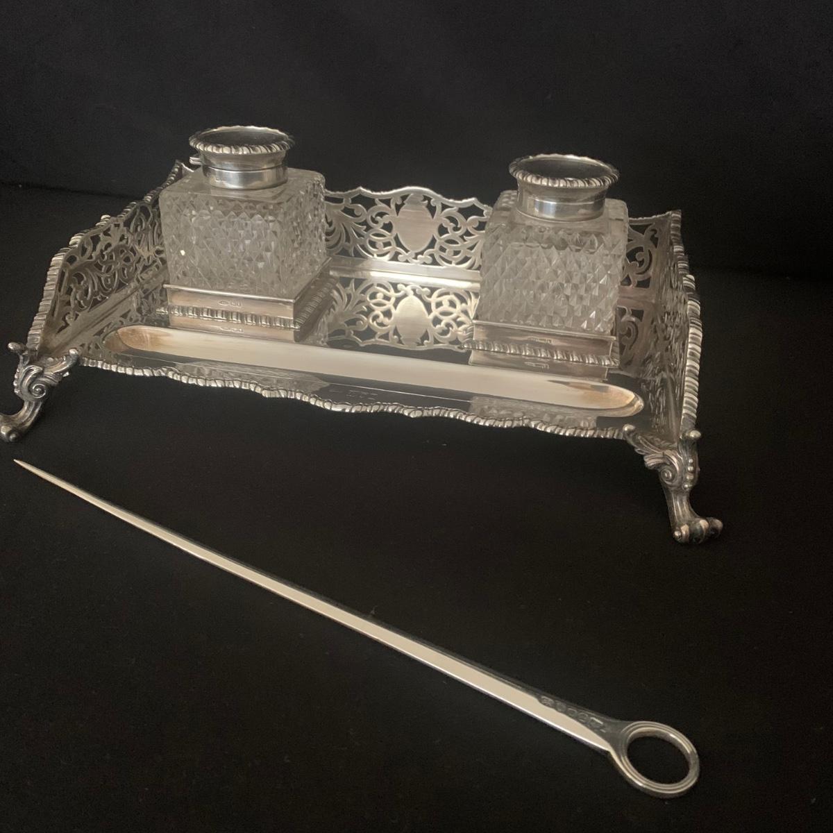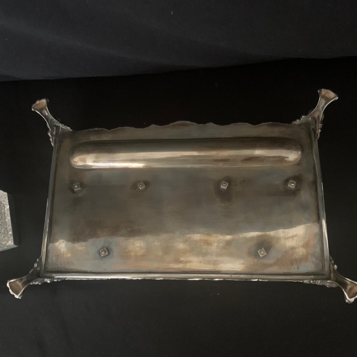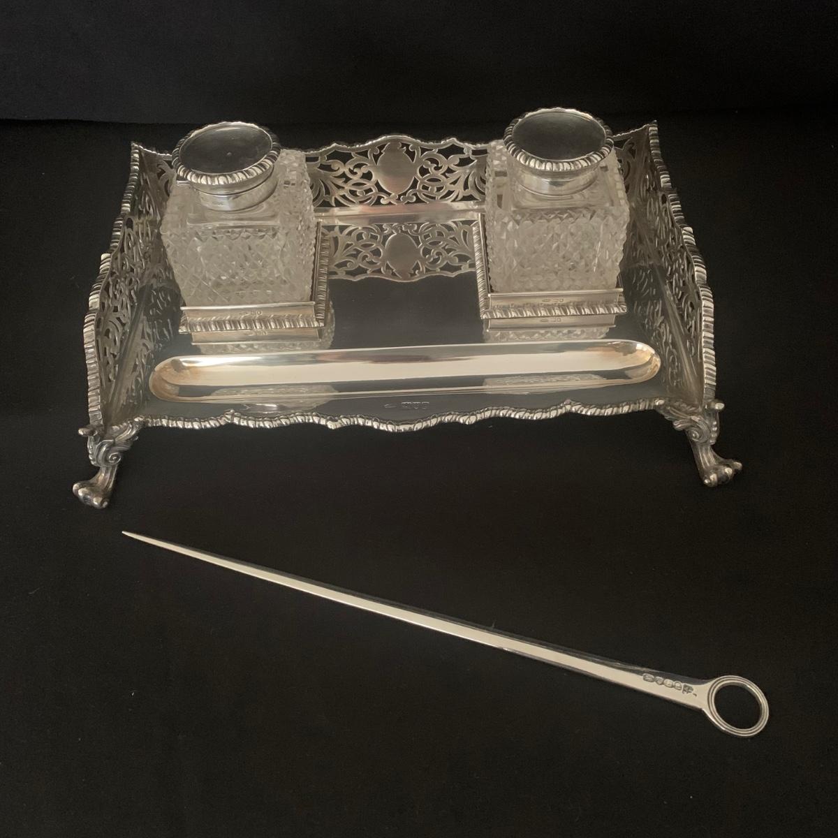 Lovely four pieces of desk elegance. This wonderful silver inkwell with two glass and silver ink wells and large letter opener are in nice condition. The letter opener measures 12” long and the ink well measures 13.5” x8.5” x3”. Shipping available.