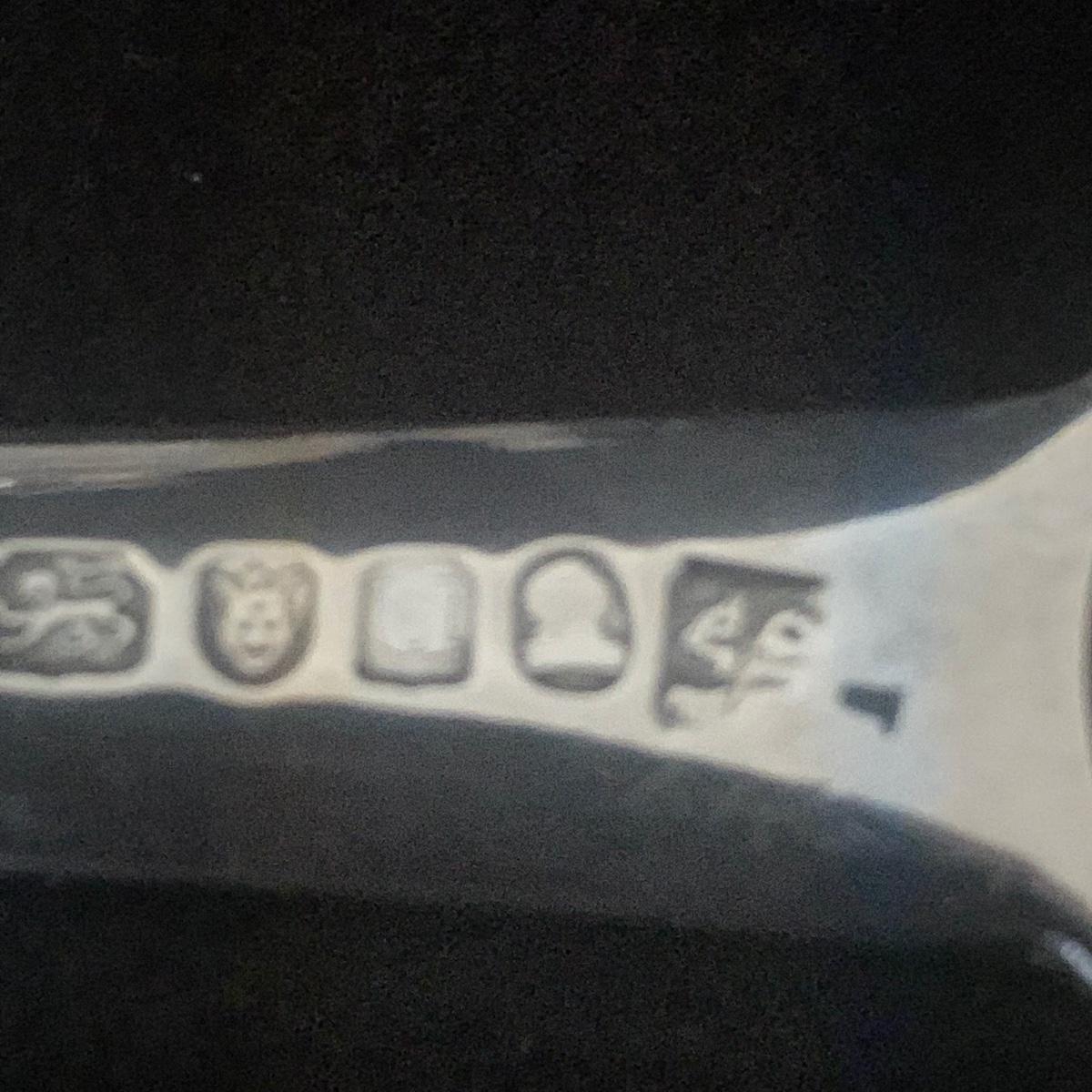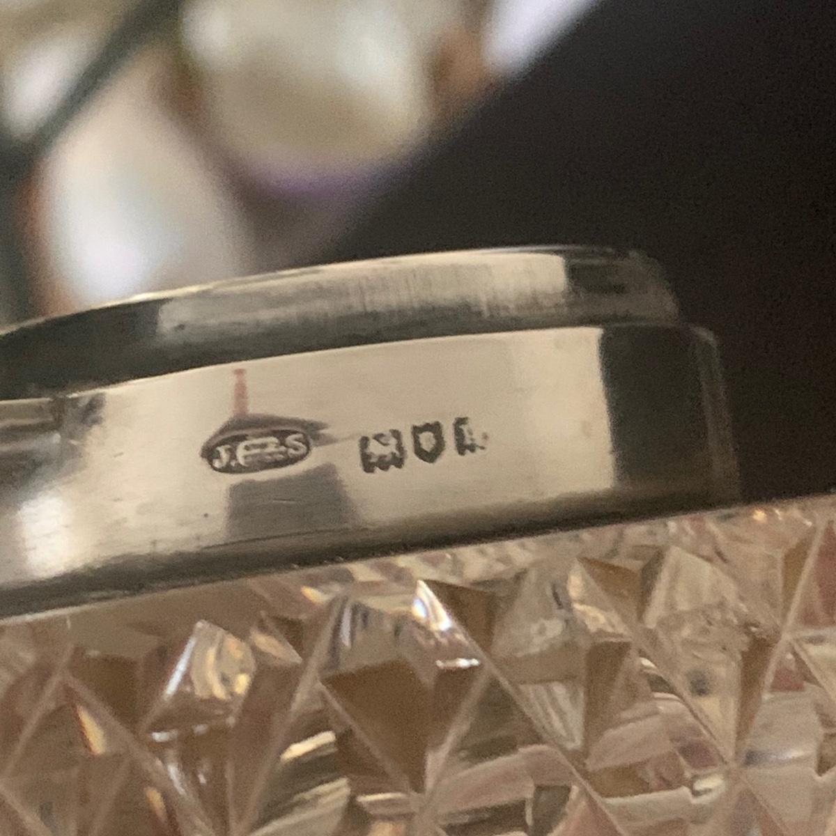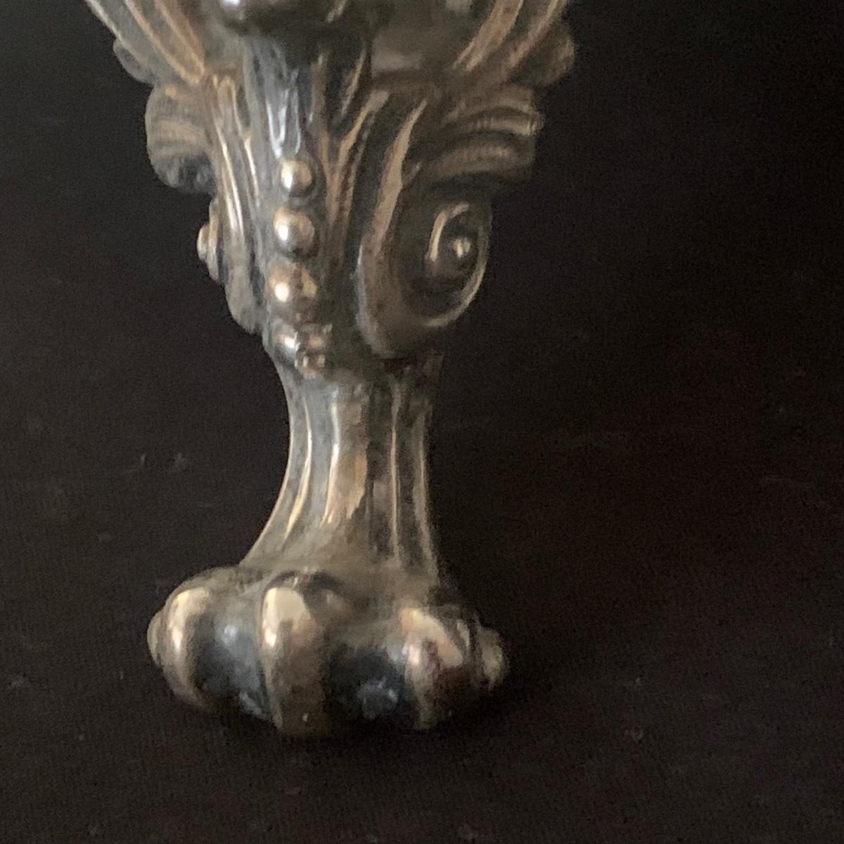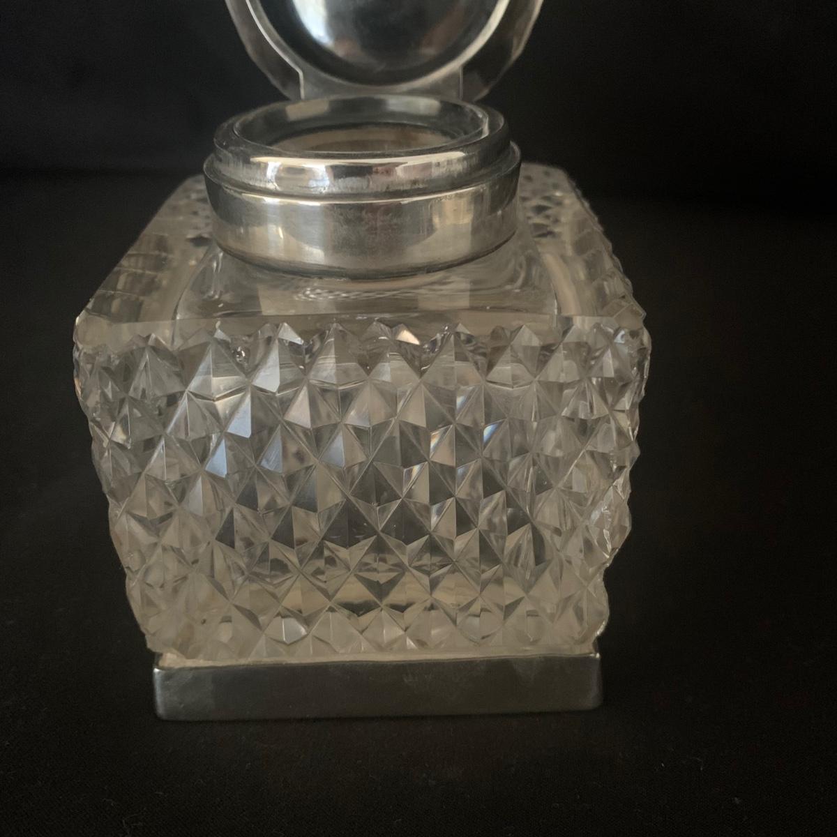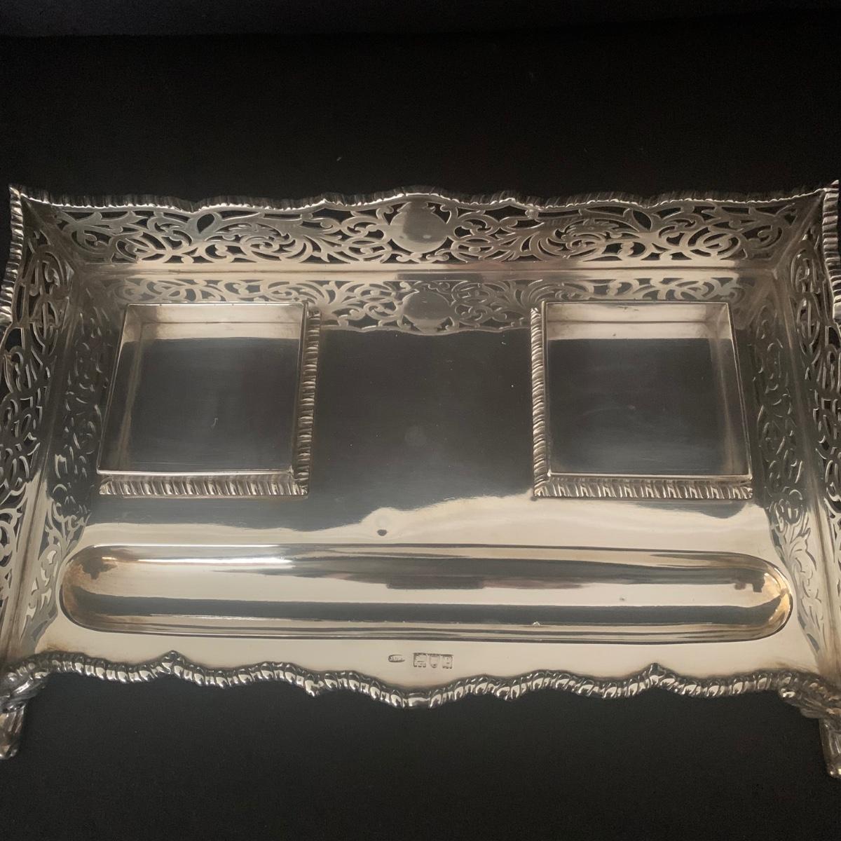 Lovely four pieces of desk elegance. This wonderful silver inkwell with two glass and silver ink wells and large letter opener are in nice condition. The letter opener measures 12” long and the ink well measures 13.5” x8.5” x3”. Shipping available.