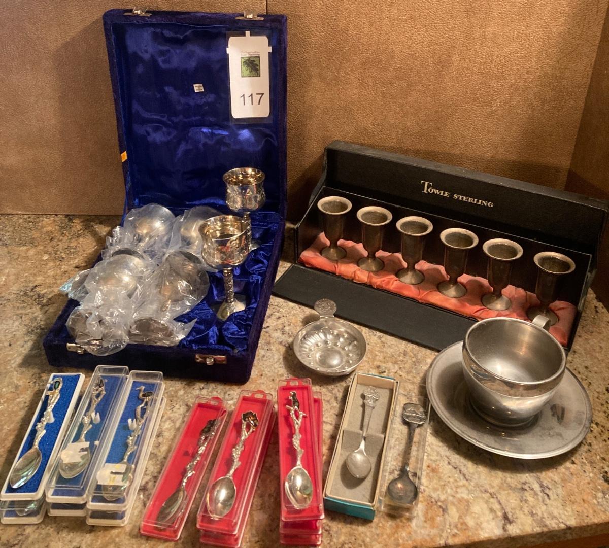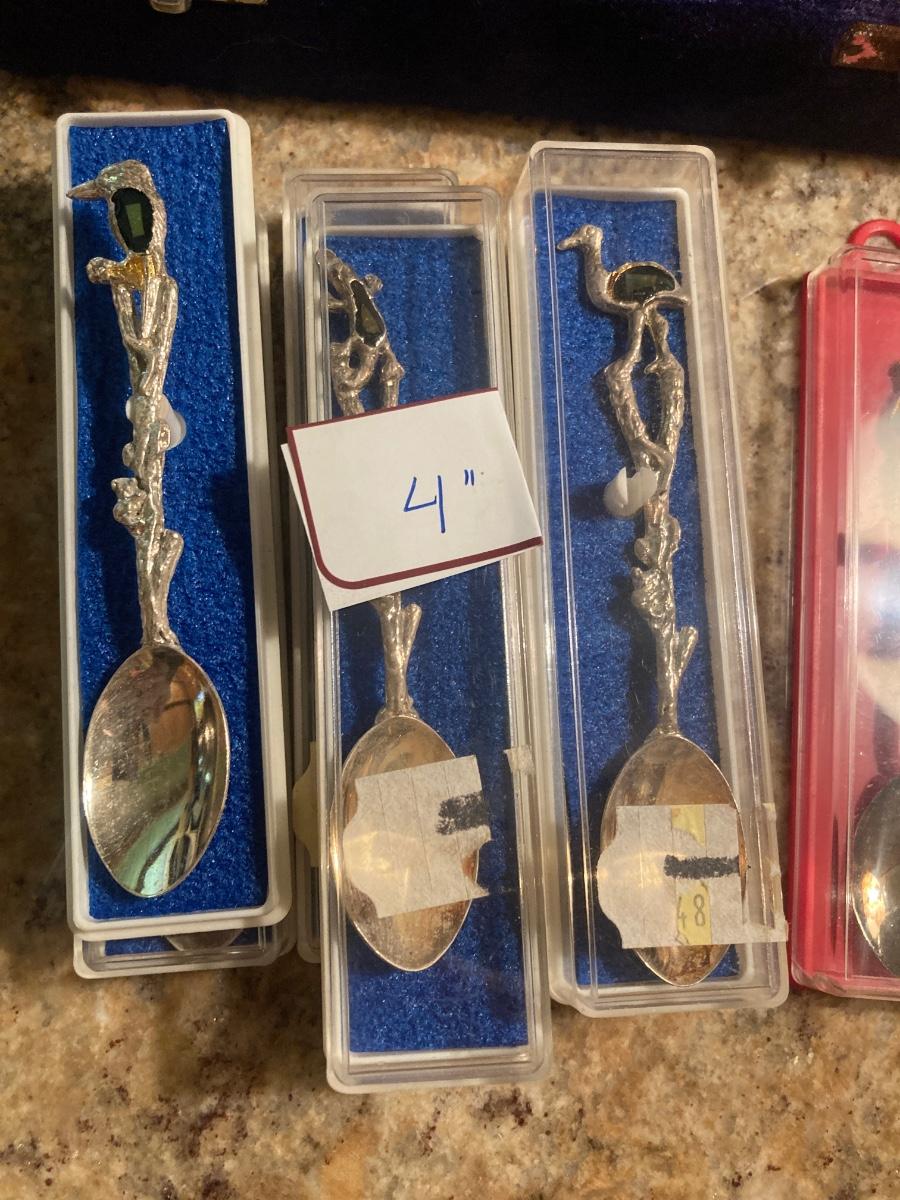 Grouping of silver plate metal items some with makers mark. Spoons 4"