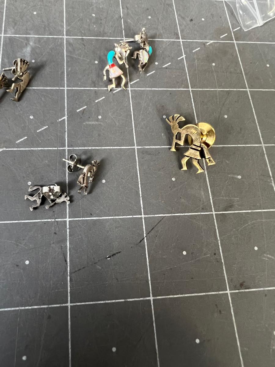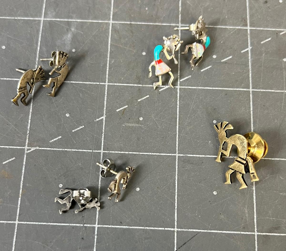 Silver Kokopelli Earrings, Tie Tac, Pins