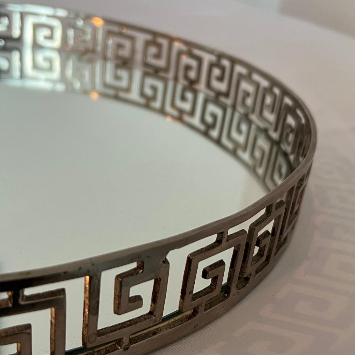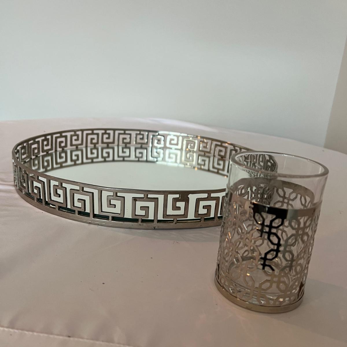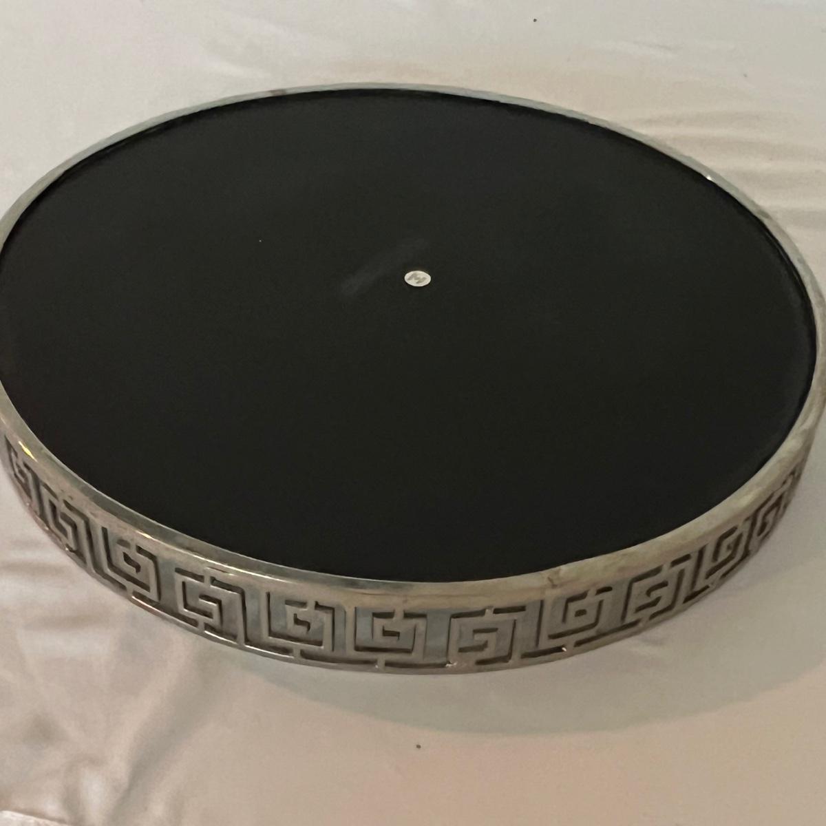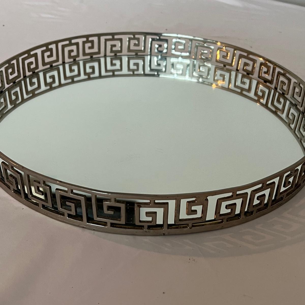 This attractive silver colored metal tray has a mirrored base and is in great condition as is the metal encased glass we have paired it with. No mfg. markings were found on either piece but the tray has a Made in India sticker; it measures 16” d x 2” tall. The metal on the base of the glass has a few light scuff marks.