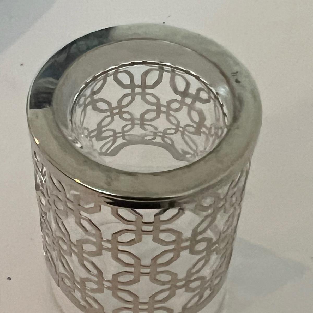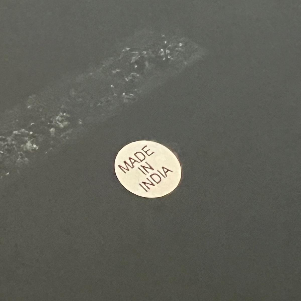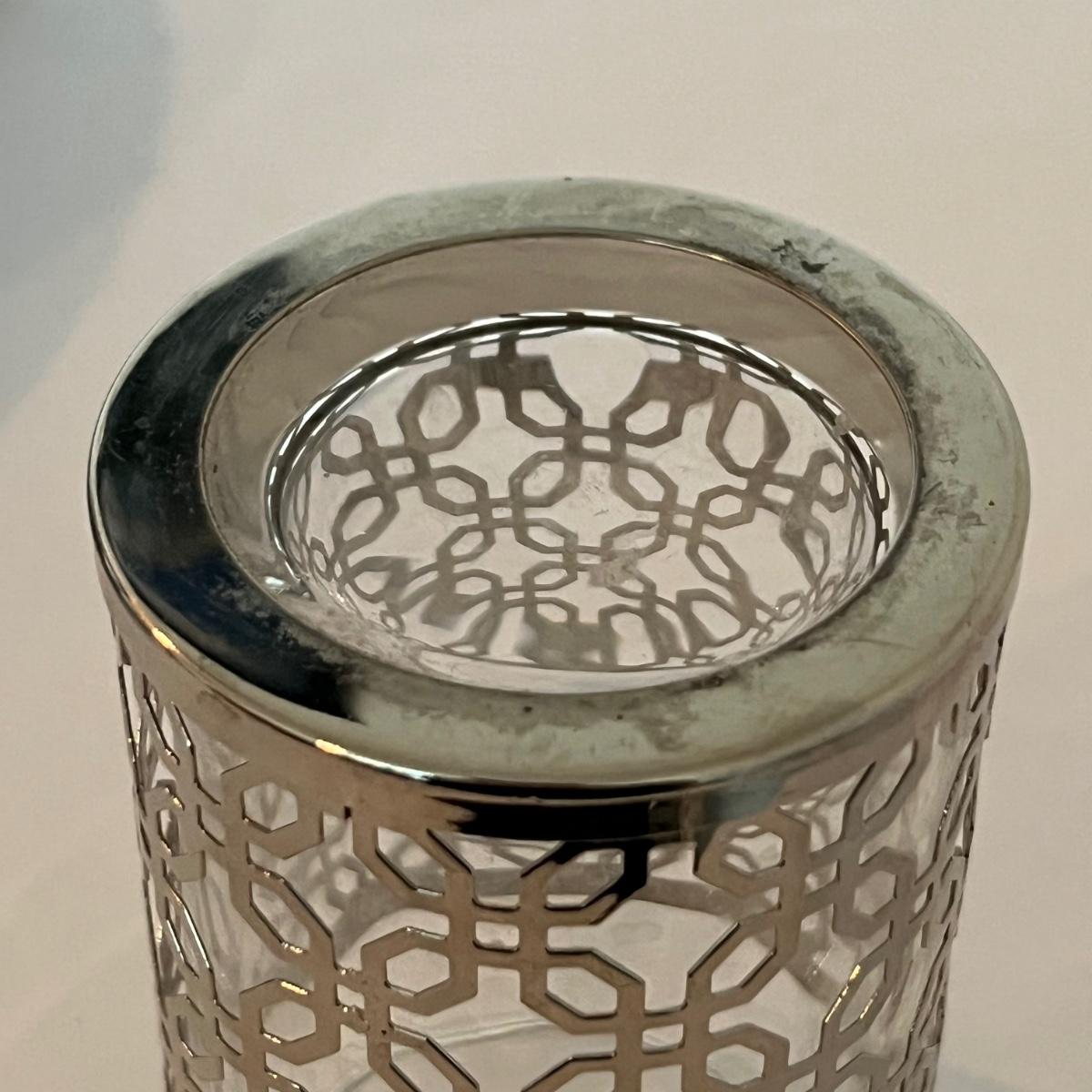 This attractive silver colored metal tray has a mirrored base and is in great condition as is the metal encased glass we have paired it with. No mfg. markings were found on either piece but the tray has a Made in India sticker; it measures 16” d x 2” tall. The metal on the base of the glass has a few light scuff marks.