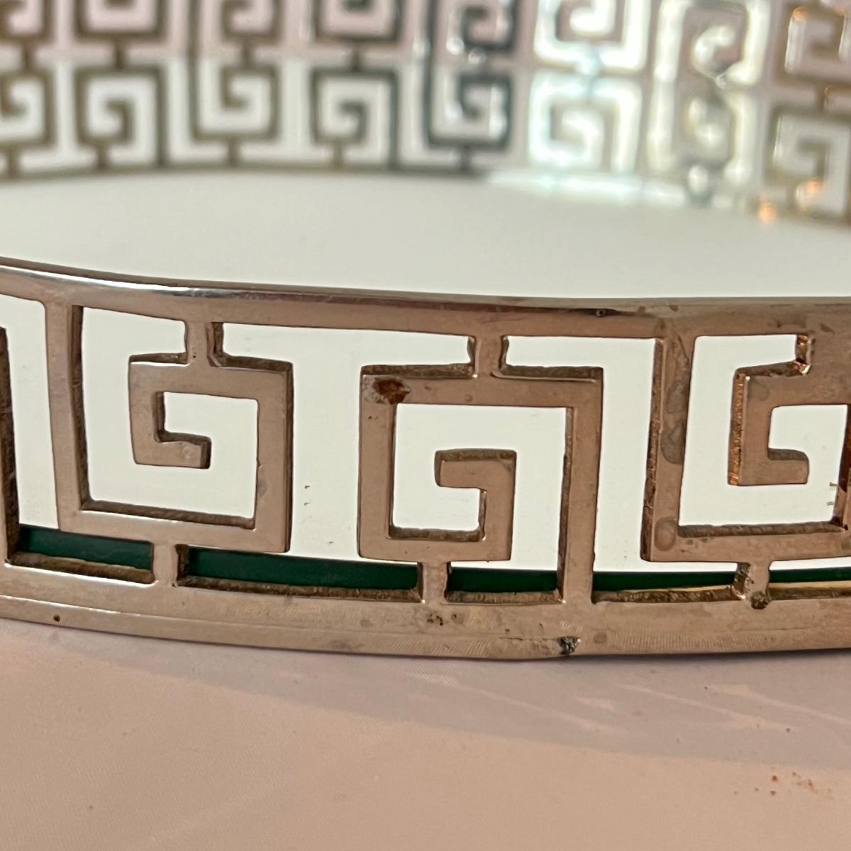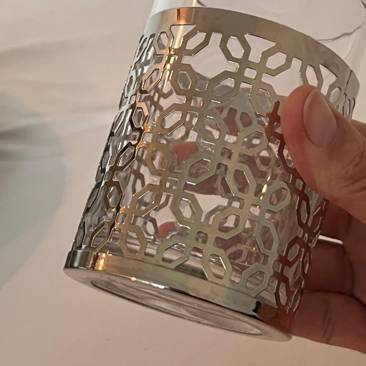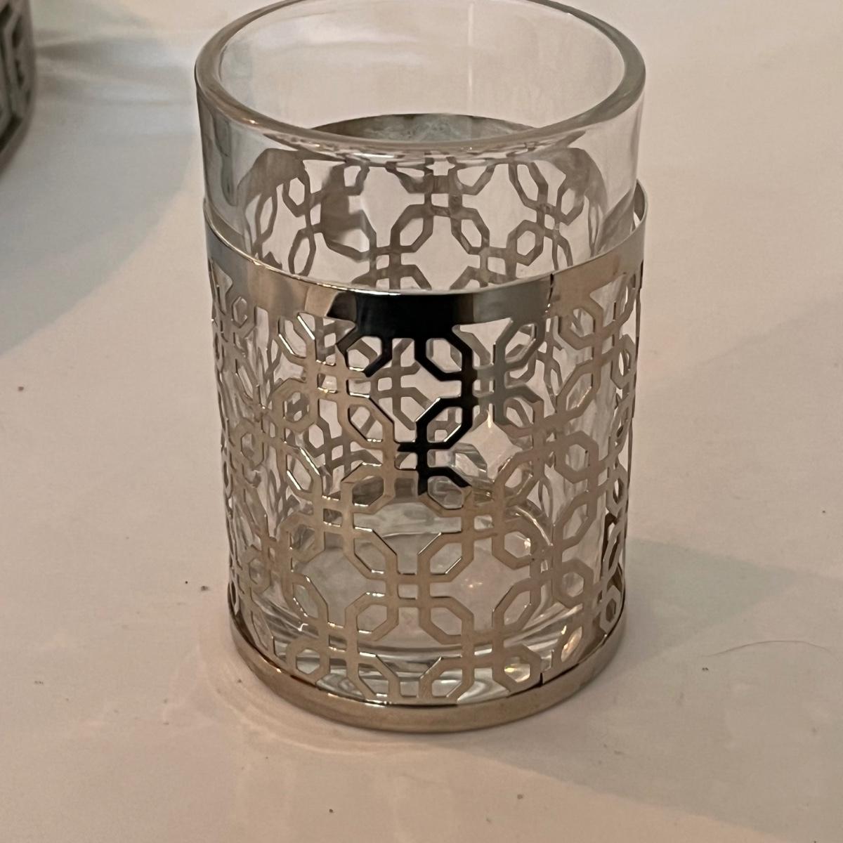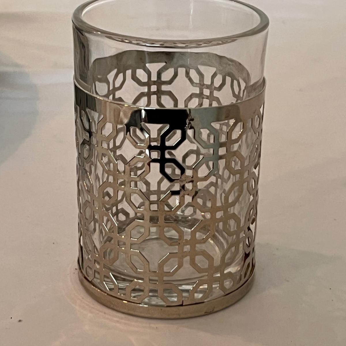 This attractive silver colored metal tray has a mirrored base and is in great condition as is the metal encased glass we have paired it with. No mfg. markings were found on either piece but the tray has a Made in India sticker; it measures 16” d x 2” tall. The metal on the base of the glass has a few light scuff marks.