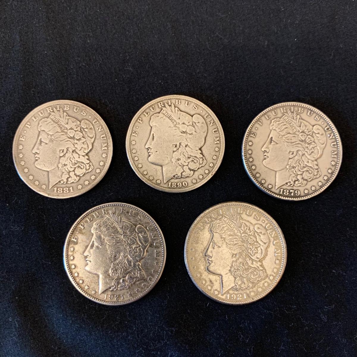 Five silver Morgan dollars from 1881, 1890, 1879, and 1921. Please see photos for condition and other details. Shipping available.