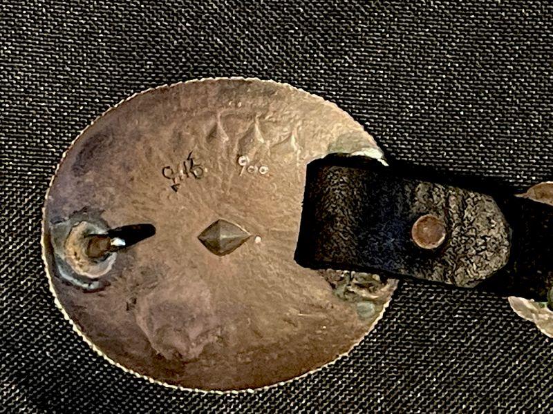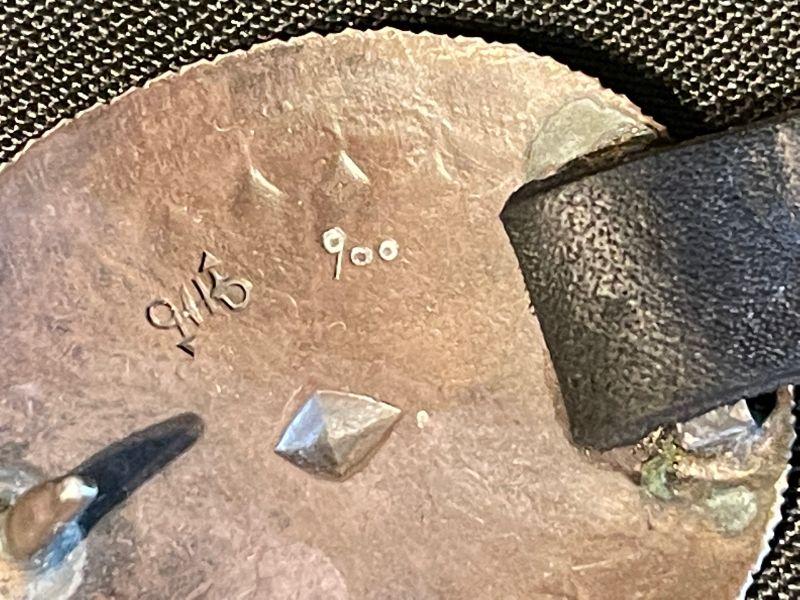 This hand-crafted belt, stamp-signed, Is crafted of coin silver marked “900.”  The polished buckle and 22 conchos are worked with an open flower pattern, and are spaced on a 1/2” wide black leather belt strung through strip-copper loops that have oxidized. Very little, if any wear is noted.