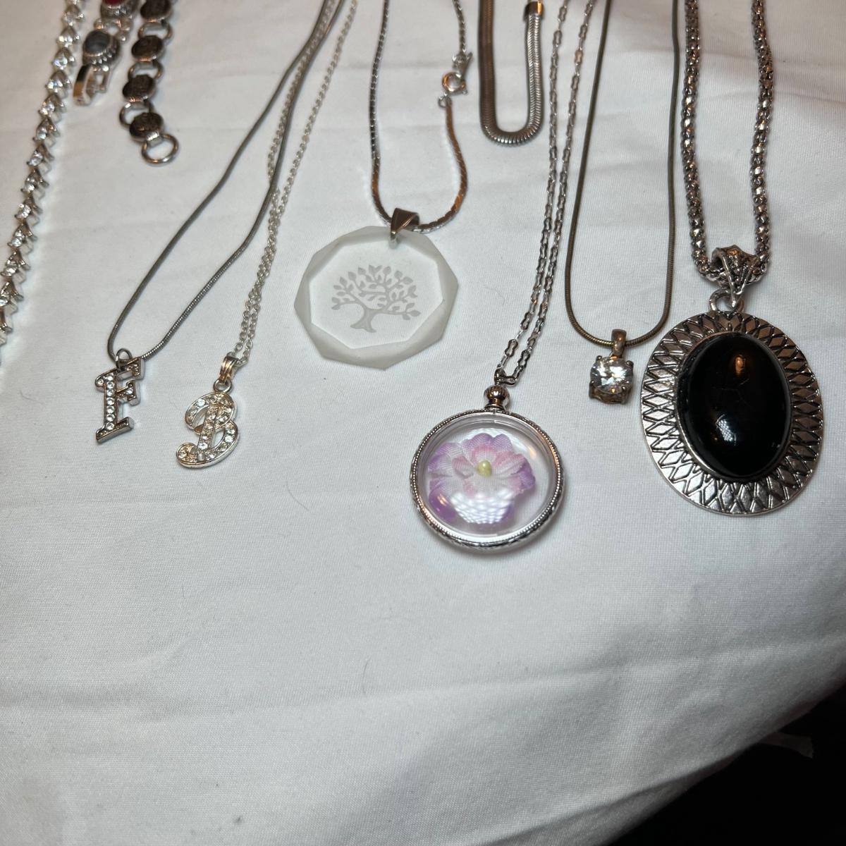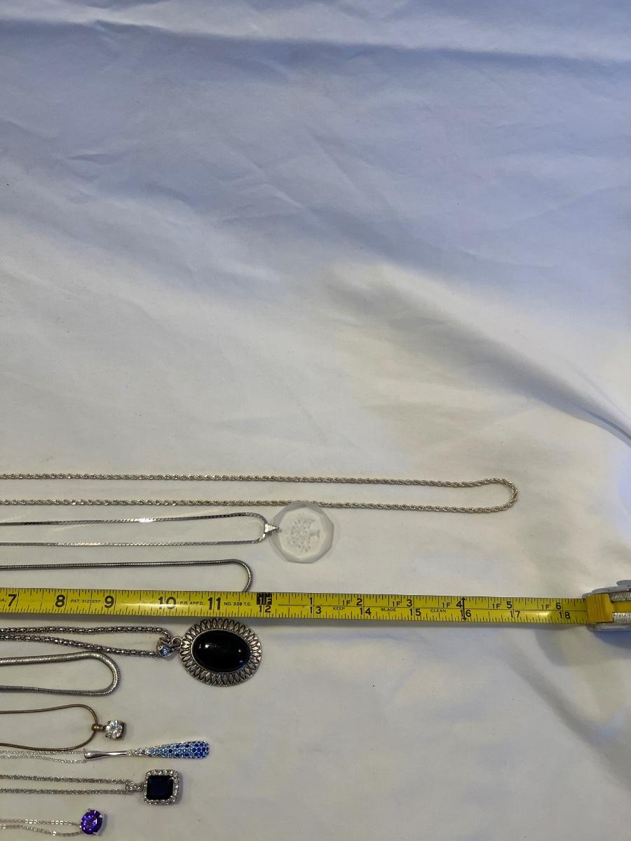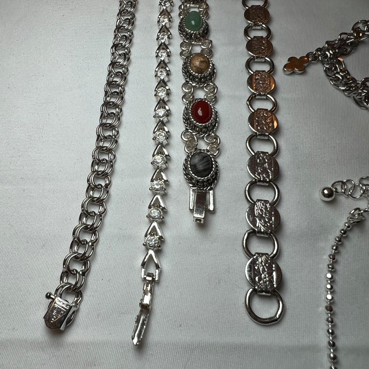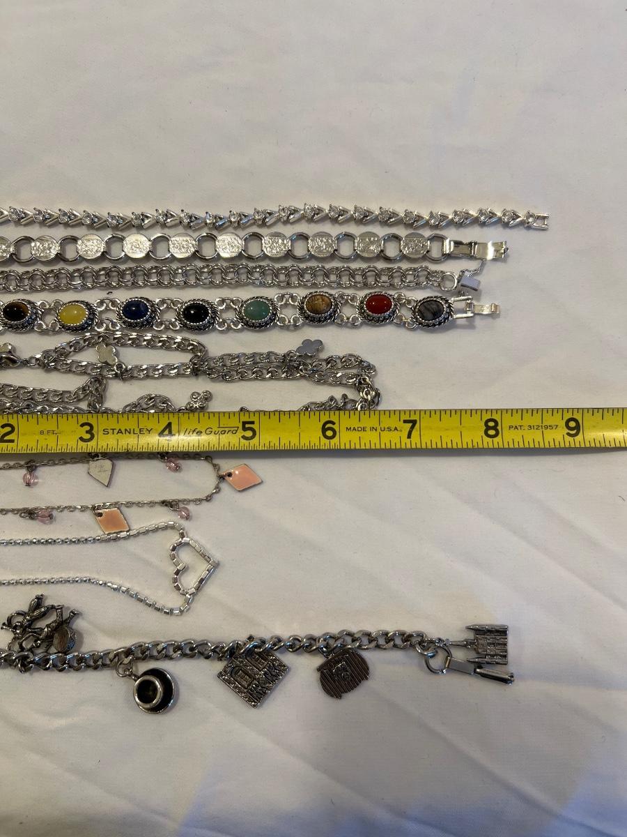Ten plus necklaces, five plus bracelets, a pair of earrings and a keychain make up this lot of silver colored jewelry. No markings were found as to the material on any pieces. The Lotcrafts dragonfly earrings are French hoop for pierced ears. See images for measurements; necklaces range from choker to long.