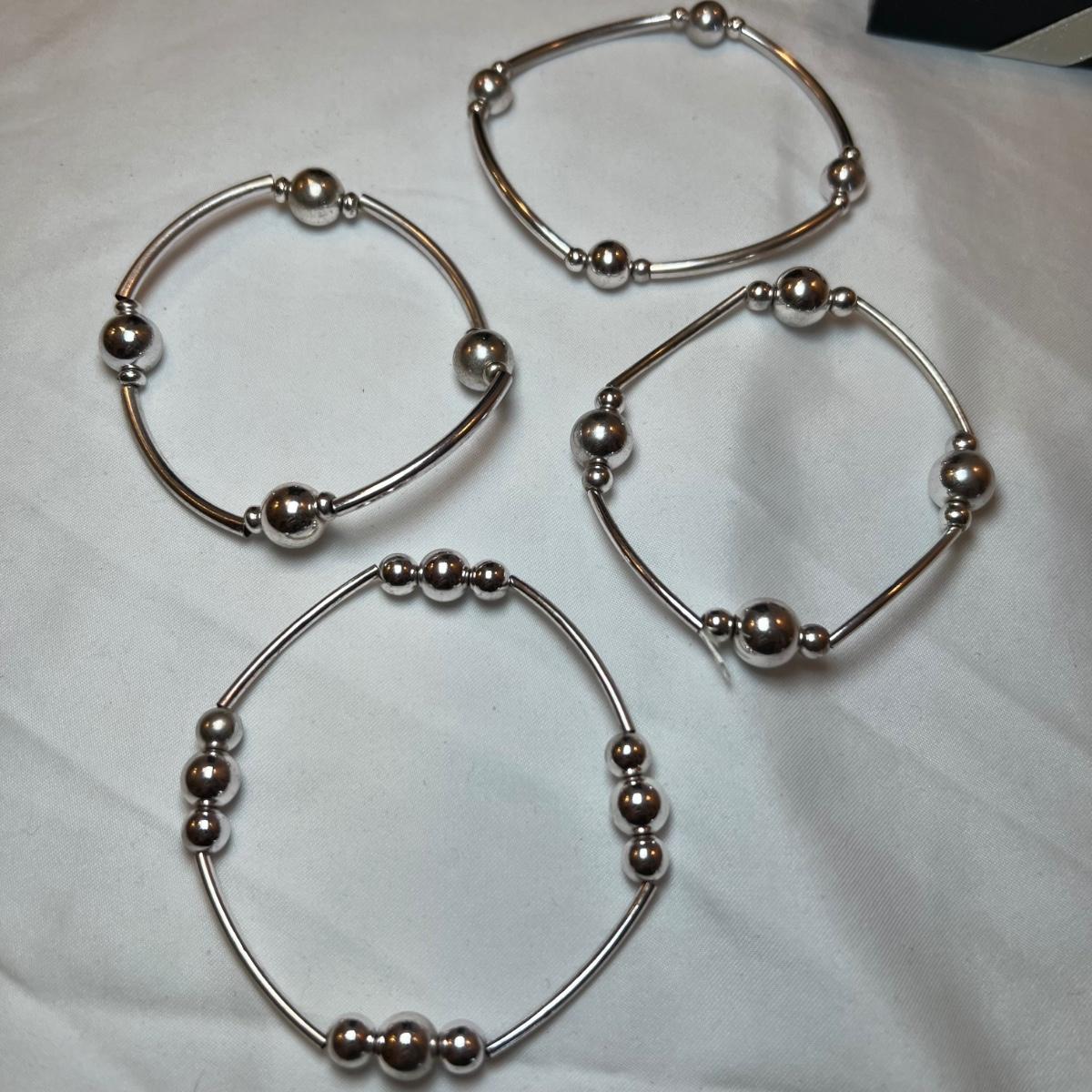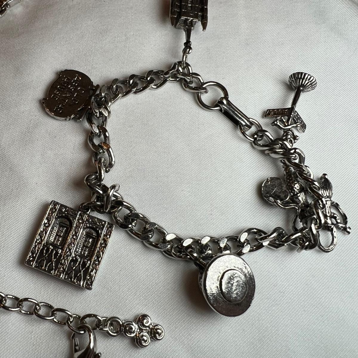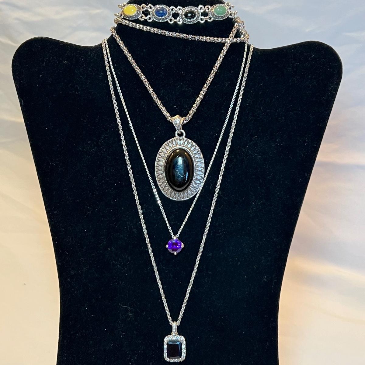 Ten plus necklaces, five plus bracelets, a pair of earrings and a keychain make up this lot of silver colored jewelry. No markings were found as to the material on any pieces. The Lotcrafts dragonfly earrings are French hoop for pierced ears. See images for measurements; necklaces range from choker to long.