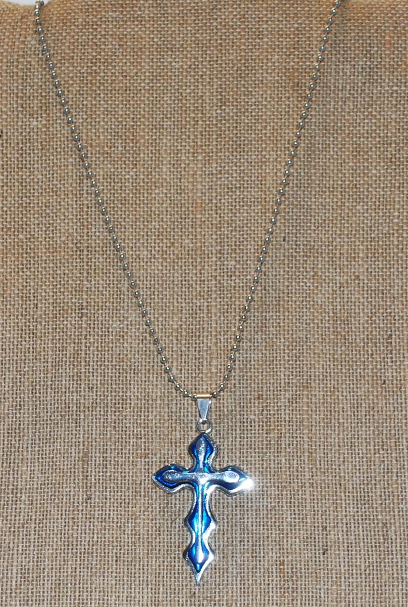 Silver on Blue Cross PENDANT (3 " x 1 ¼") on a Silver Necklace 23" L