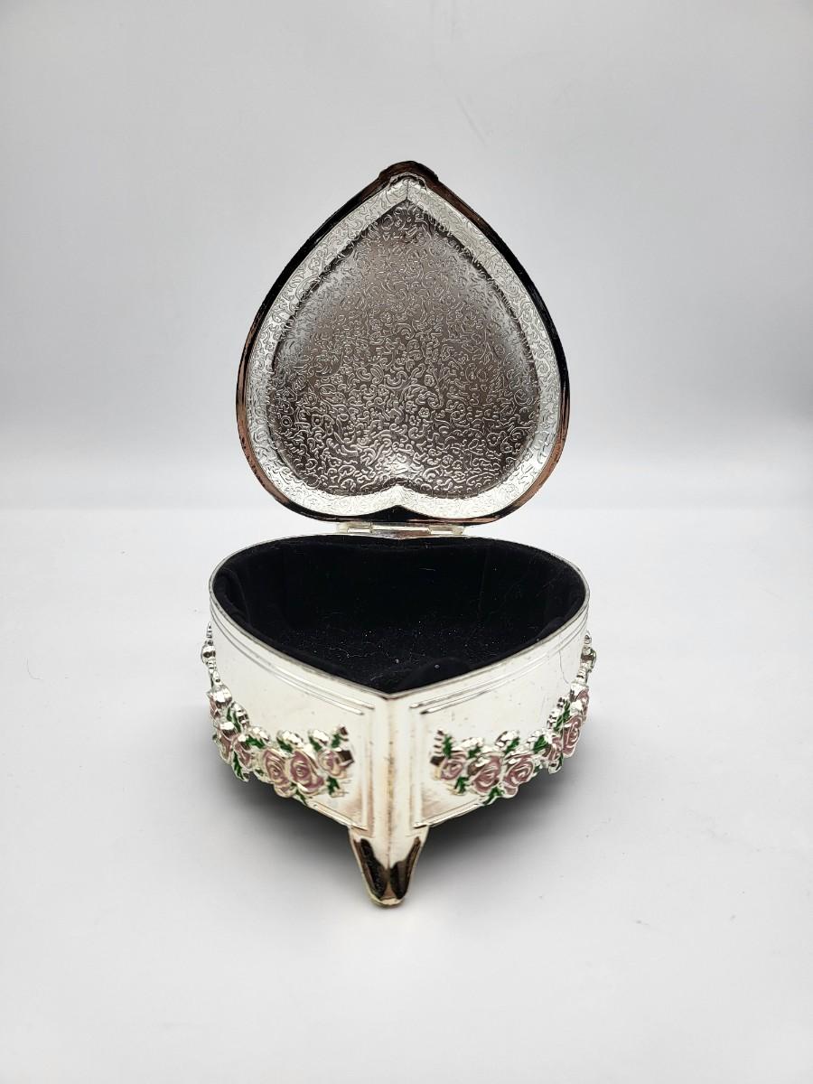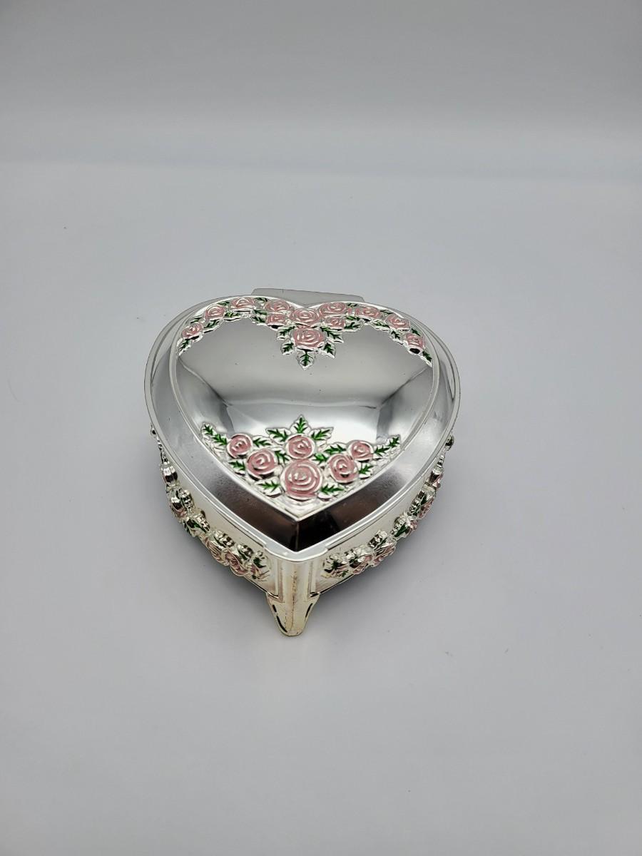 Silver & Pink Rose Heart Shaped Jewelry Box