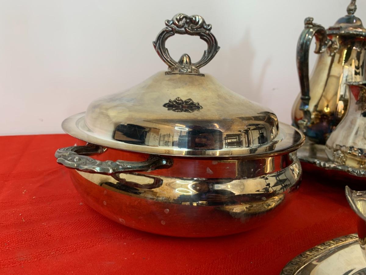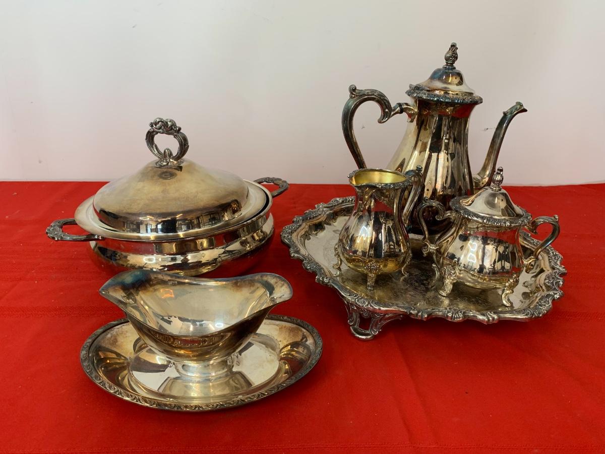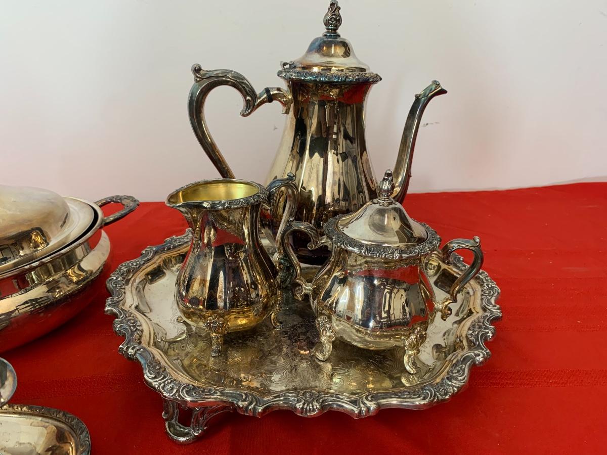 Silver plated kitchenware includes a platter, pitcher, serving dish and more.