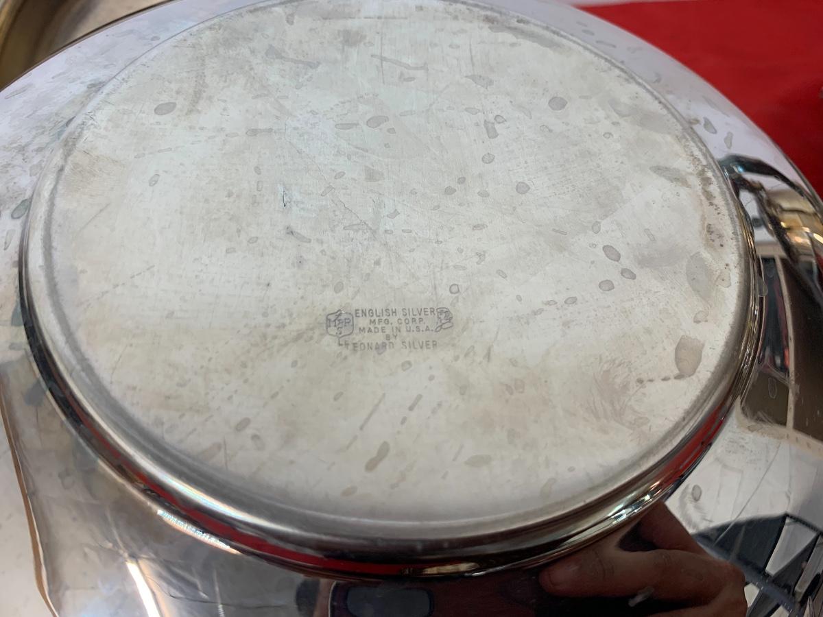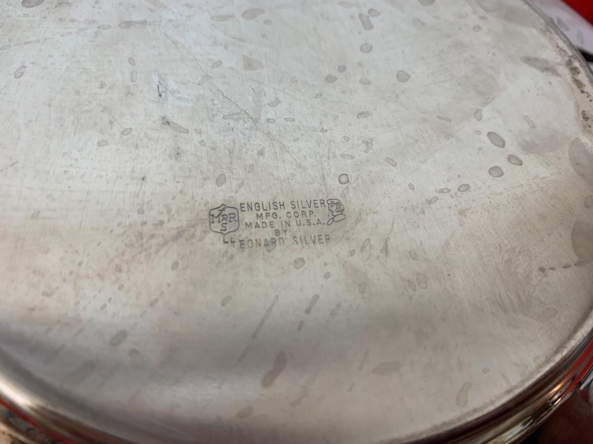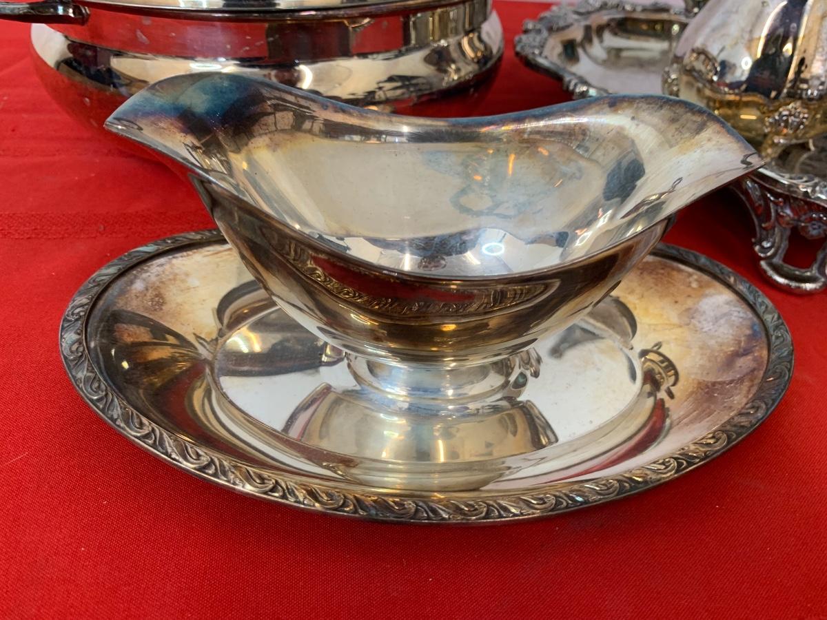 Silver plated kitchenware includes a platter, pitcher, serving dish and more.
