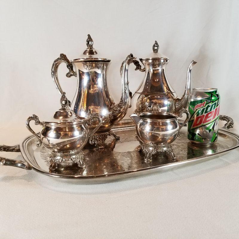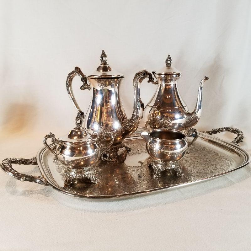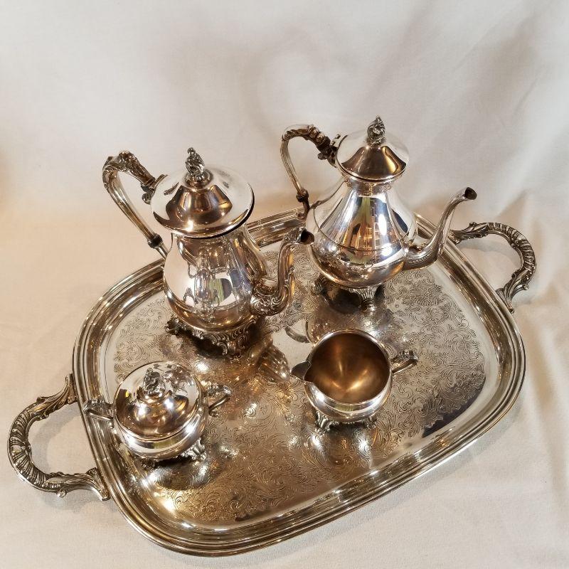 The charm of a silver collection such as this never wains. Includes a Coffee pot, sugar container with lid, creamer and a large tray that are all marked Pilgrim Silver Plate. Sugar and creamer both have a few slight dents, coffee pot is quite good as is the large tray. Tray is 22 inches long.