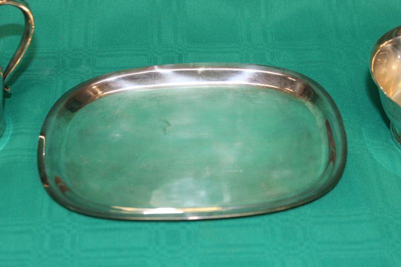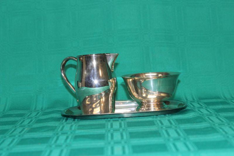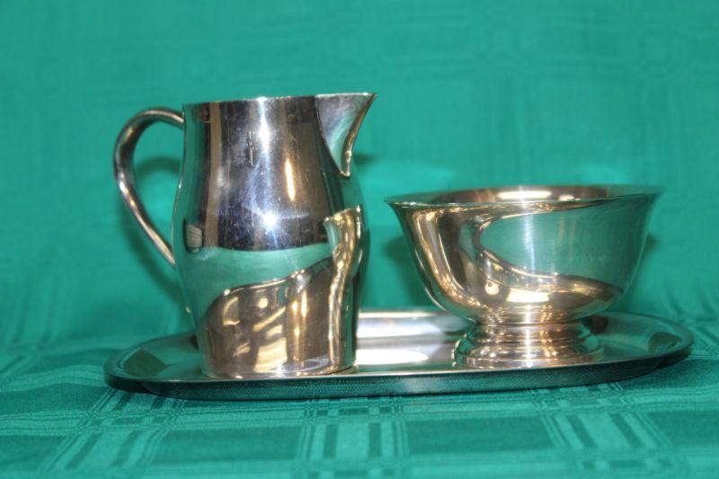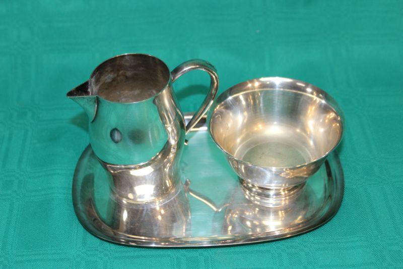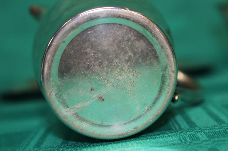 Silver plate Cream and sugar set. Paul Revere reproduction. Tray has a ding in the side. Pieces will probably shine up more, only polished a little to see condition.