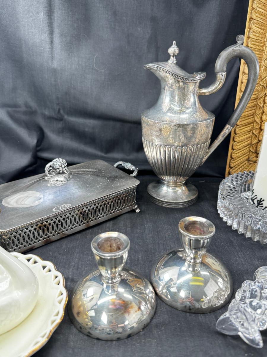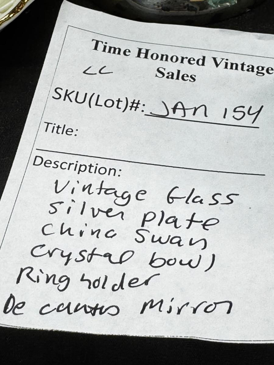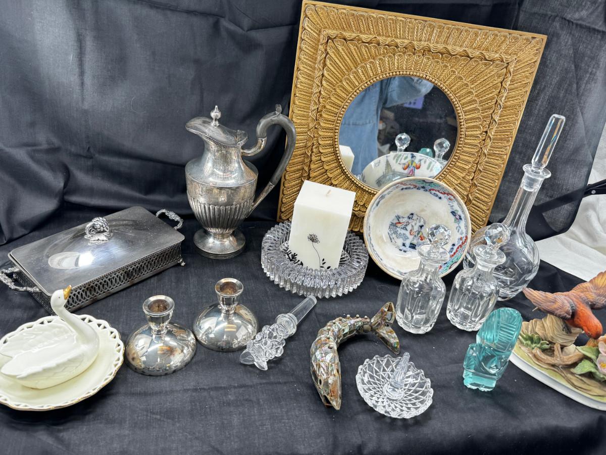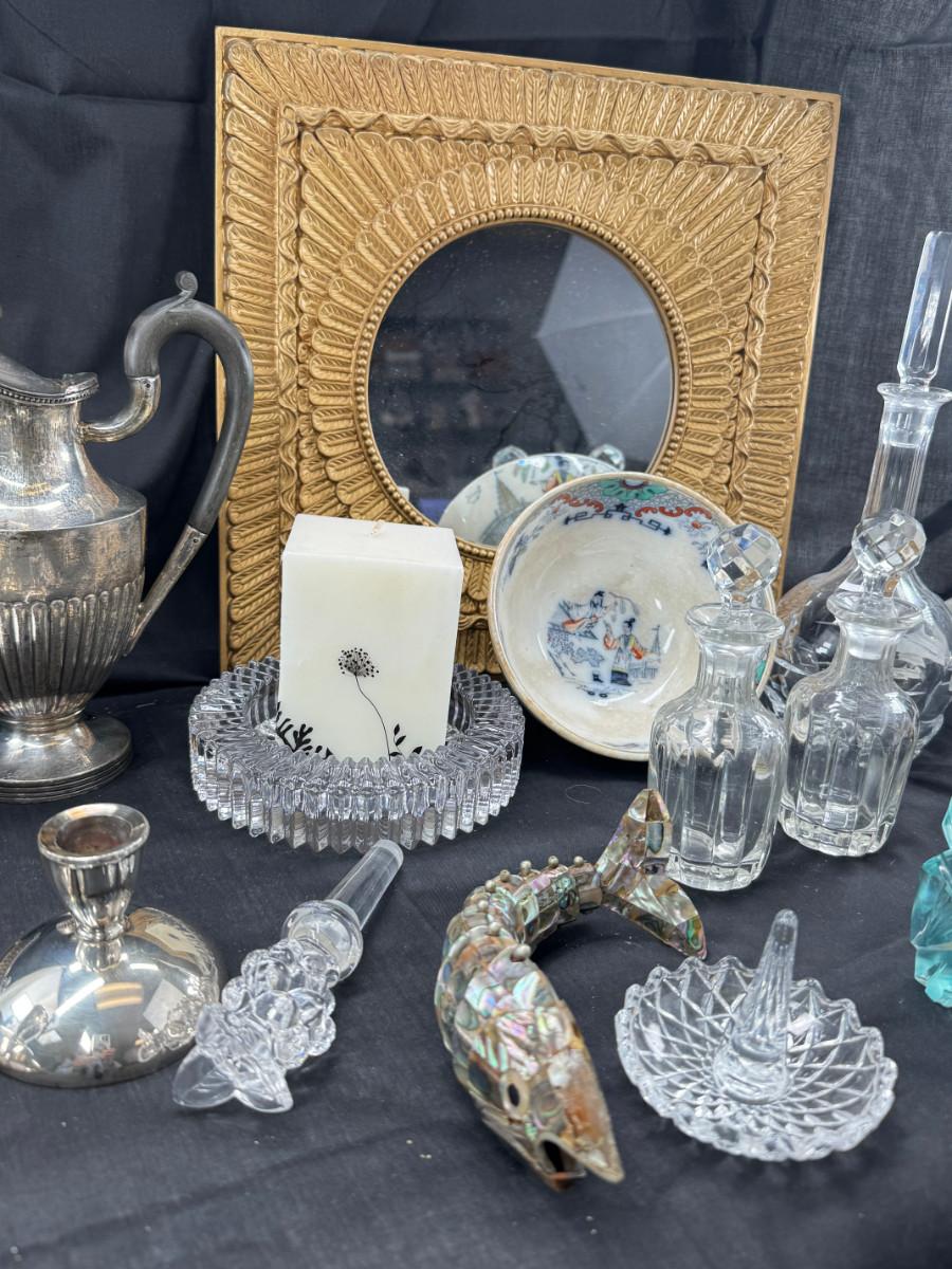 Silver plated relish tray with glass insert and lid, Hallmarked coffee pot with ebony handle, decanters, MOP flexible fish ( damage see pic) Aqua blue glass Tiki, brand new white square candle, vintage Chinese bowl. Crystal saw tooth trinket bowl ( slight damage on bottom) 2 ring holders Antique multi color Asian (1836-1880) P. REGOUT Maastricht 6" Soup Bowl Beautiful Scenes, some discoloration inside. Circle mirror.