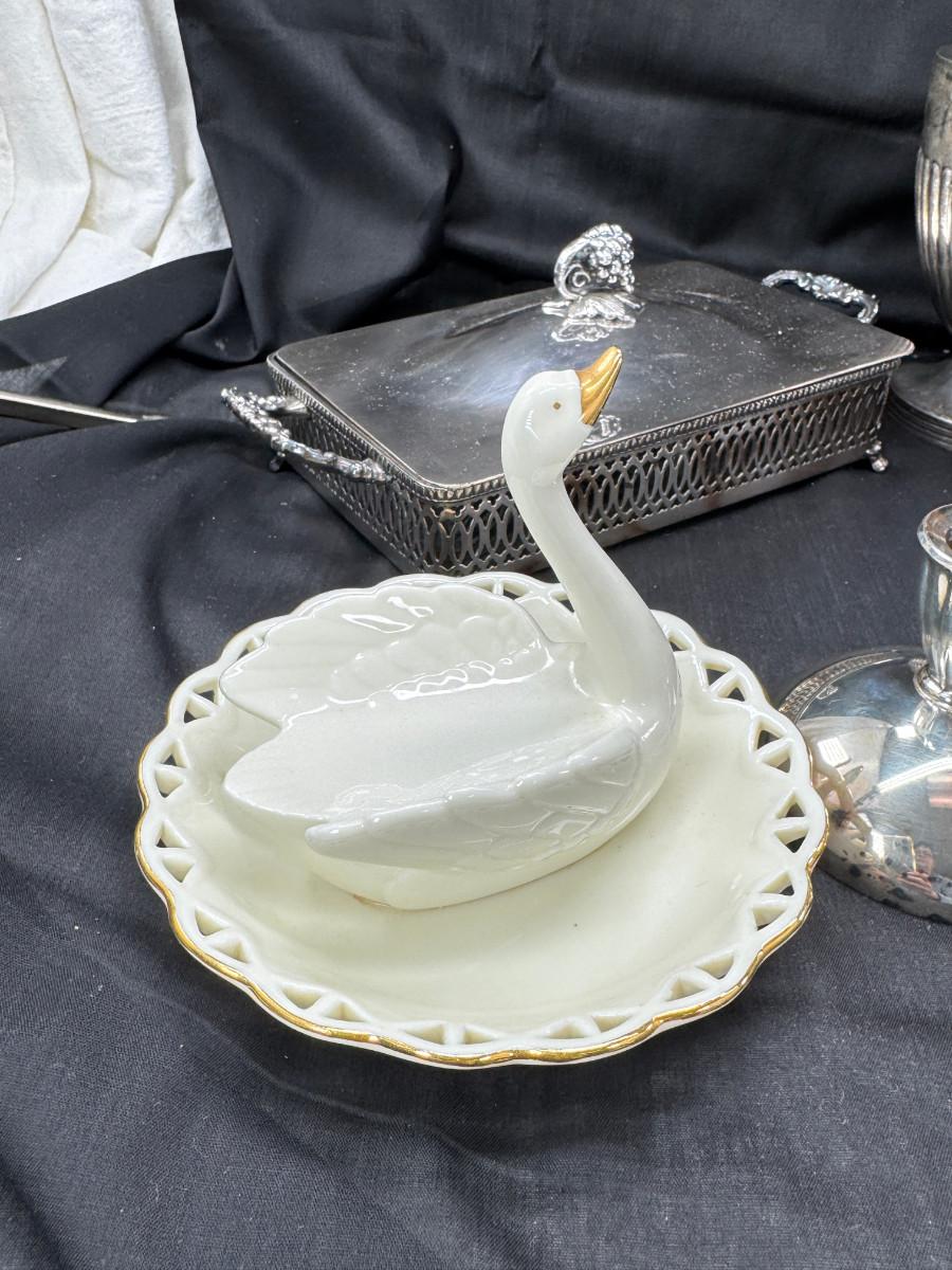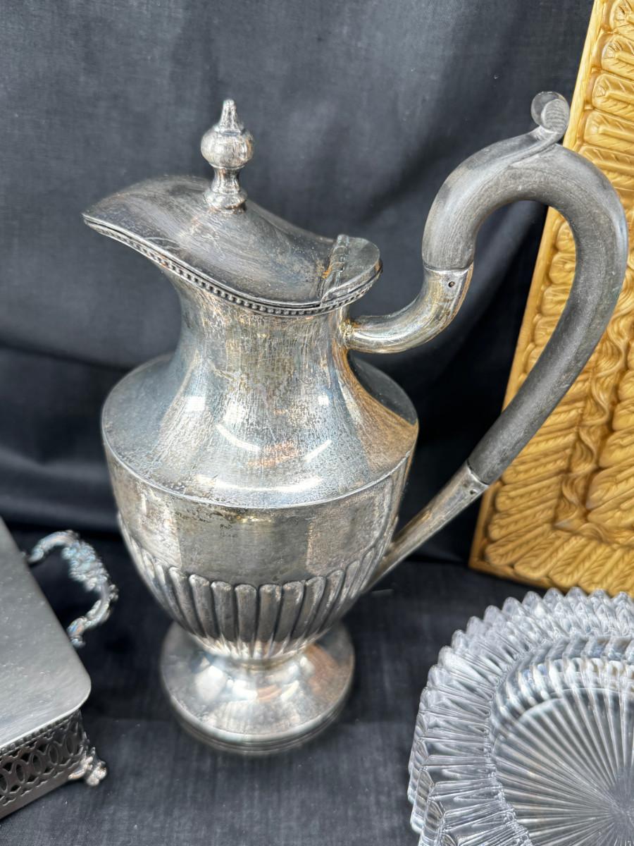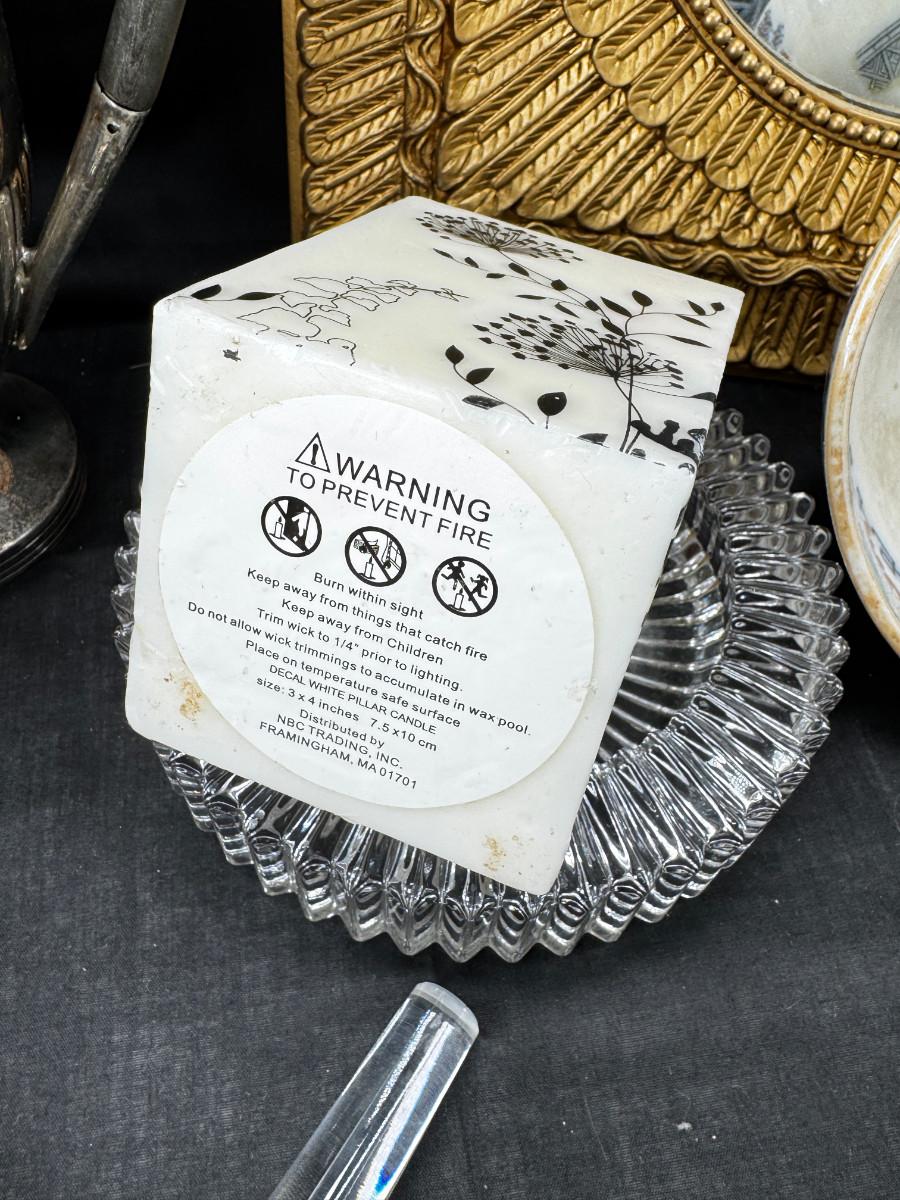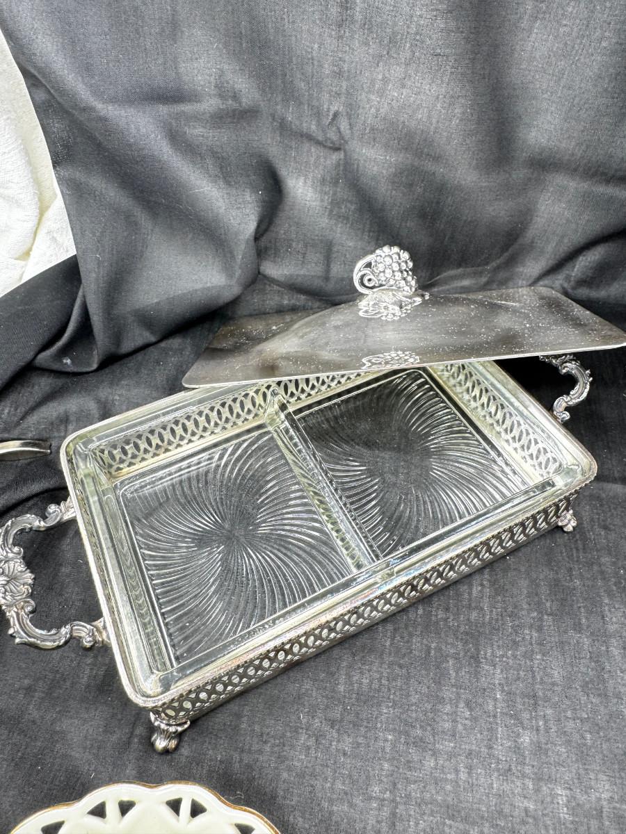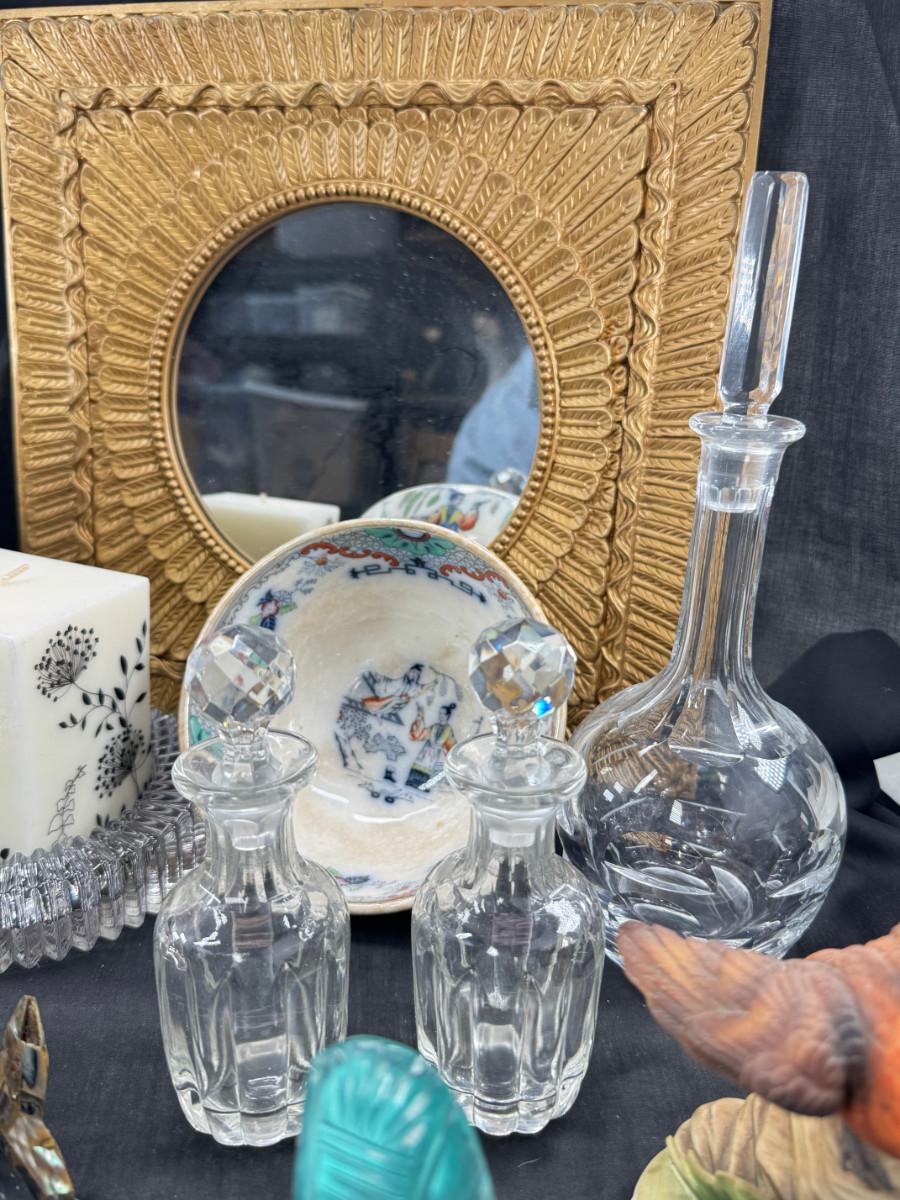 Silver plated relish tray with glass insert and lid, Hallmarked coffee pot with ebony handle, decanters, MOP flexible fish ( damage see pic) Aqua blue glass Tiki, brand new white square candle, vintage Chinese bowl. Crystal saw tooth trinket bowl ( slight damage on bottom) 2 ring holders Antique multi color Asian (1836-1880) P. REGOUT Maastricht 6" Soup Bowl Beautiful Scenes, some discoloration inside. Circle mirror.
