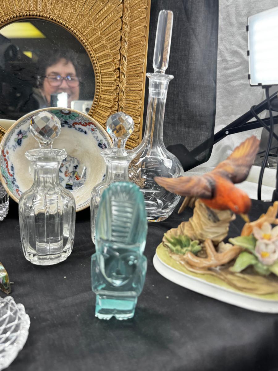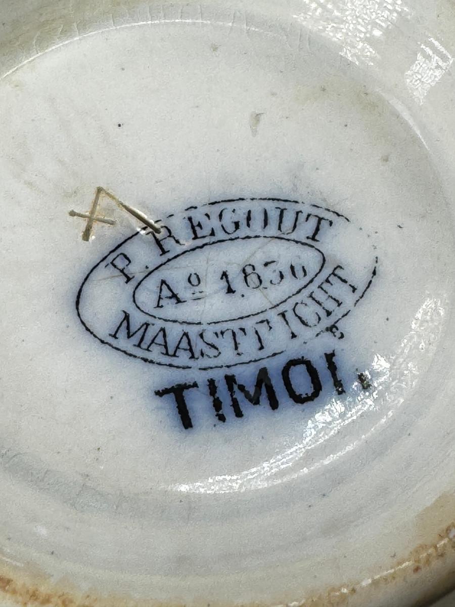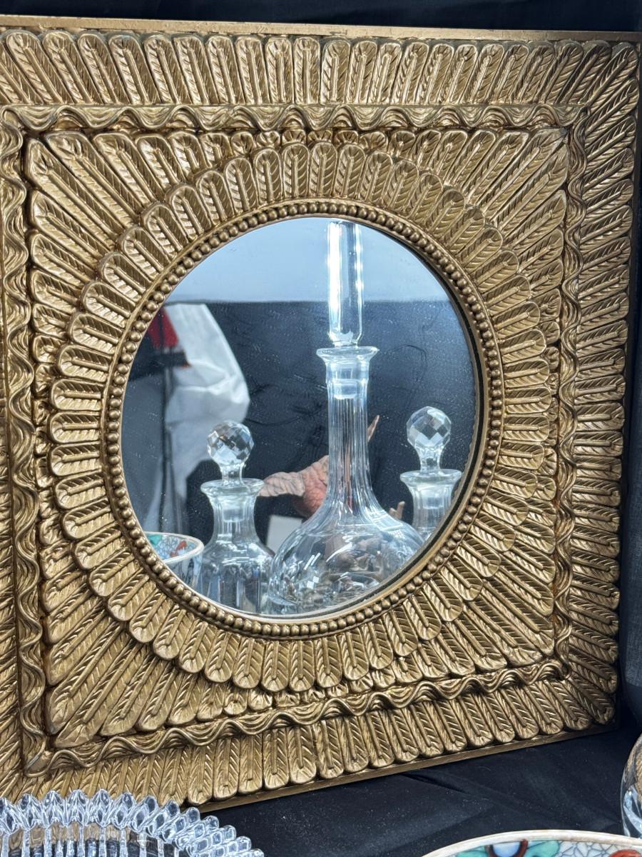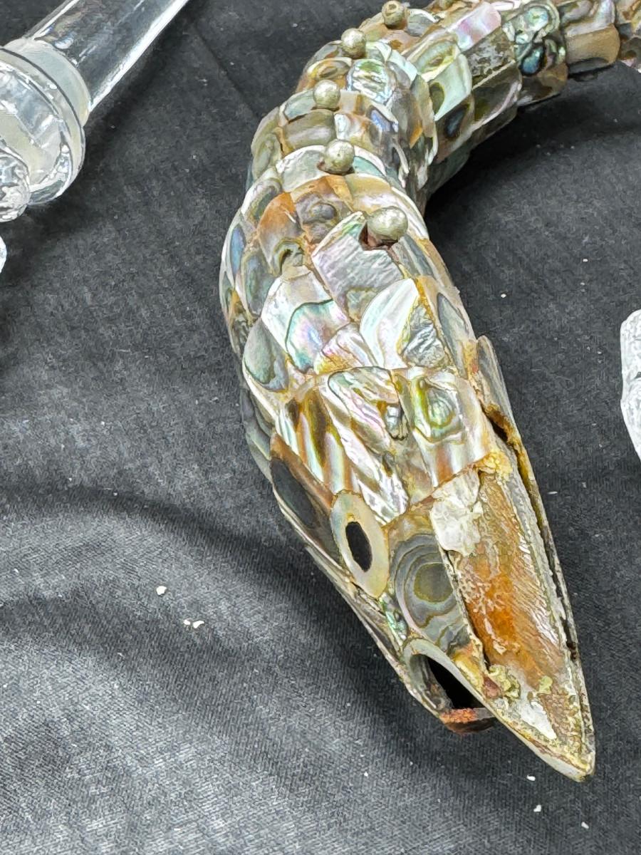 Silver plated relish tray with glass insert and lid, Hallmarked coffee pot with ebony handle, decanters, MOP flexible fish ( damage see pic) Aqua blue glass Tiki, brand new white square candle, vintage Chinese bowl. Crystal saw tooth trinket bowl ( slight damage on bottom) 2 ring holders Antique multi color Asian (1836-1880) P. REGOUT Maastricht 6" Soup Bowl Beautiful Scenes, some discoloration inside. Circle mirror.