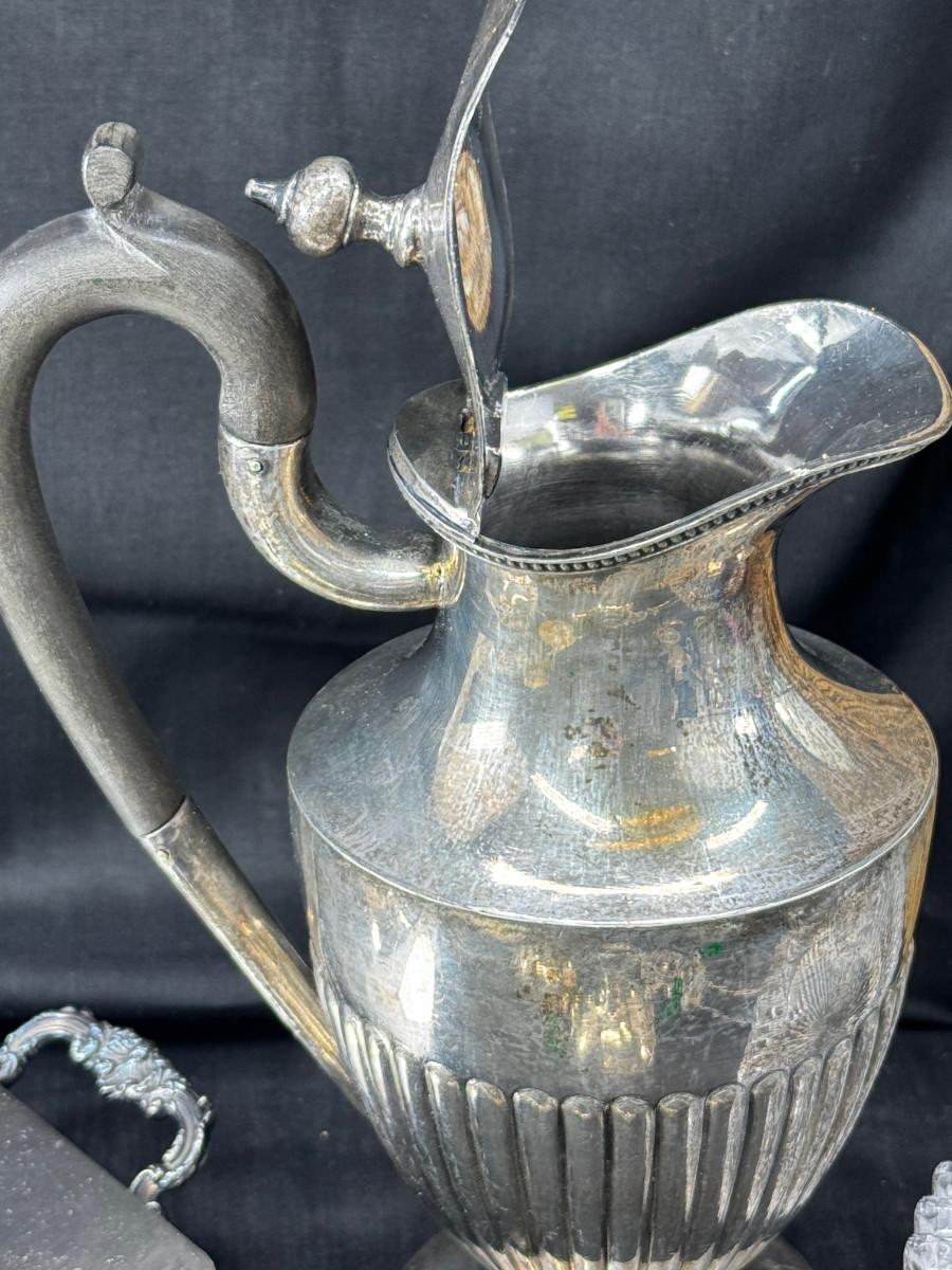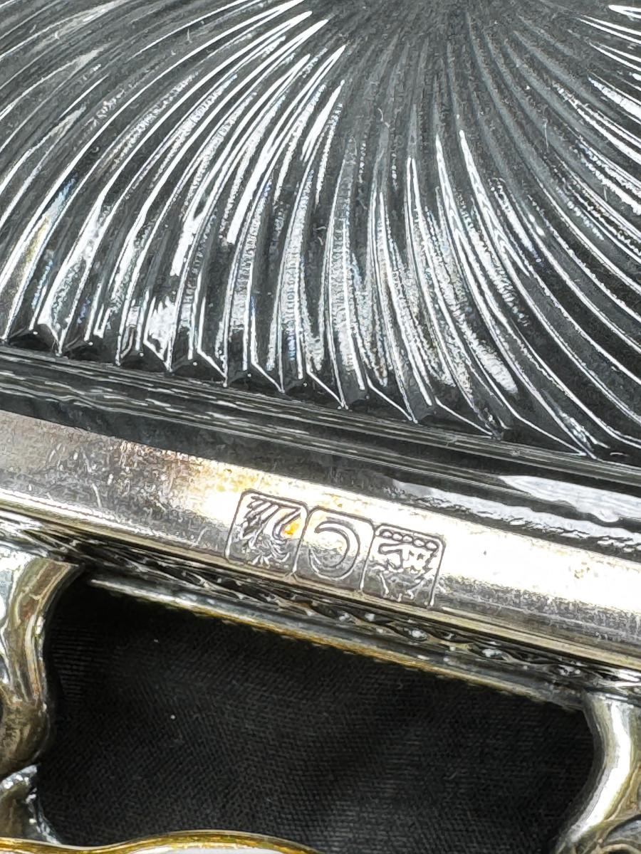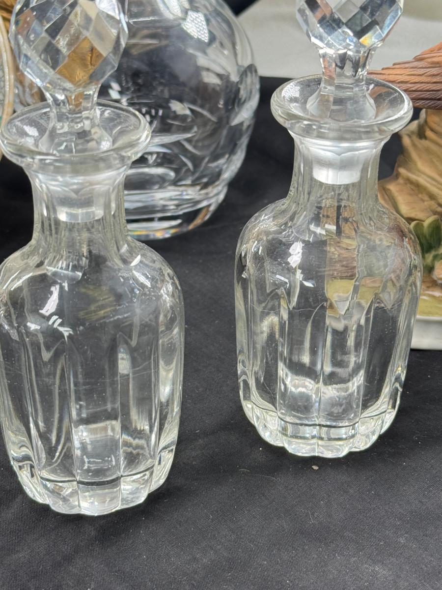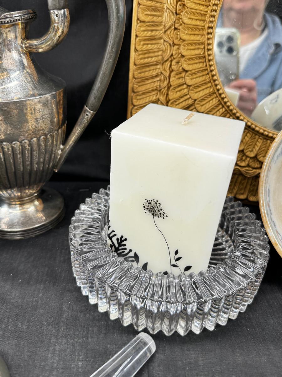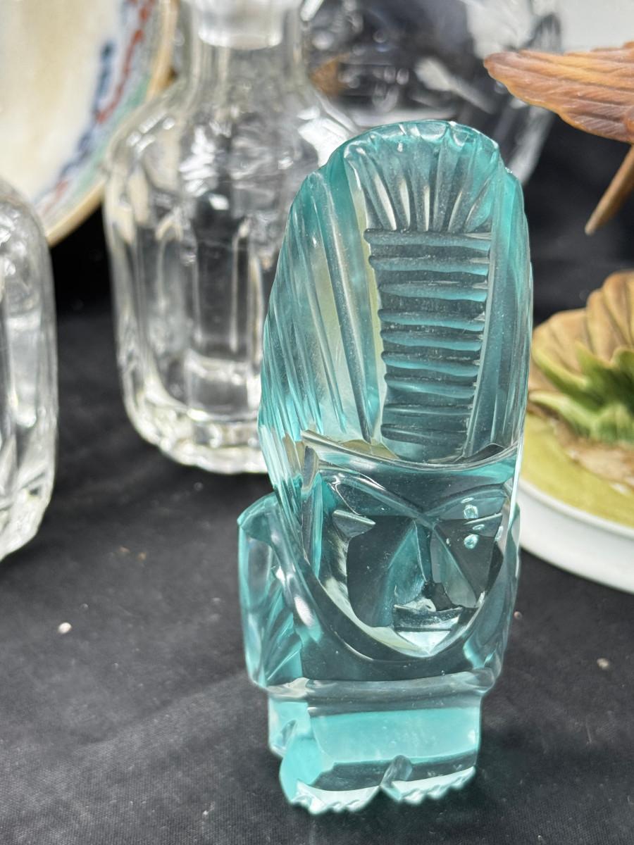 Silver plated relish tray with glass insert and lid, Hallmarked coffee pot with ebony handle, decanters, MOP flexible fish ( damage see pic) Aqua blue glass Tiki, brand new white square candle, vintage Chinese bowl. Crystal saw tooth trinket bowl ( slight damage on bottom) 2 ring holders Antique multi color Asian (1836-1880) P. REGOUT Maastricht 6" Soup Bowl Beautiful Scenes, some discoloration inside. Circle mirror.