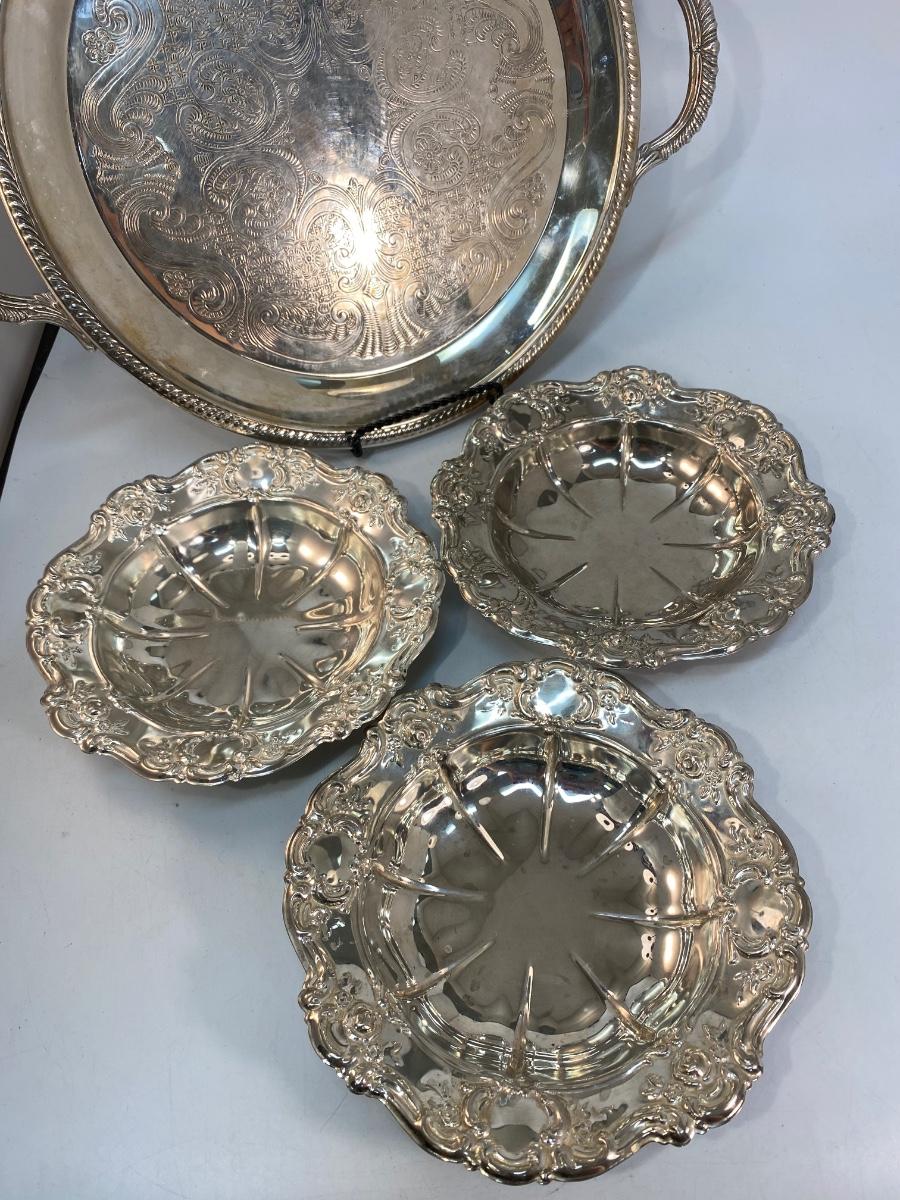 Silver Plate Double Handle Serving Tray & Three Small Serving Bowls