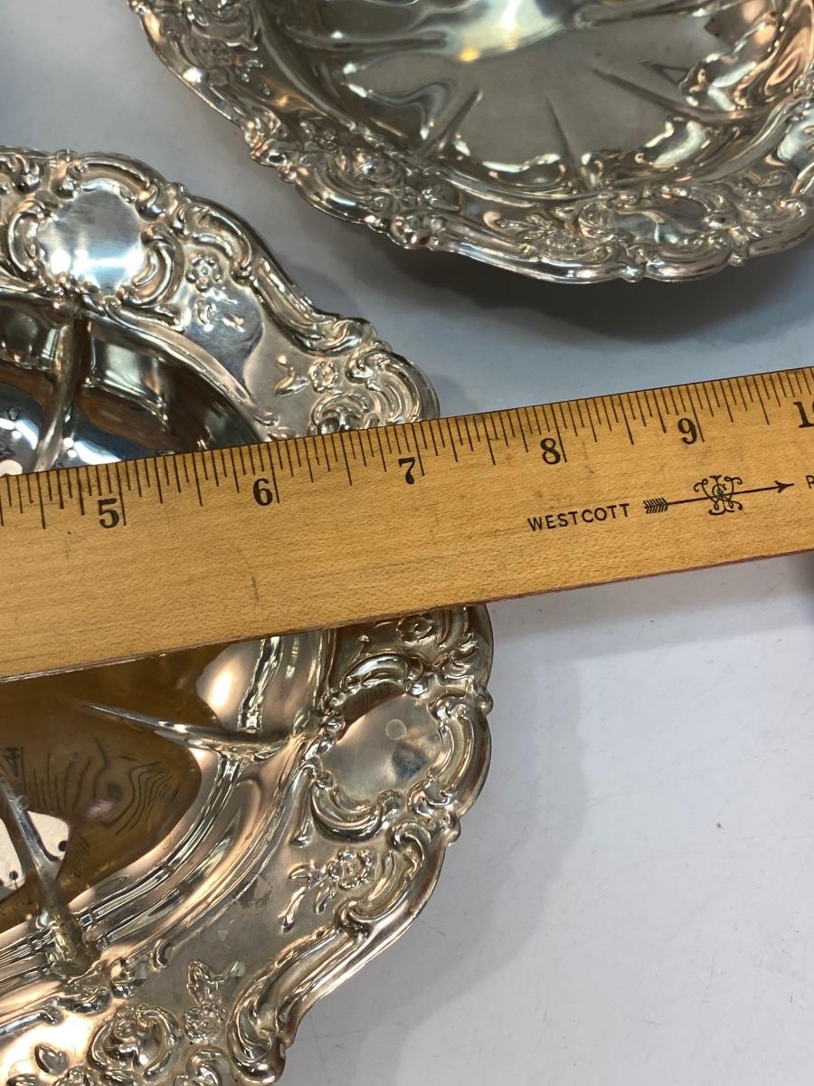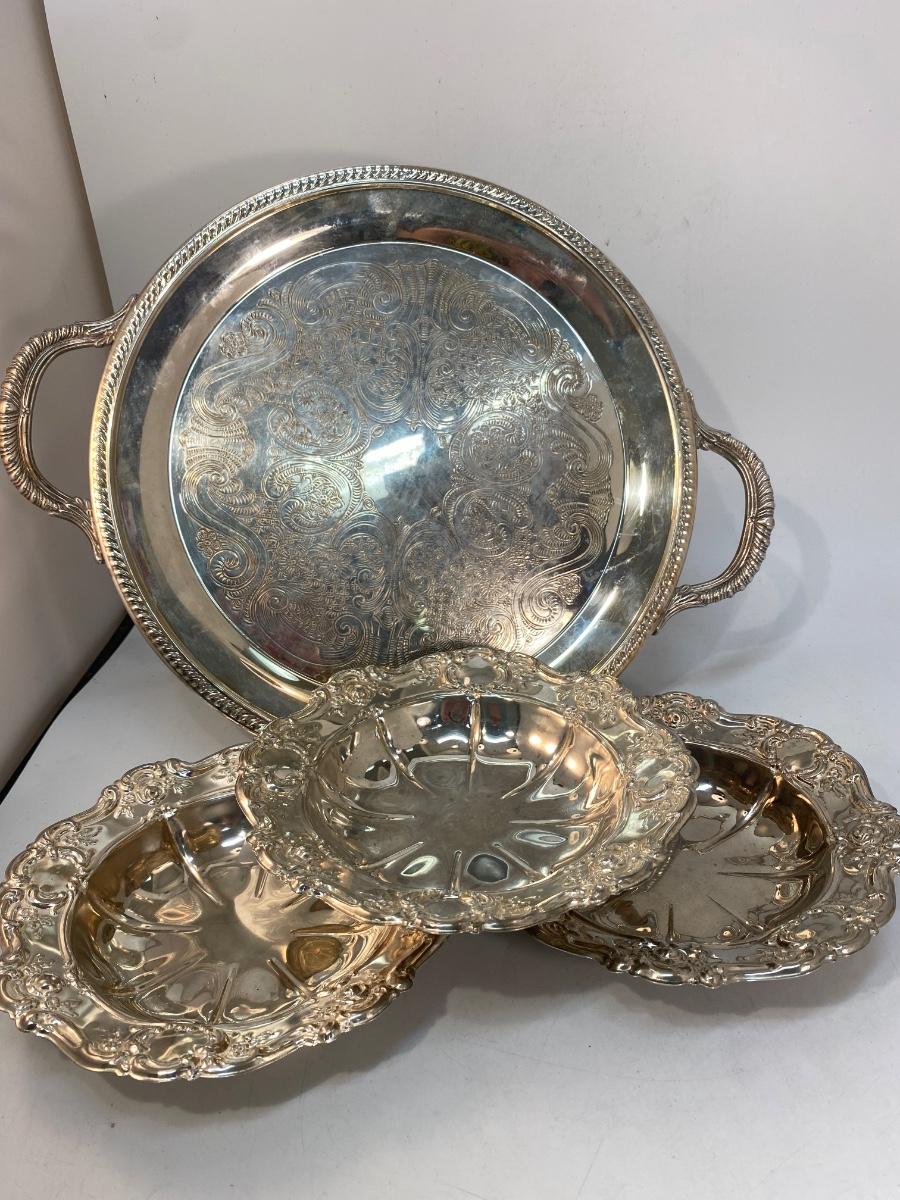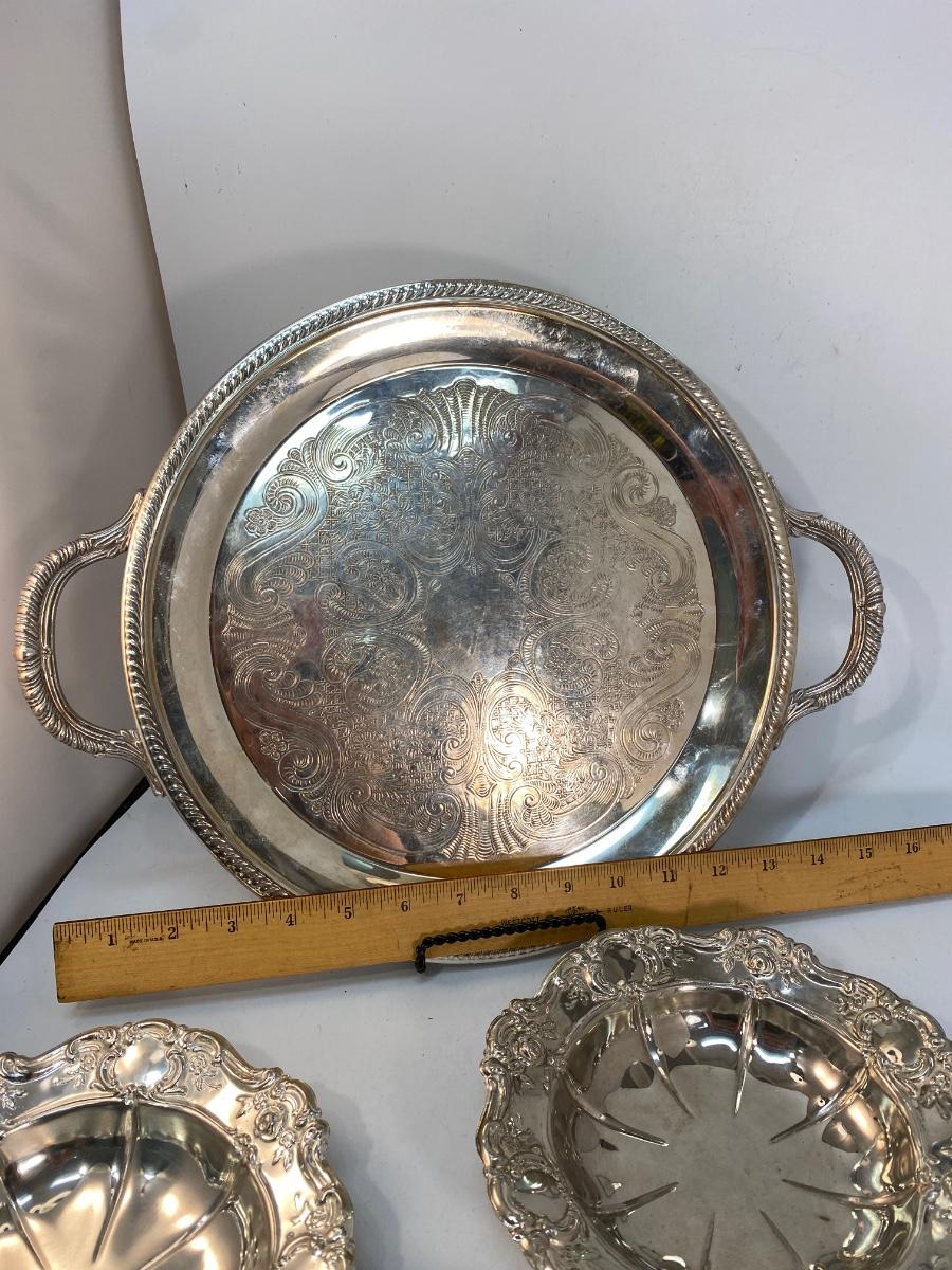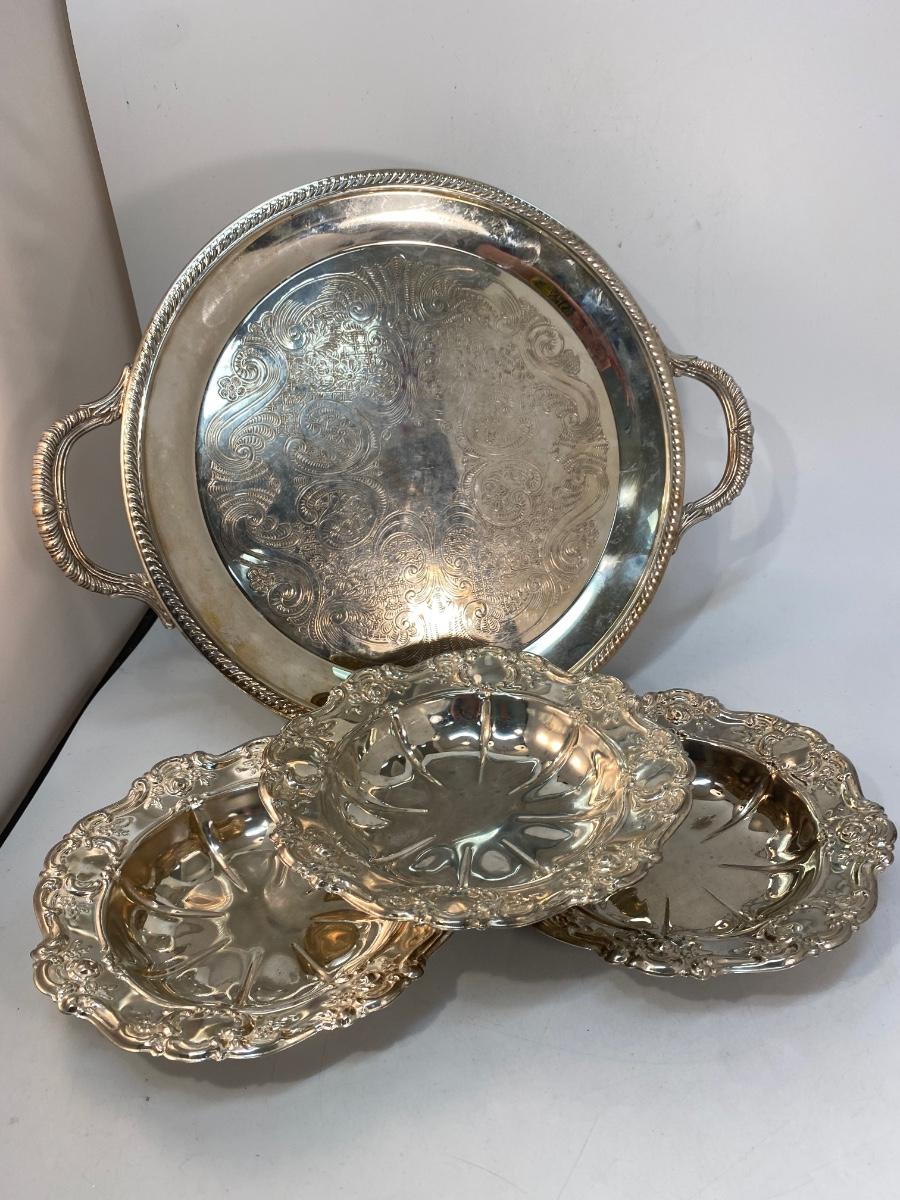 Silver Plate Double Handle Serving Tray & Three Small Serving Bowls. All pieces are in good condition. Tray is about 15” handle to handle. Small bowls about 7.5”diameter.