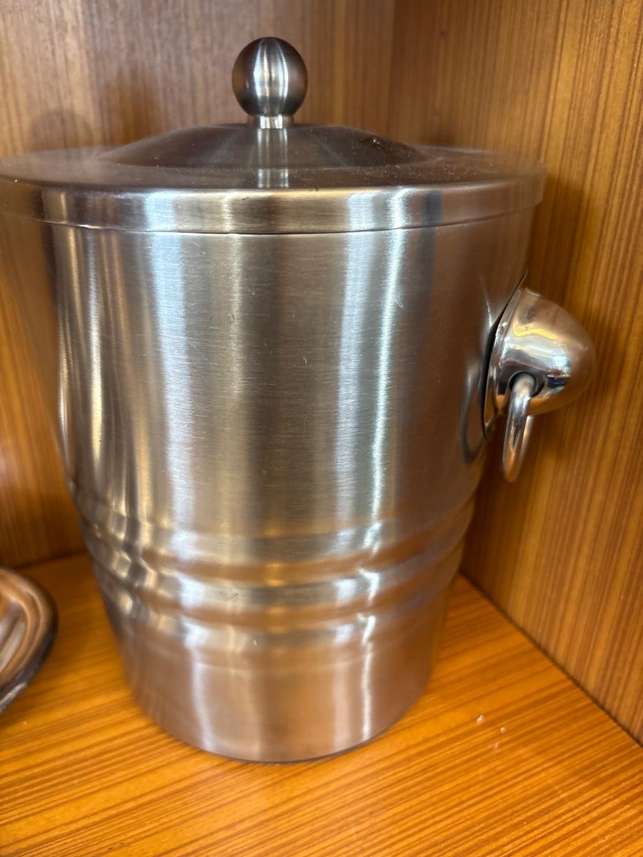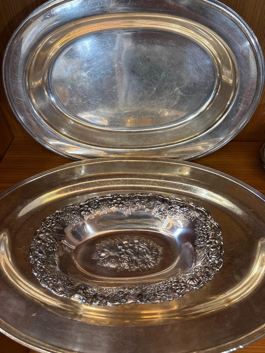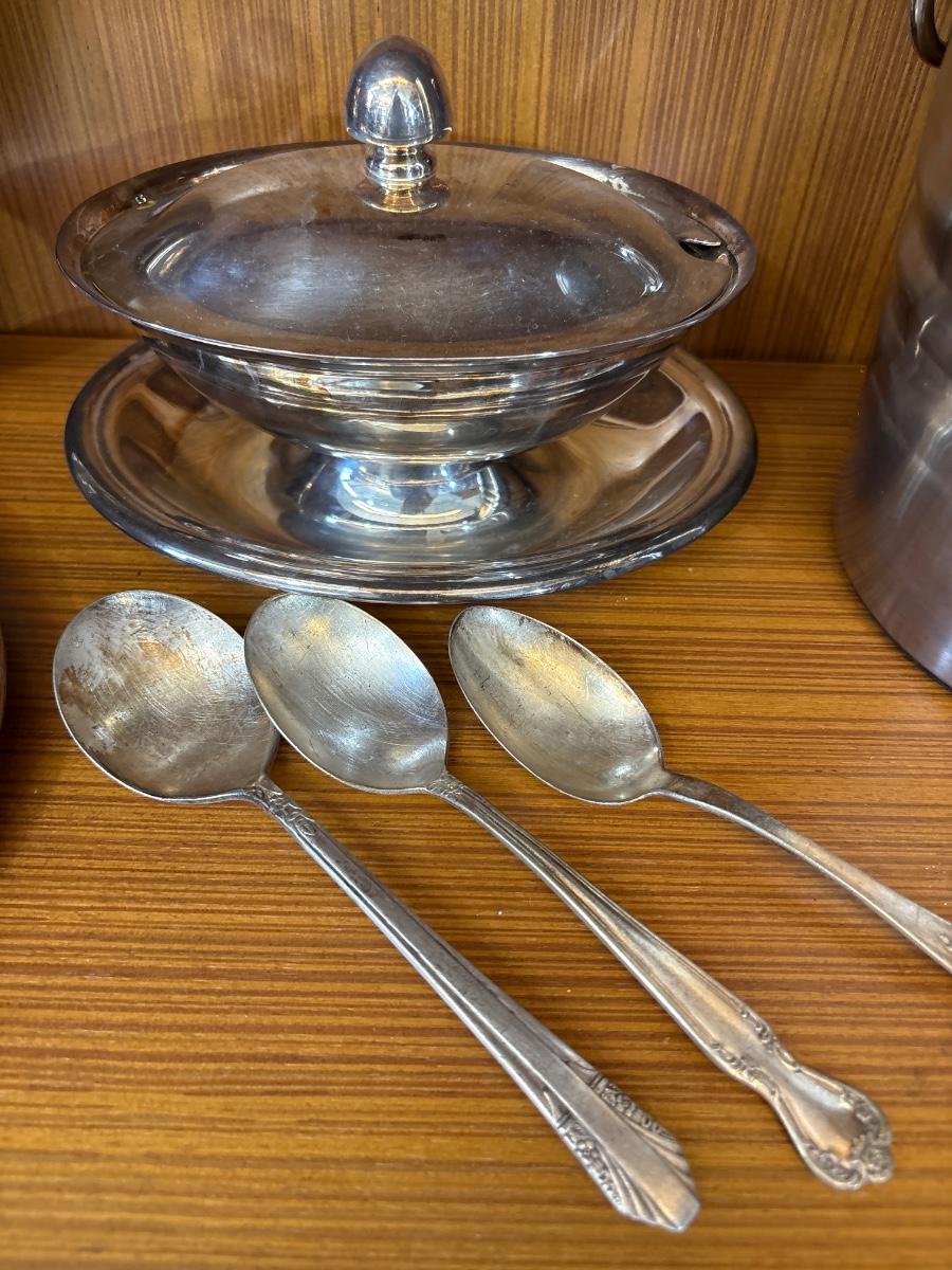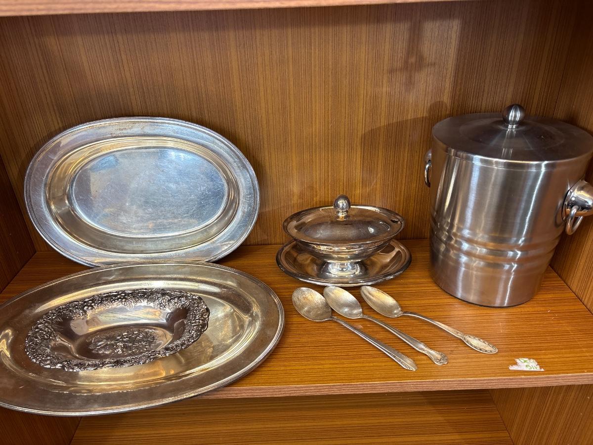 Silver plate ice bucket, trays, gravy boat, and spoons