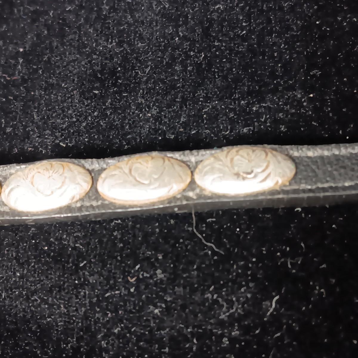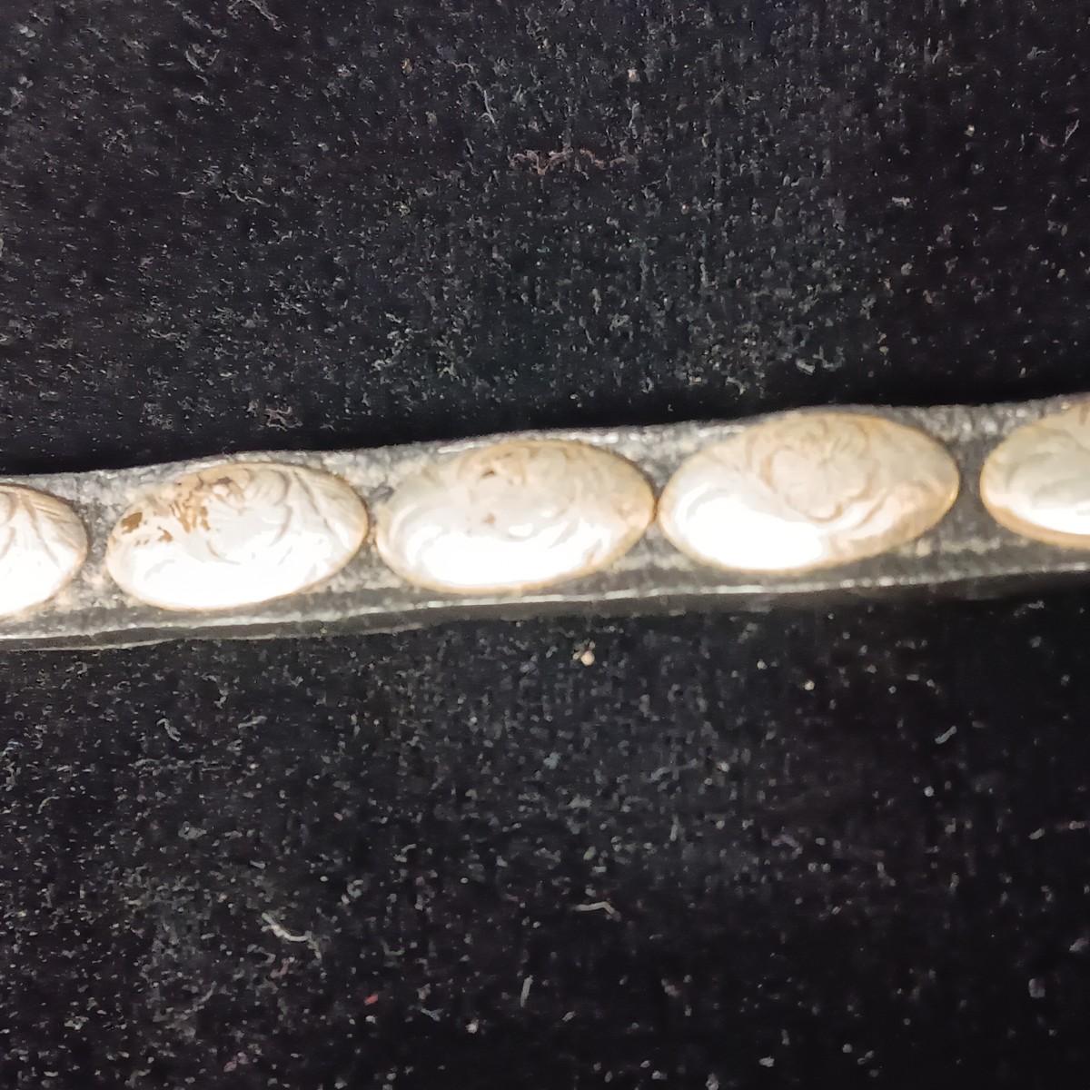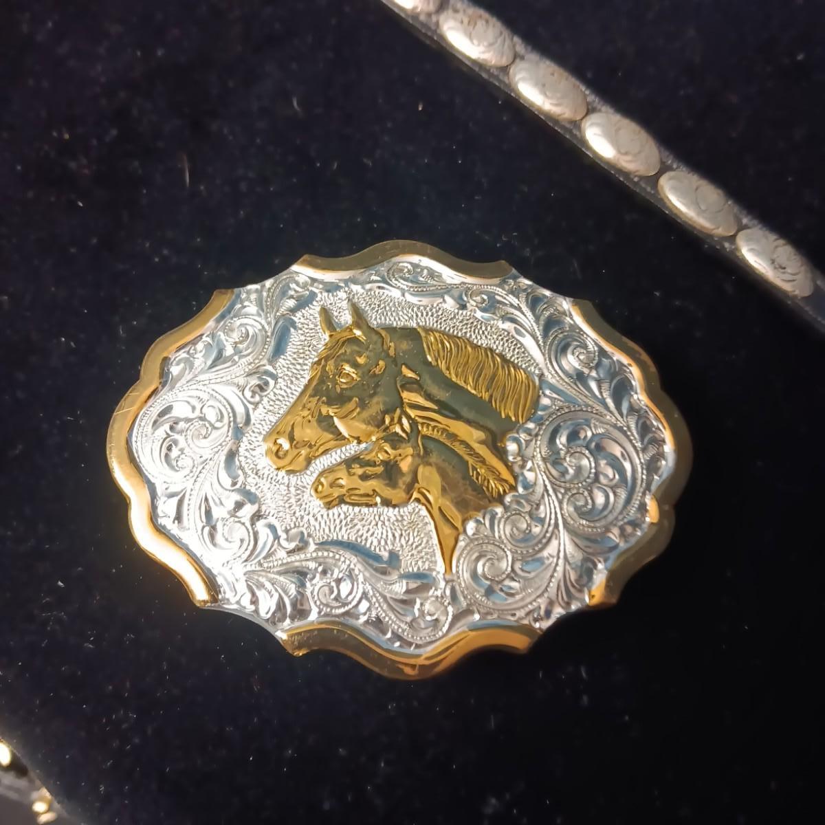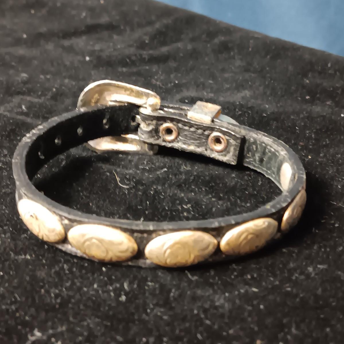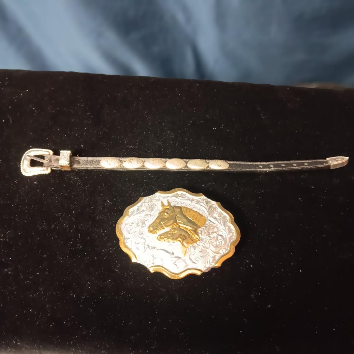SILVER PLATE ON BRONZE BELT BUCKLE AND LEATHER W/CONCHO BRACELET