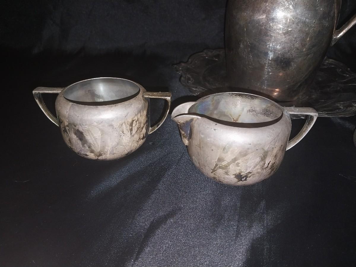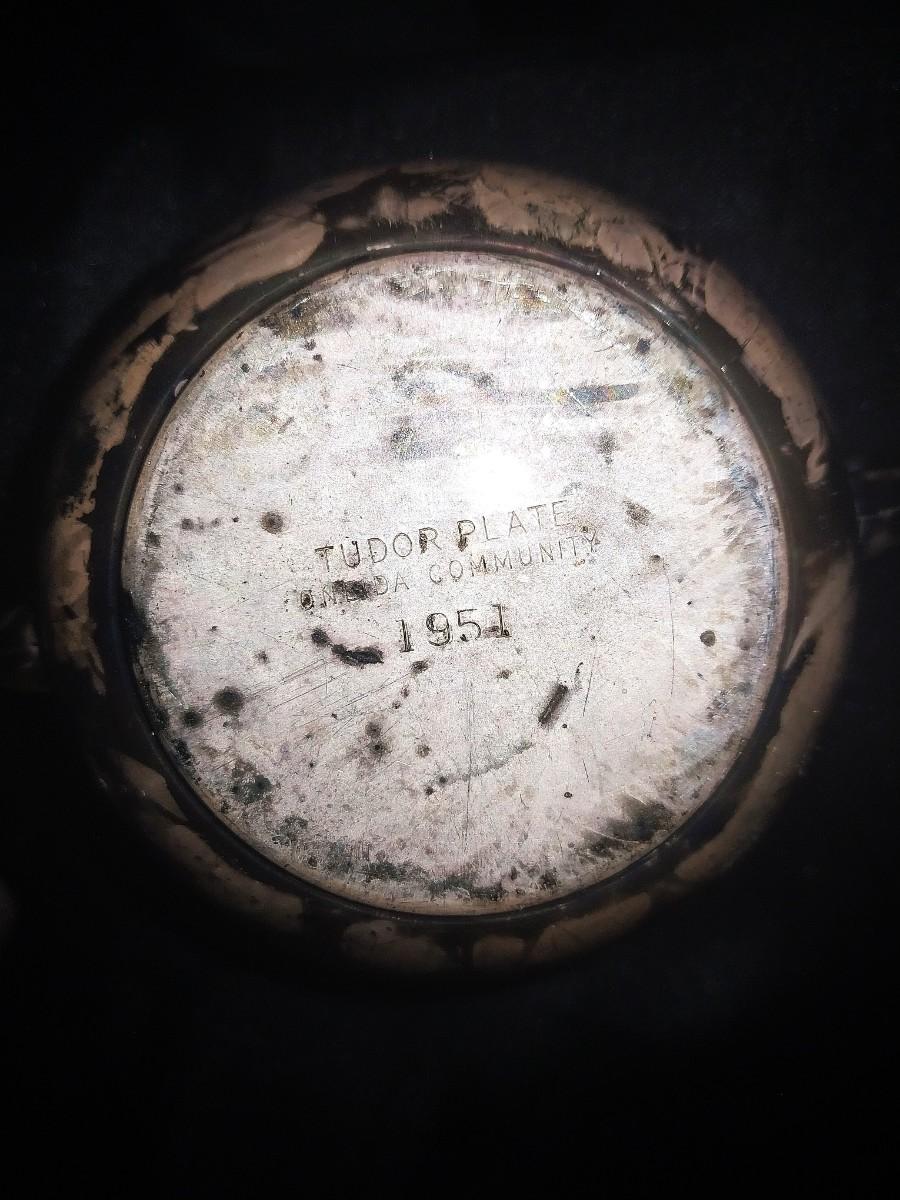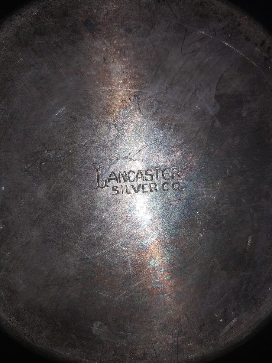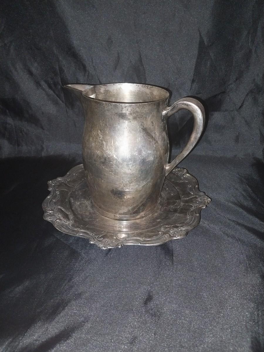 SILVER PLATE PIECES-WATER PITCHER (HEAVY) -CUPS-NAPKIN RINGS AND PLATTER LANCASTOR SILVER COMPANY, TUDOR PLATE