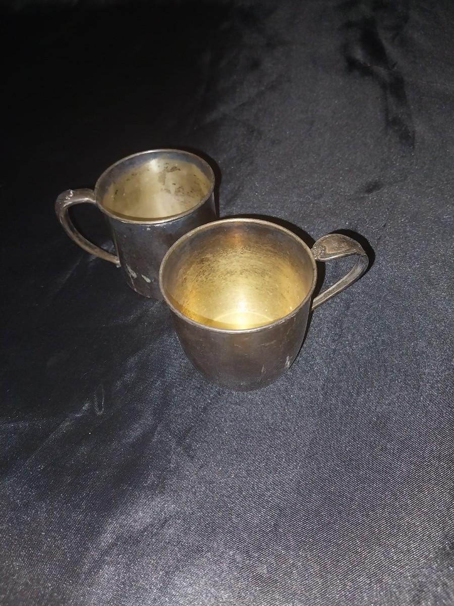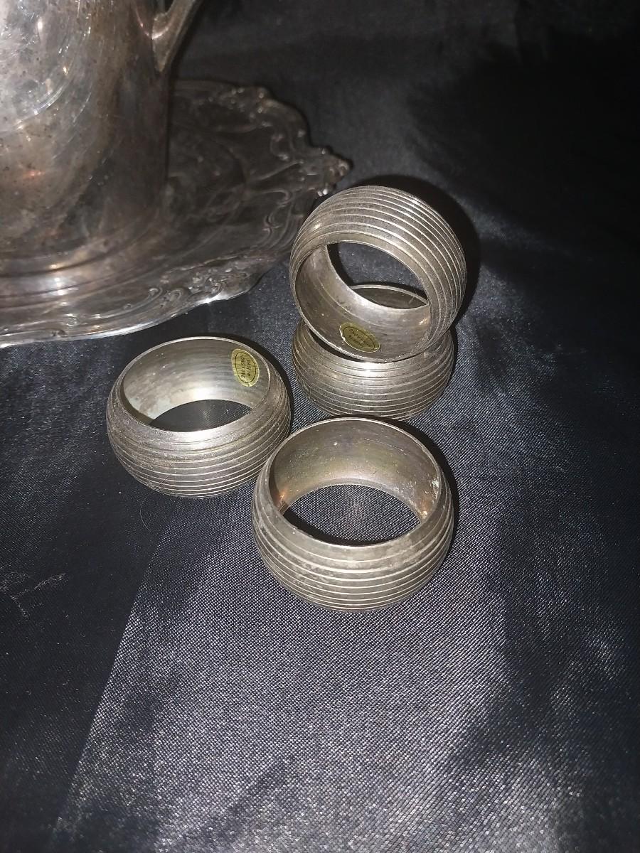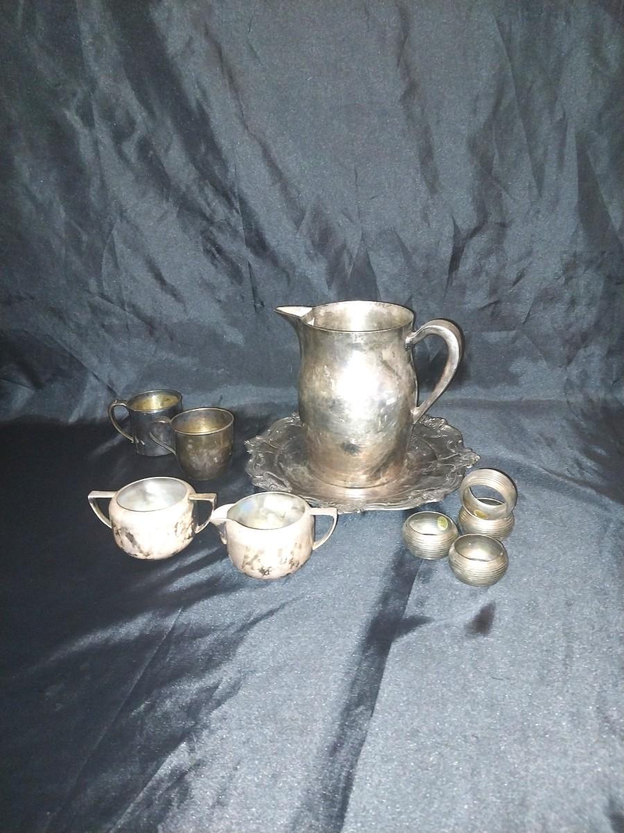 SILVER PLATE PIECES-WATER PITCHER-CUPS-NAPKIN RINGS AND PLATTER
