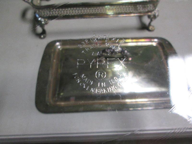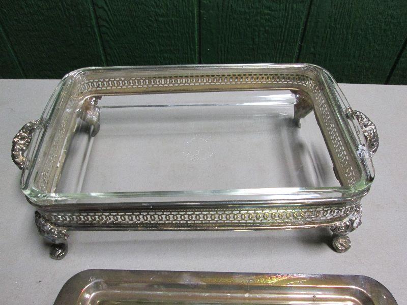 Silver Plate Rectangular Footed Serving Tray With Lid & Pryex Dish