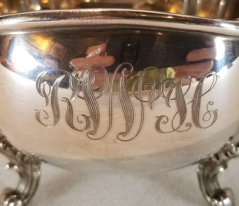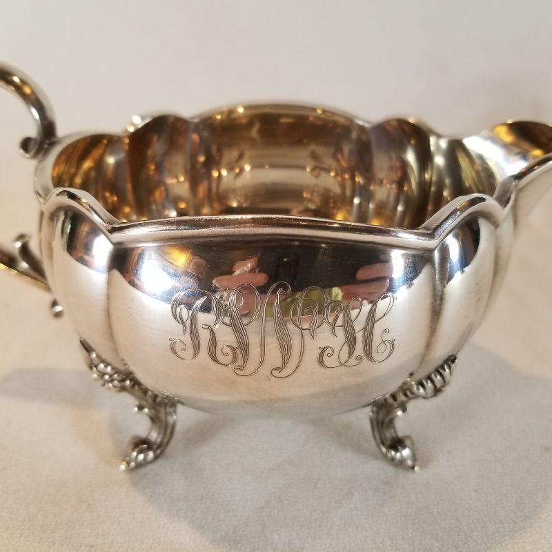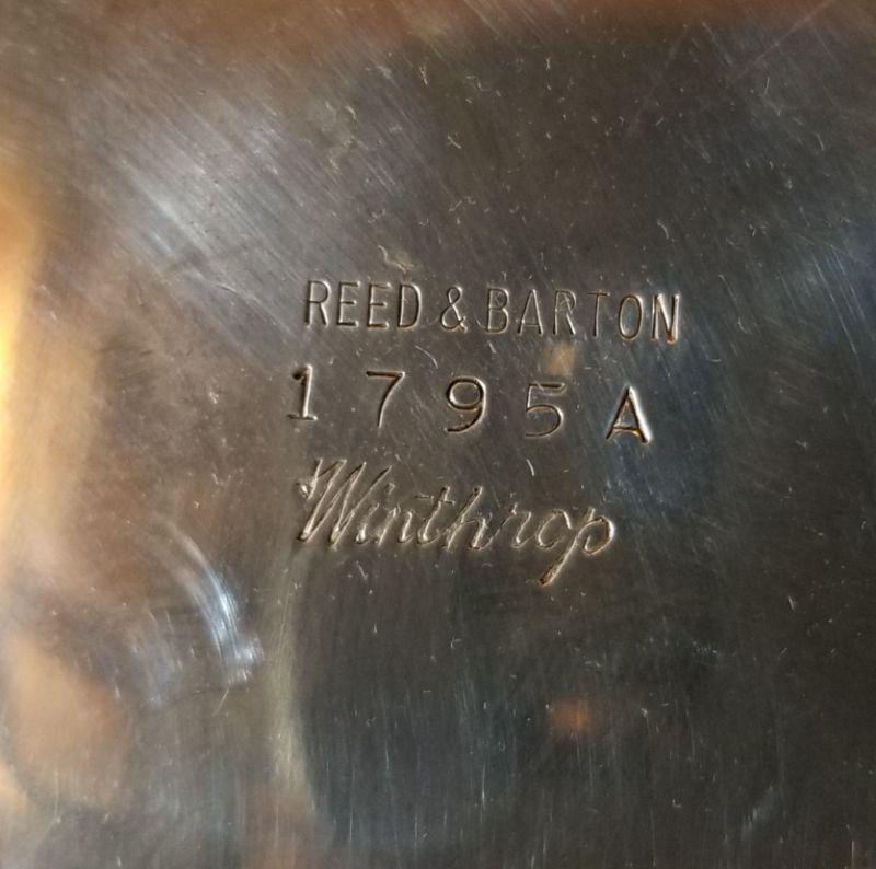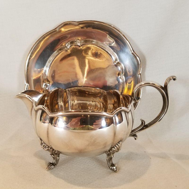 Very nice Reed & Barton "Winthrop" #1795A Sauce Boat and matching under plate. Some scratches and minor dents consistent with use and age. One side of sauce boat is monogrammed "RWH." Plating is in very good shape, overall very good condition. Excellent for your next blow-out buffet or Thanksgiving Dinner.
