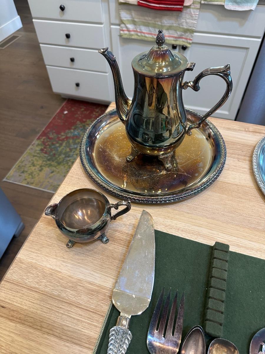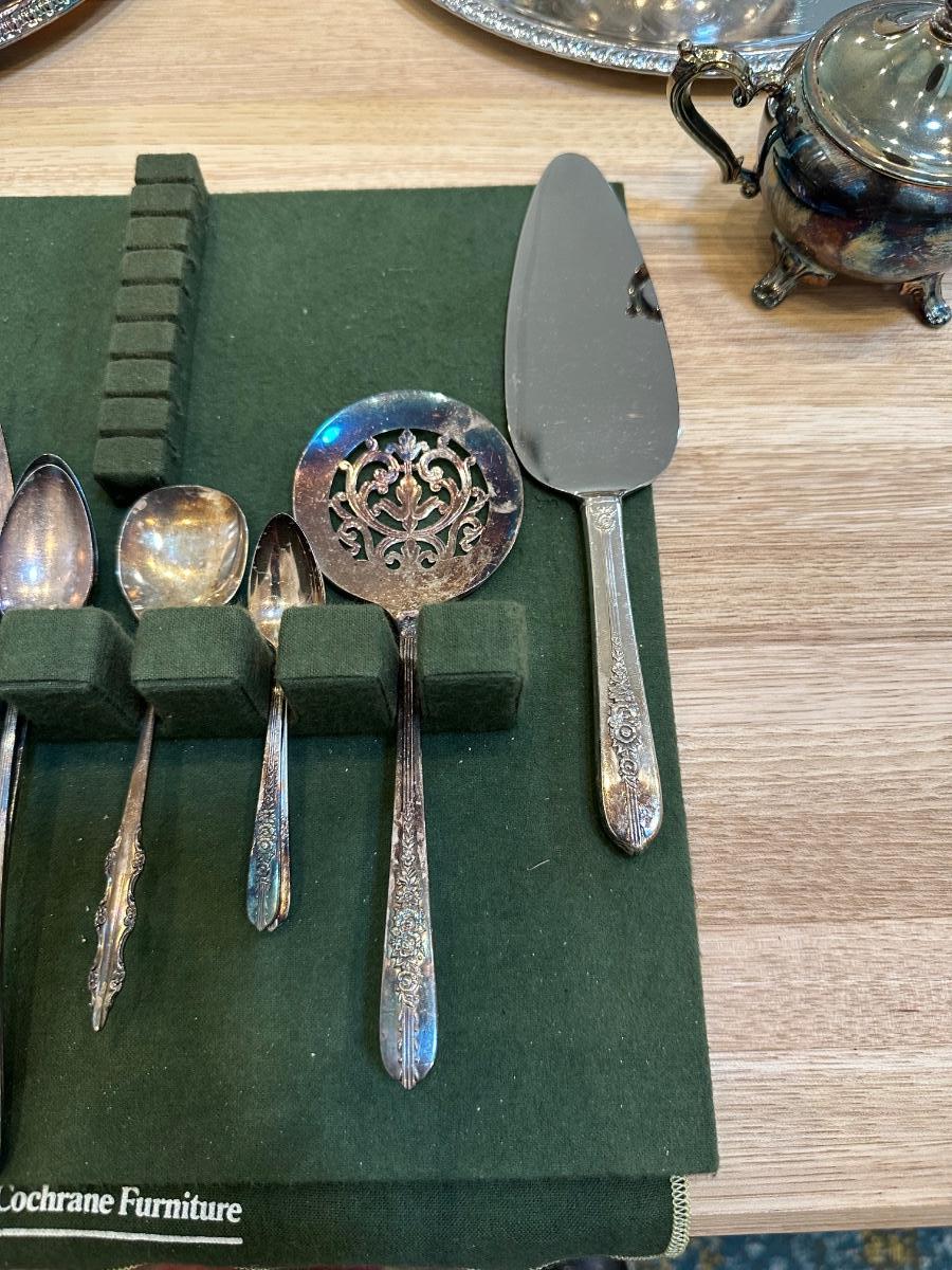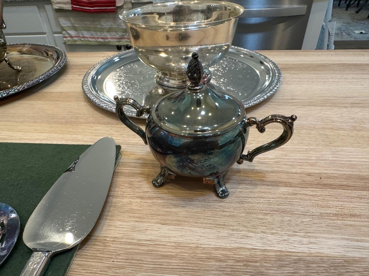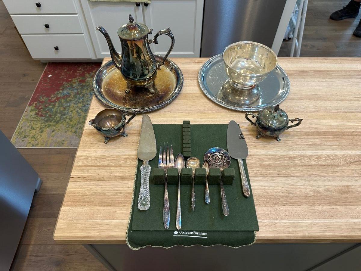SILVER PLATE TEA SERVICE AND SERVING PIECES