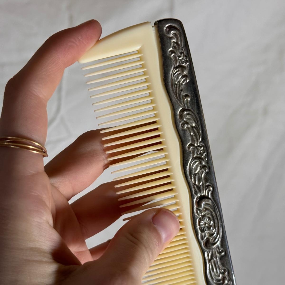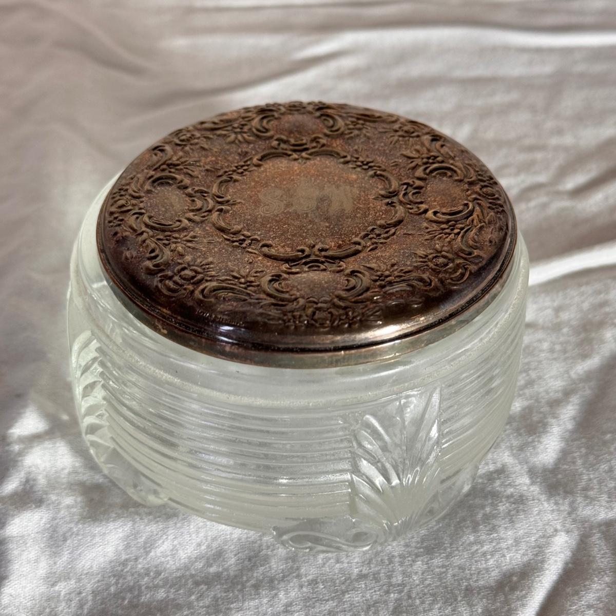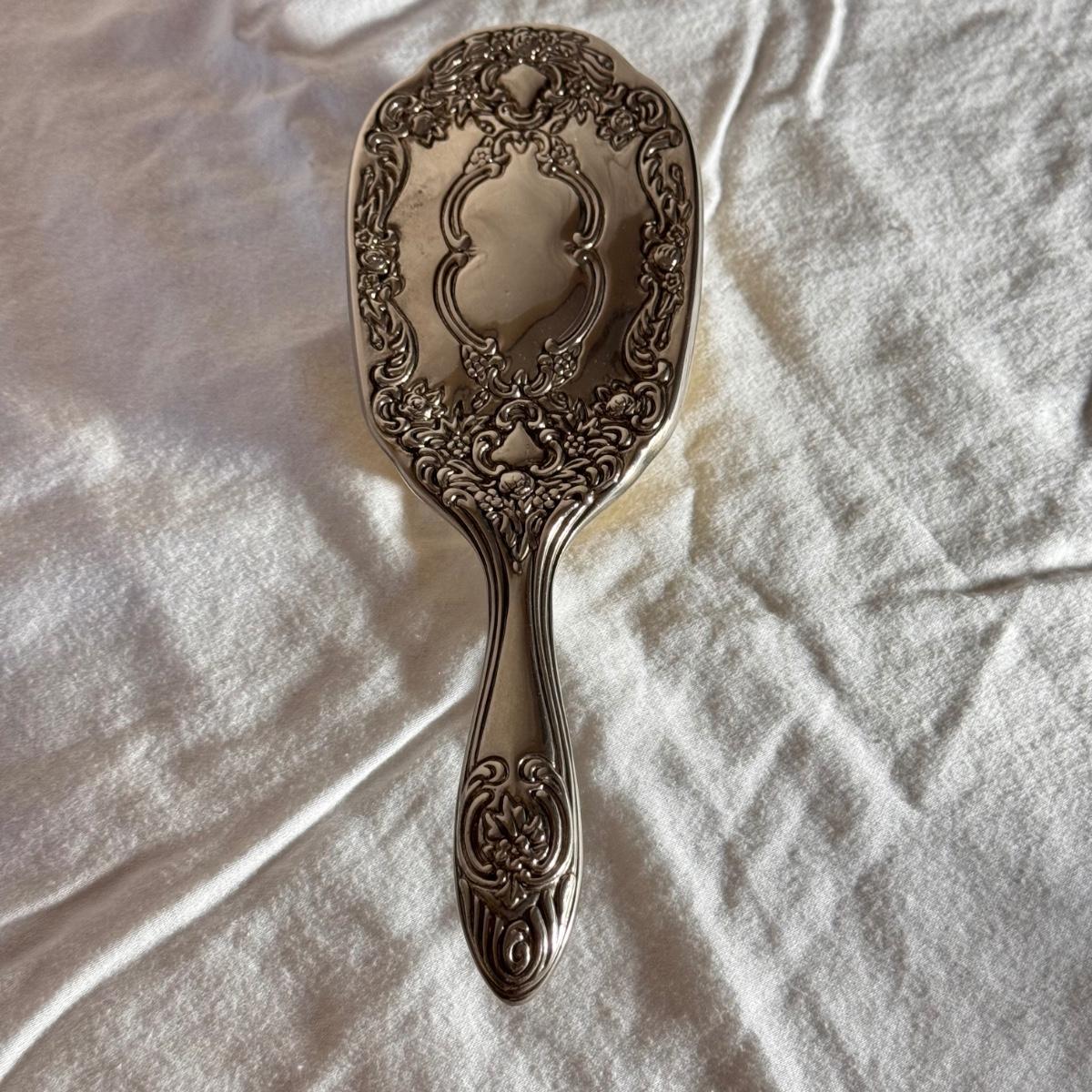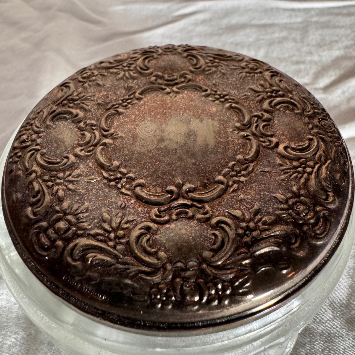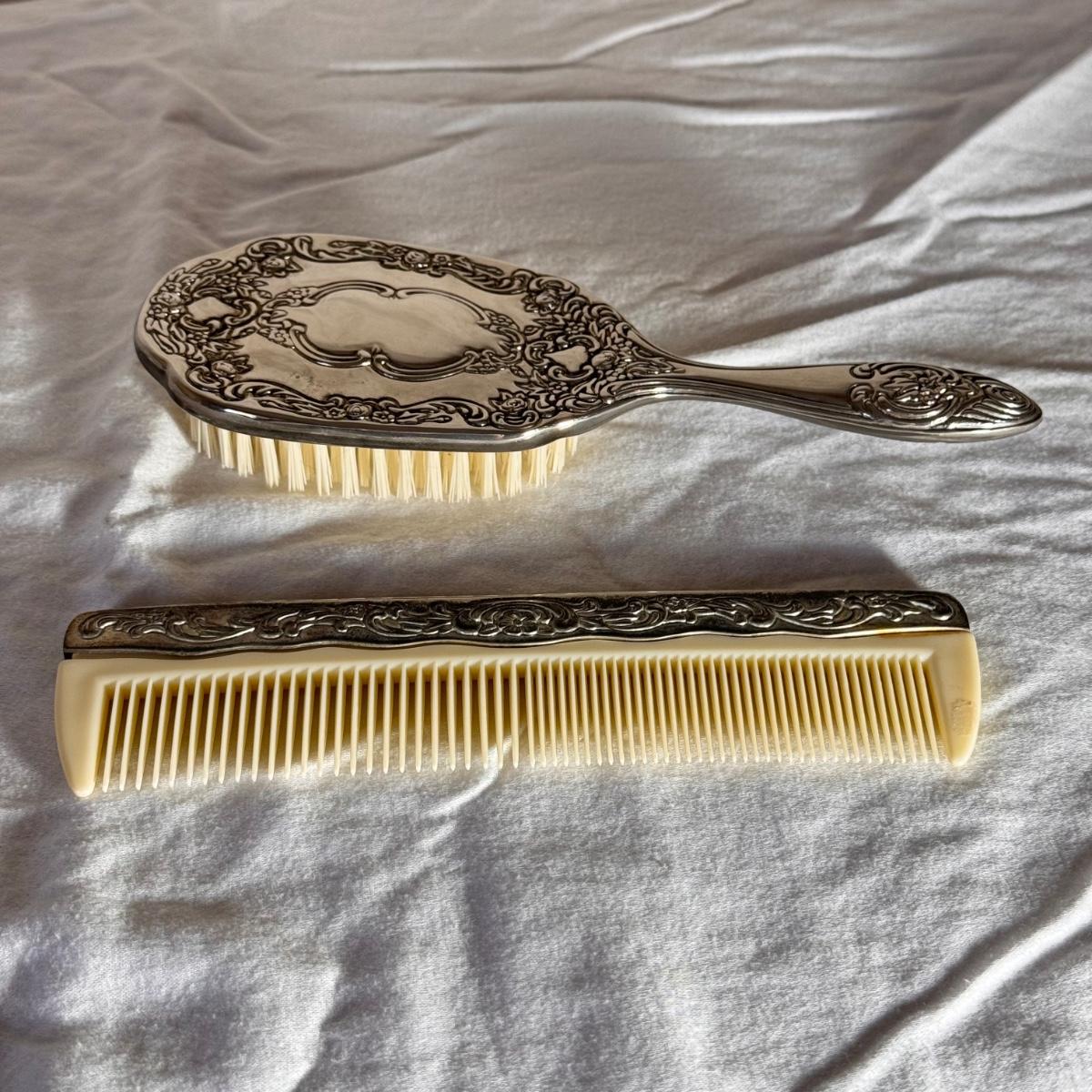 This lot includes one glass powder jar with a silver plated lid, one silver plated ornate comb and one hairbrush, one silver plated handheld mirror, and one glass perfume bottle with a removable top. The glass powdered jar’s silver plated lid has a mirror on the other side. The handheld mirror measures 5.25” x 9.5”H. Shipping available.