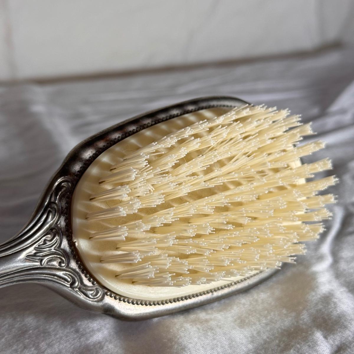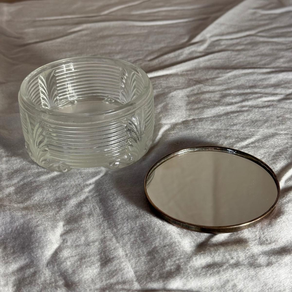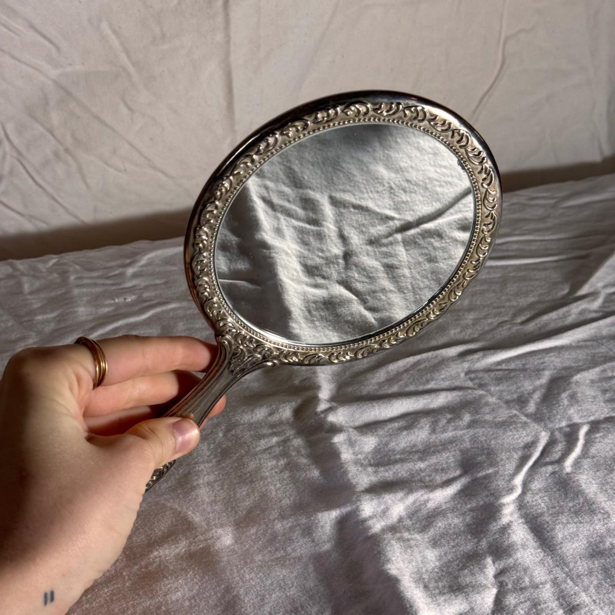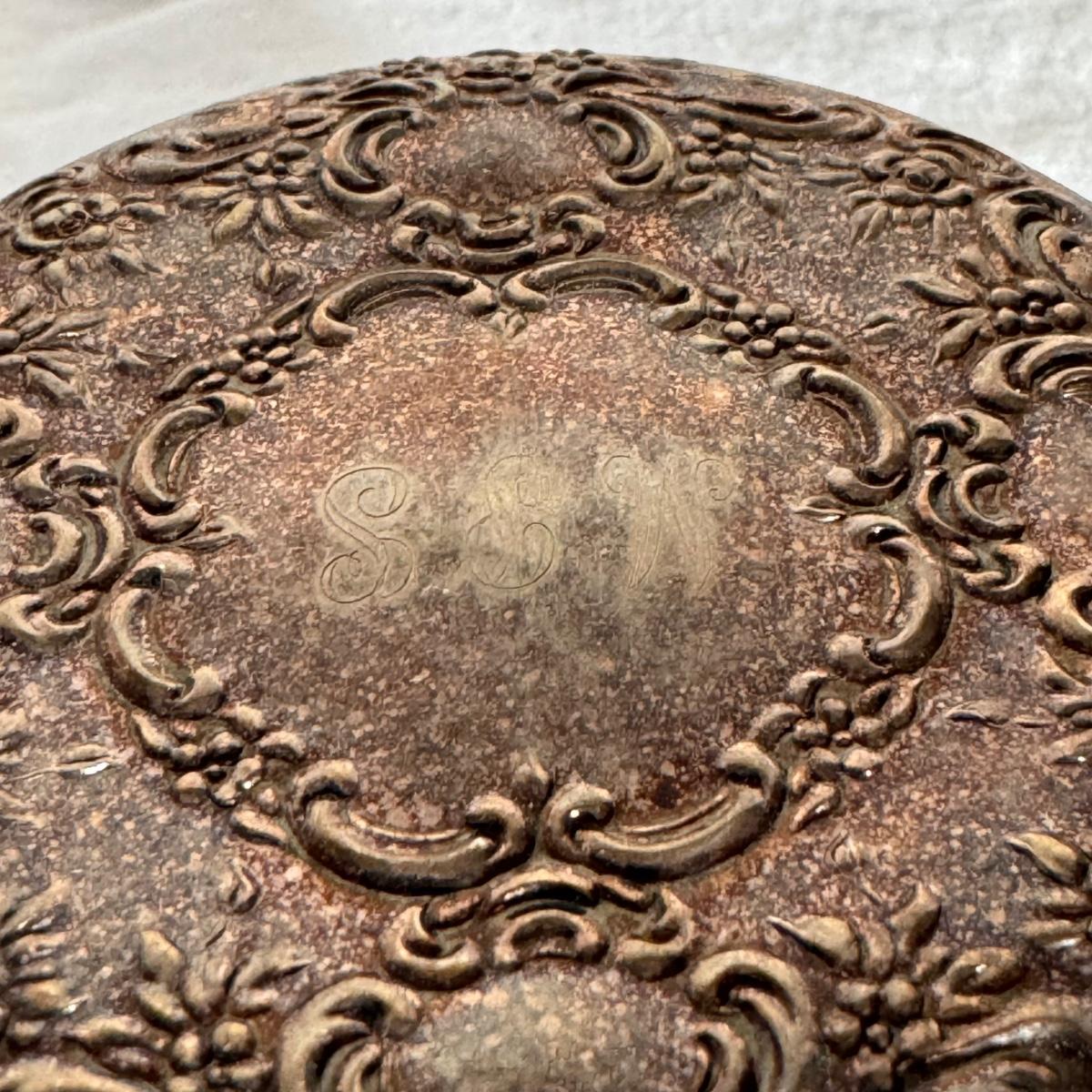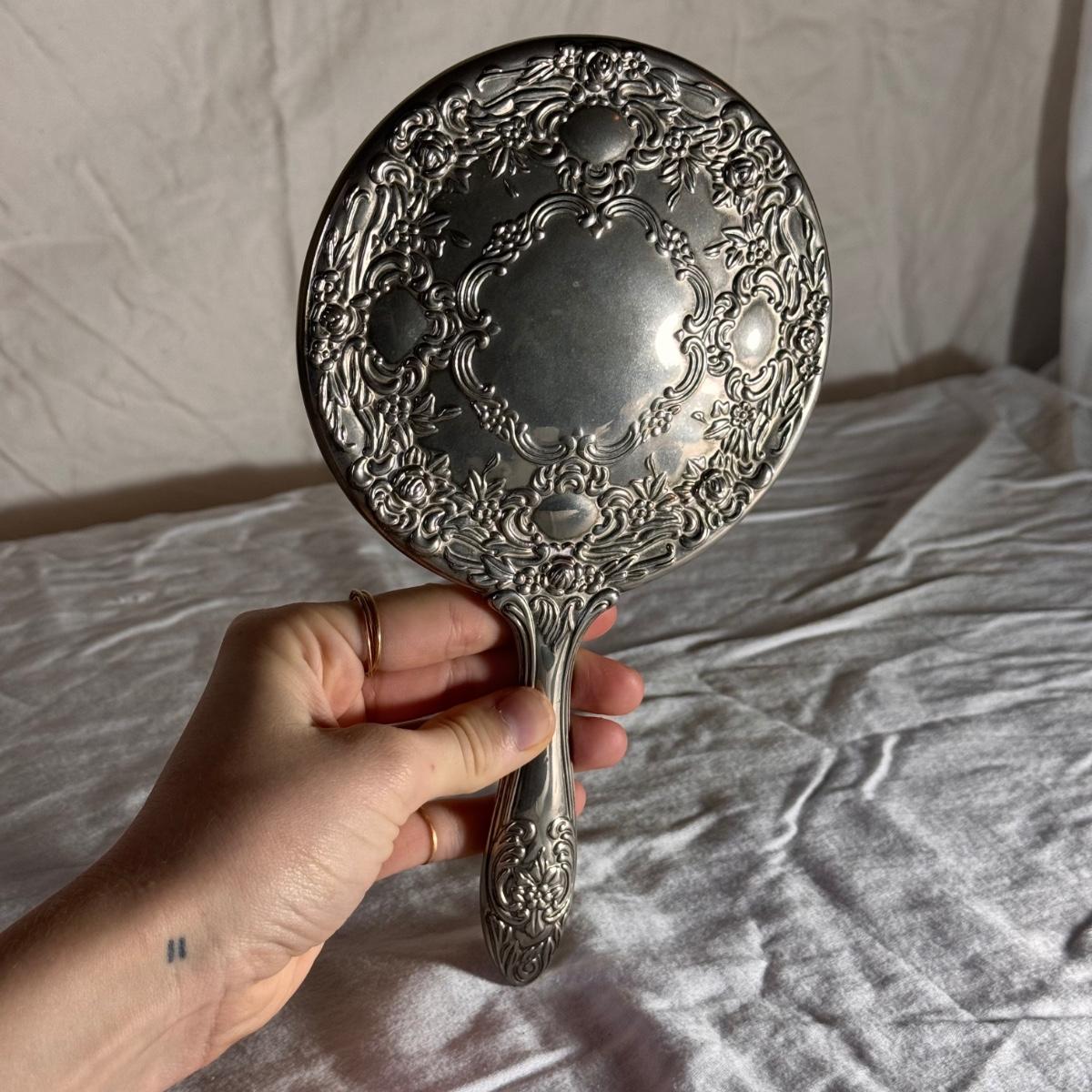 This lot includes one glass powder jar with a silver plated lid, one silver plated ornate comb and one hairbrush, one silver plated handheld mirror, and one glass perfume bottle with a removable top. The glass powdered jar’s silver plated lid has a mirror on the other side. The handheld mirror measures 5.25” x 9.5”H. Shipping available.