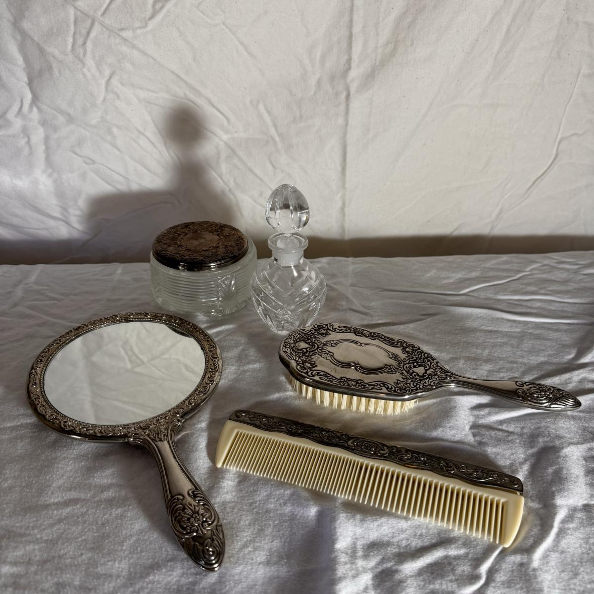 Silver Plated 4-Piece Vanity Set and Glass Perfume Bottle (PB-DZ)