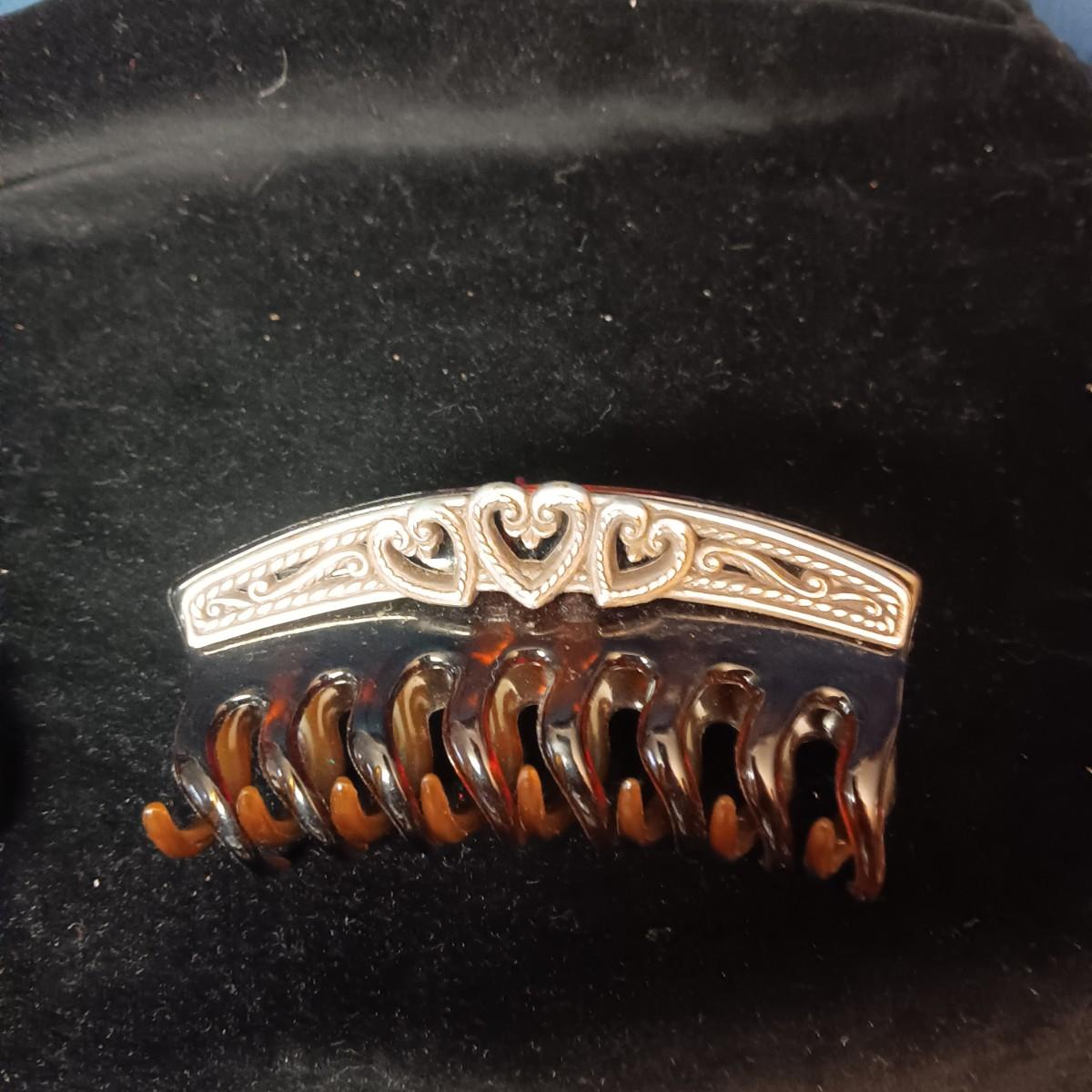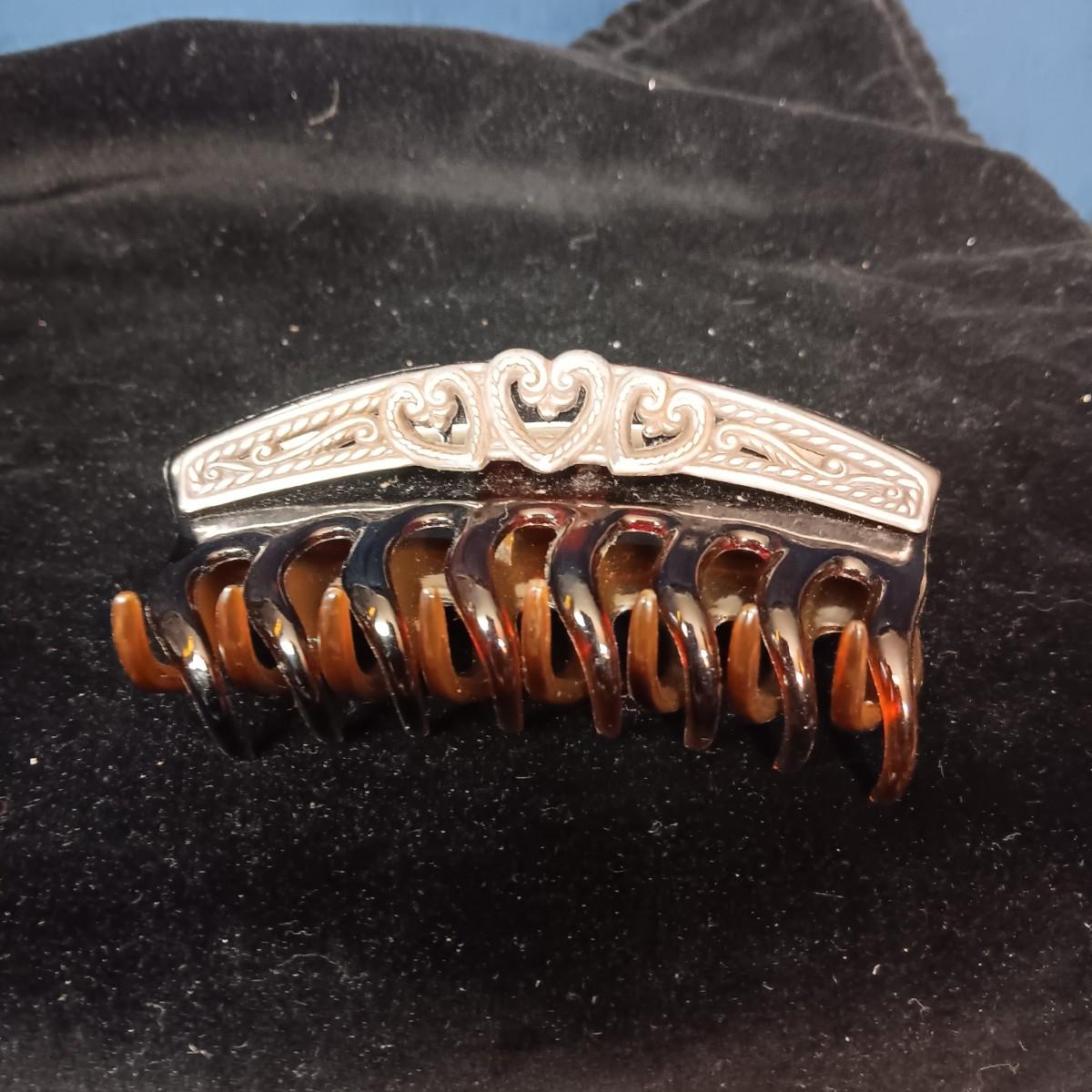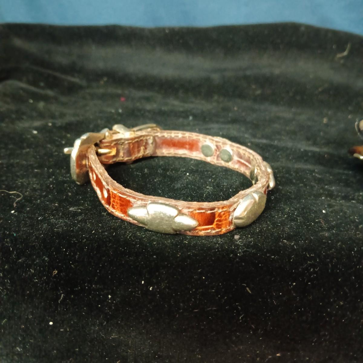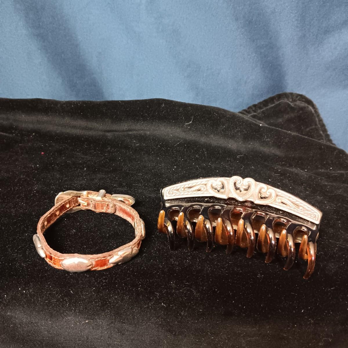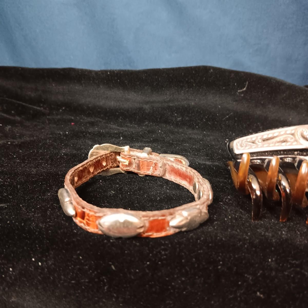 SILVER PLATED AND PLASTIC HAIR CLIP AND LEATHER BRACELET WITH METAL CONCHOS