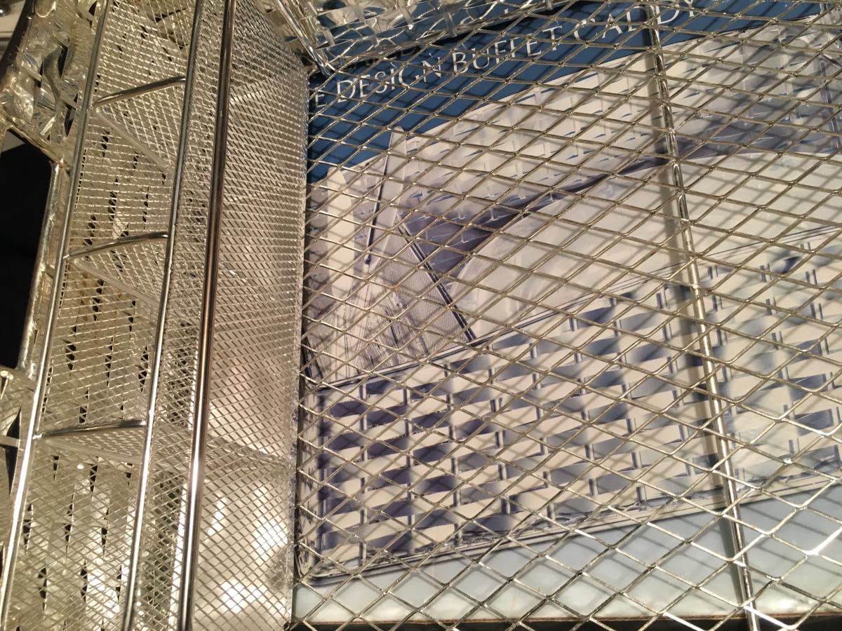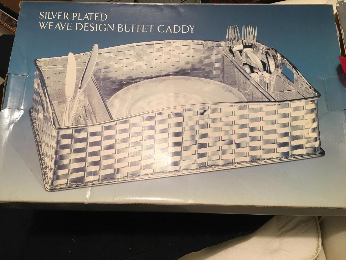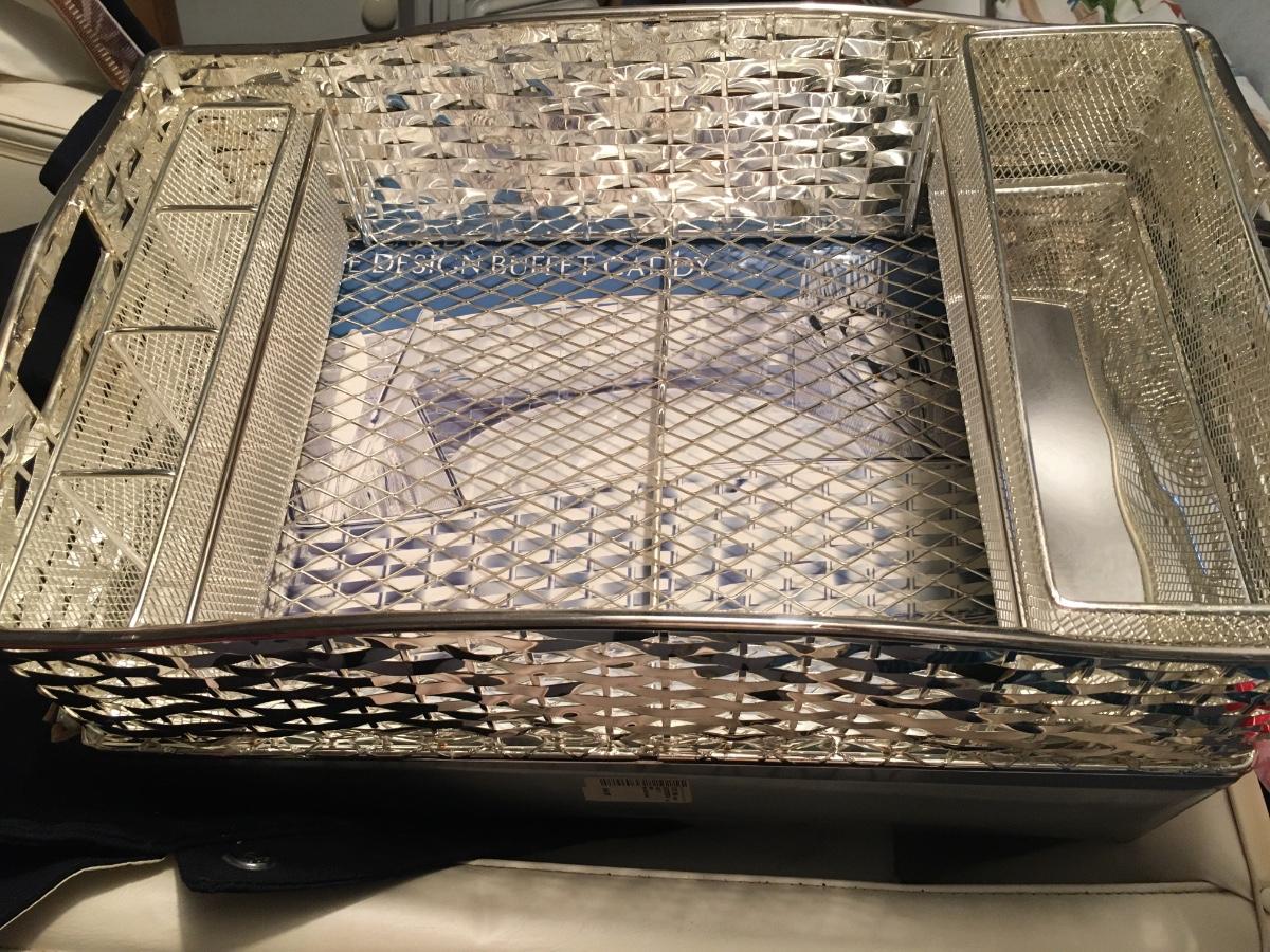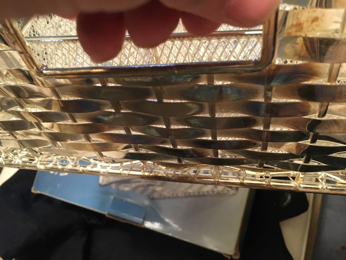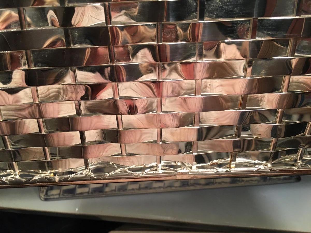 Woven metal makes this a beautiful way to set up a buffet table. Excellent condition except for some tarnish on one side.